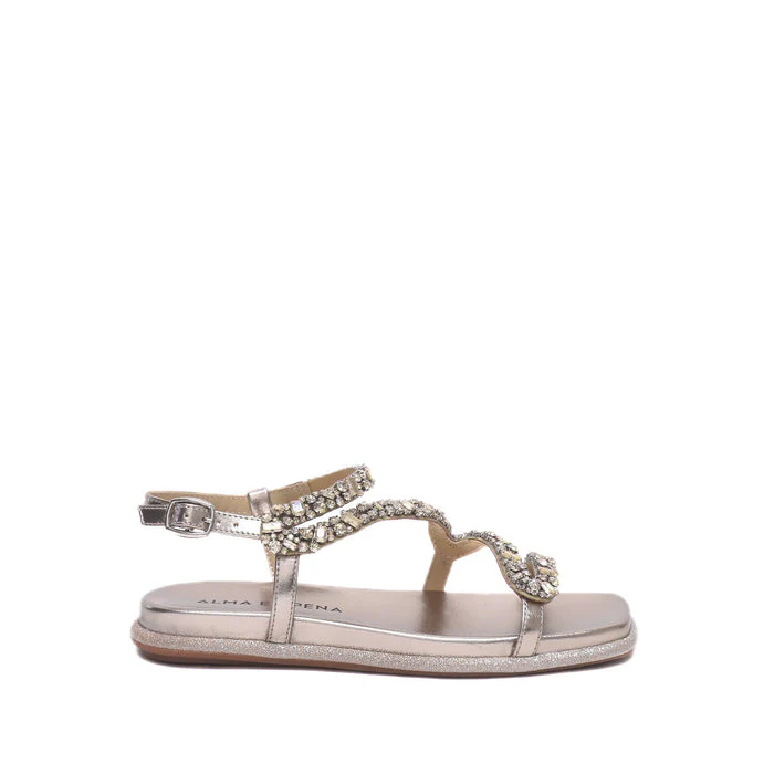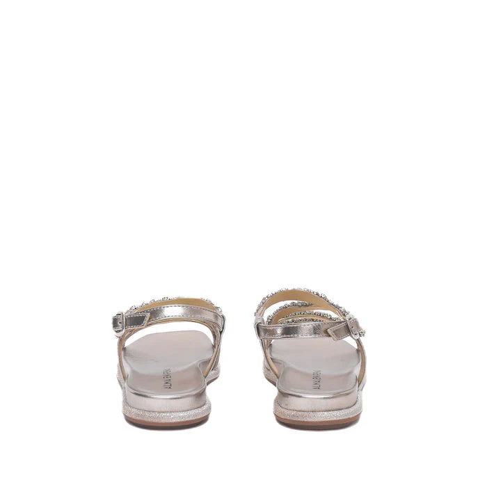 Sandalo in laminato bronzo con strass Fodera in pelleSuola in gomma con plantare FusbetCalzata regolareID Prodotto: 856 DIVA BRONZESKU: 856B