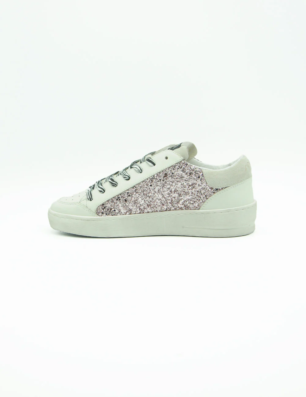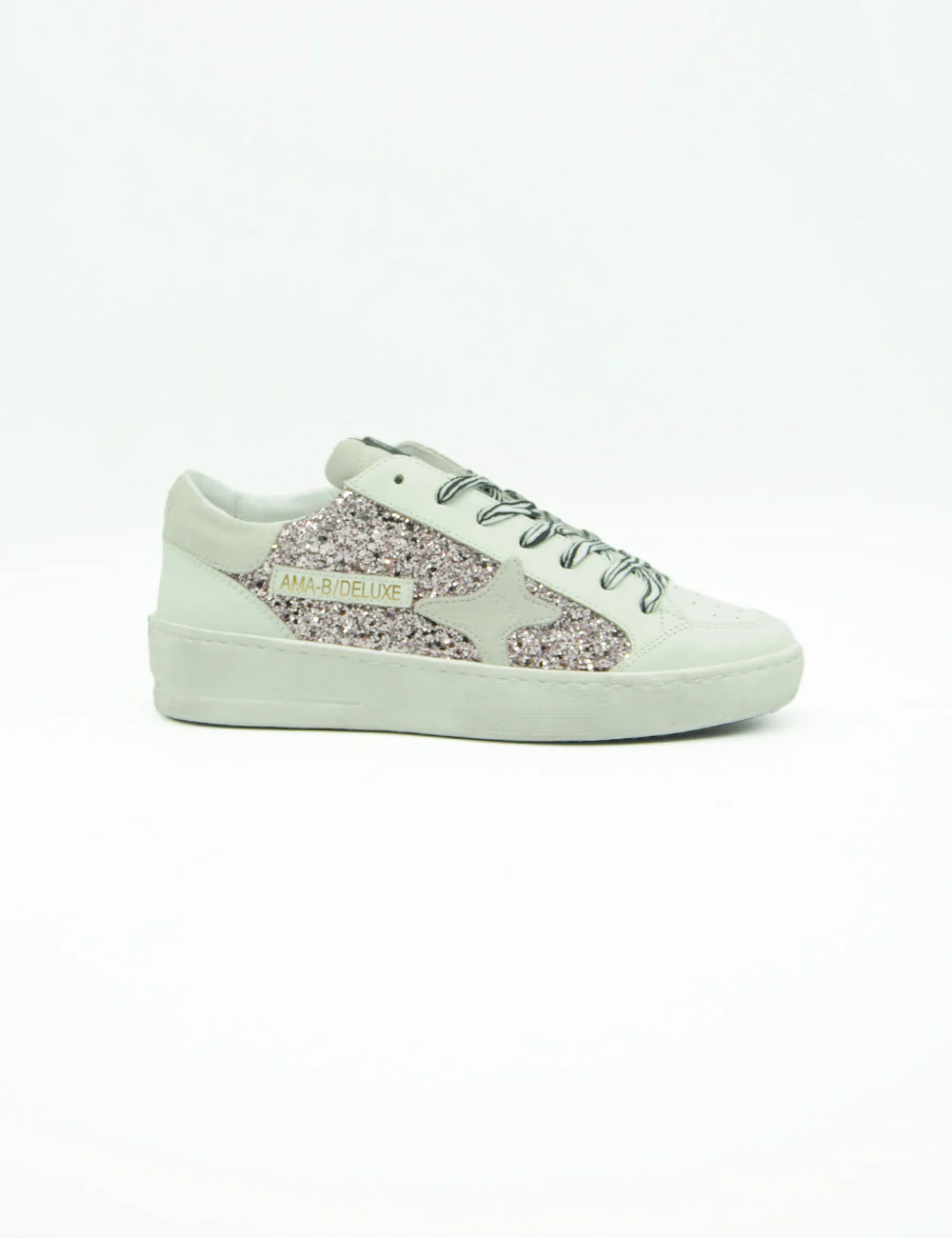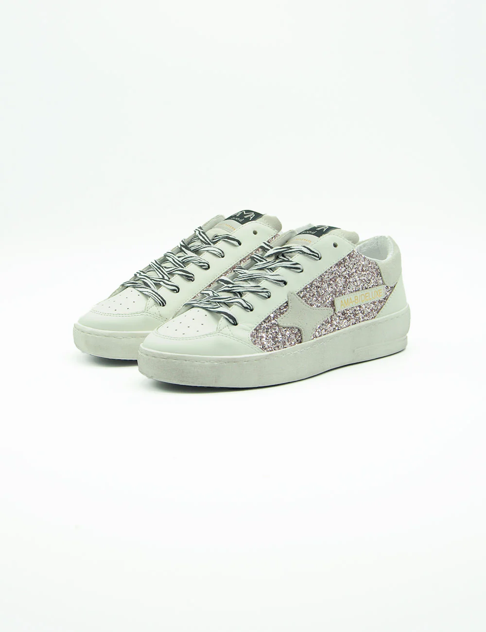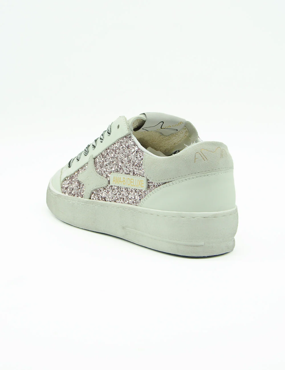Ama Brand Sneakers Glitter Pink, sneakers con tomaia in pelle rivestita di glitter rosa ed inserti in pelle suede. Toppone logato in suede.