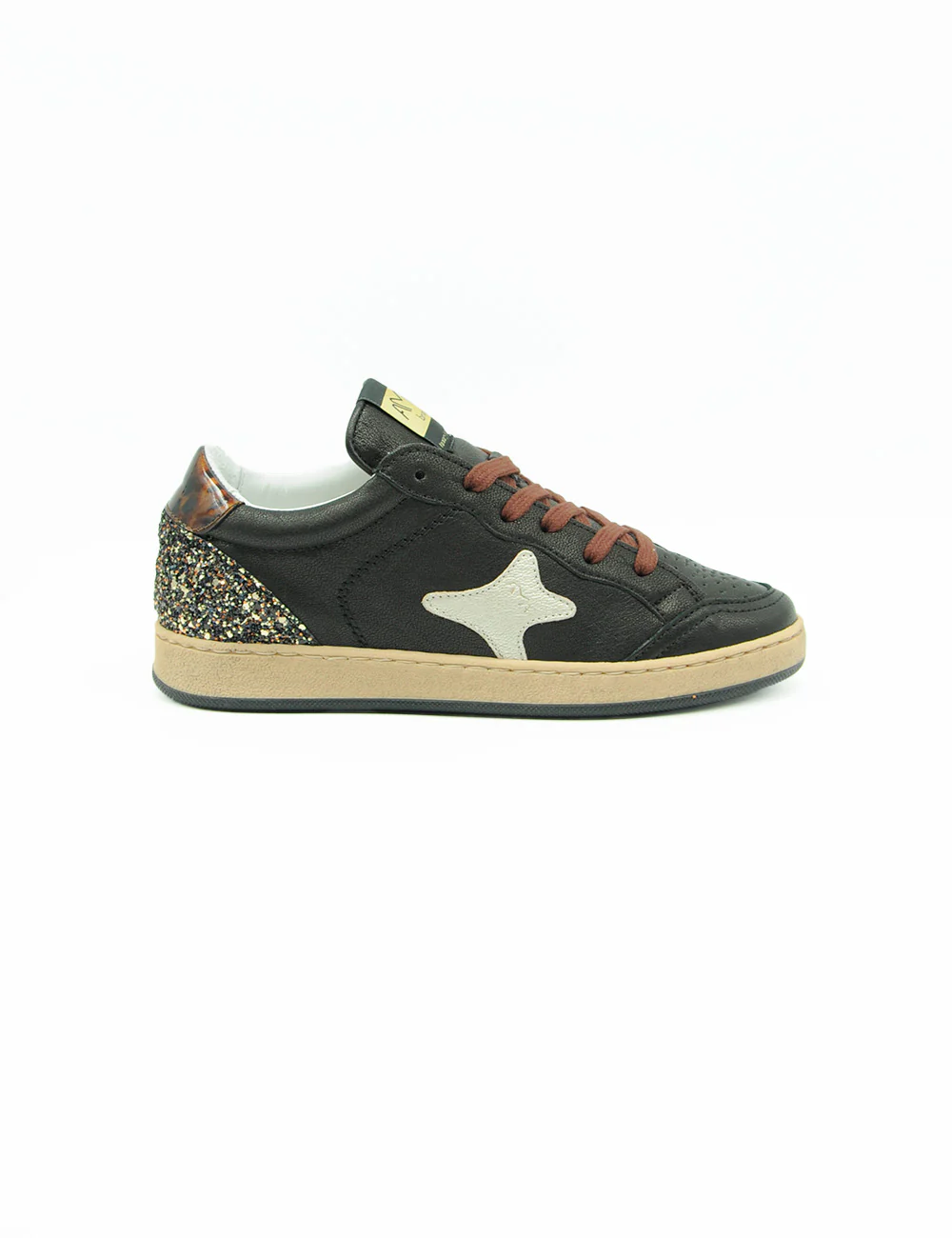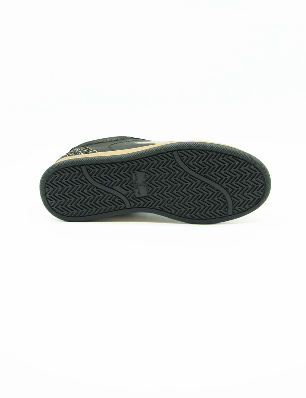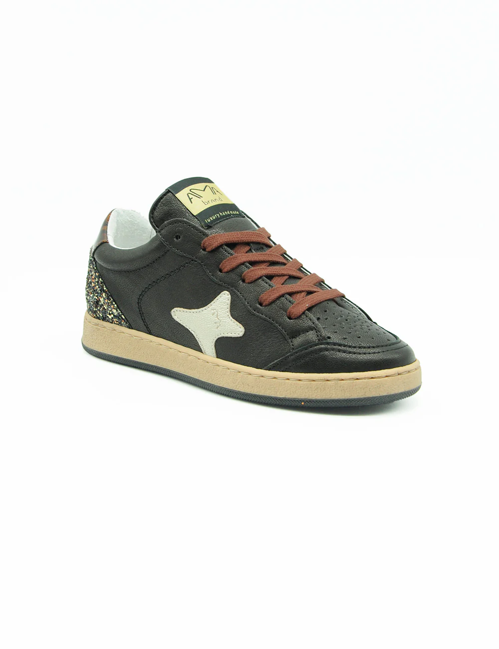 Le Ama Brand Sneakers Sun Black presentano una tomaia in pregiata nappa, arricchita da lacci e logo con dettagli in pelle scamosciata a contrasto. Il tallone รจ impreziosito da un inserto glitterato mentre la suola a cassetta garantisce stile e comoditร . Codice Prodotto: 4378