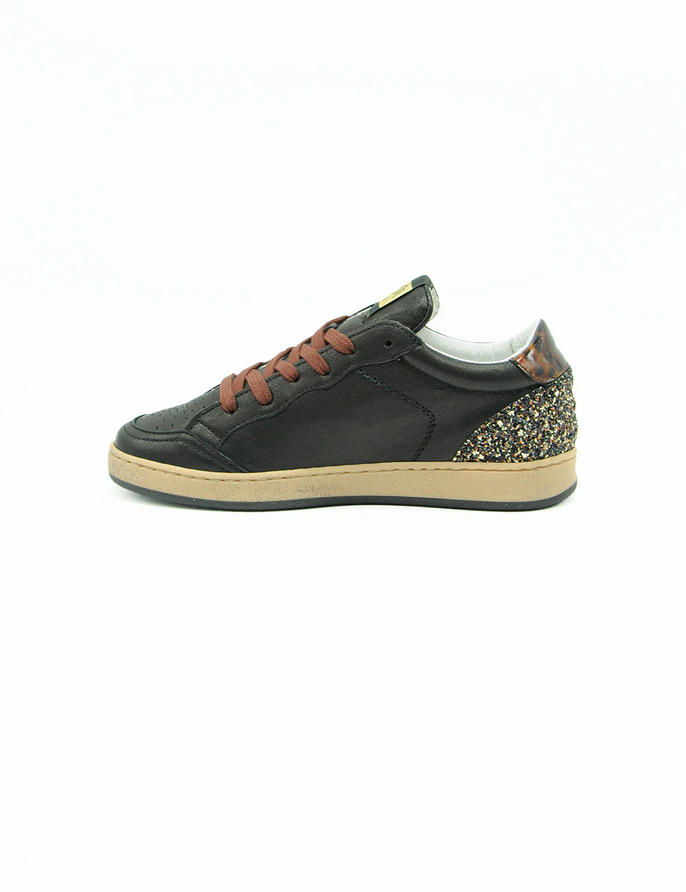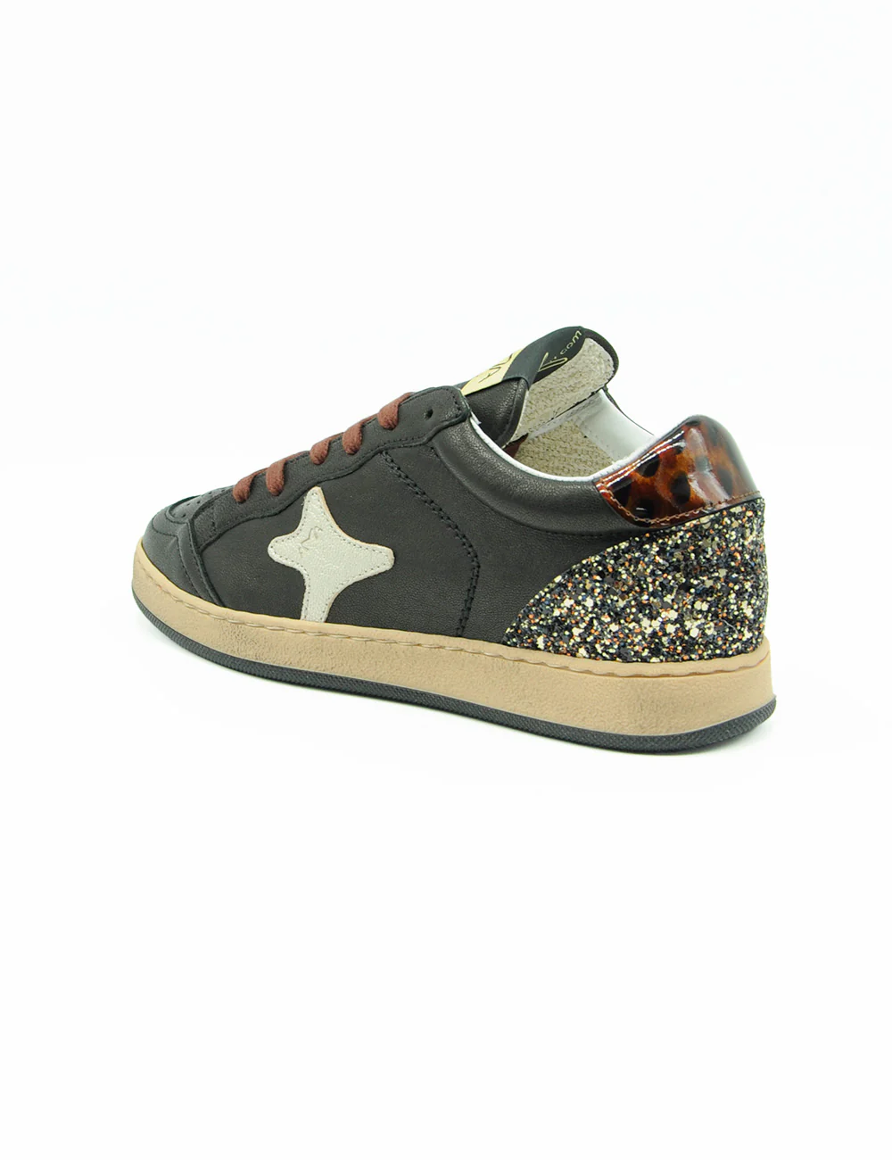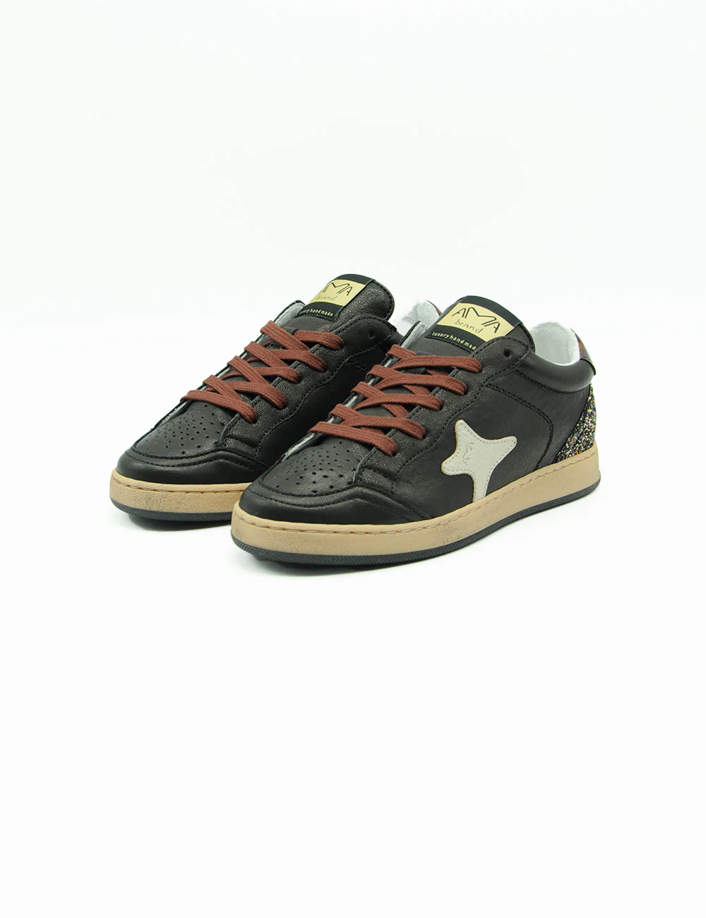 Le Ama Brand Sneakers Sun Black presentano una tomaia in pregiata nappa, arricchita da lacci e logo con dettagli in pelle scamosciata a contrasto. Il tallone รจ impreziosito da un inserto glitterato mentre la suola a cassetta garantisce stile e comoditร . Codice Prodotto: 4378