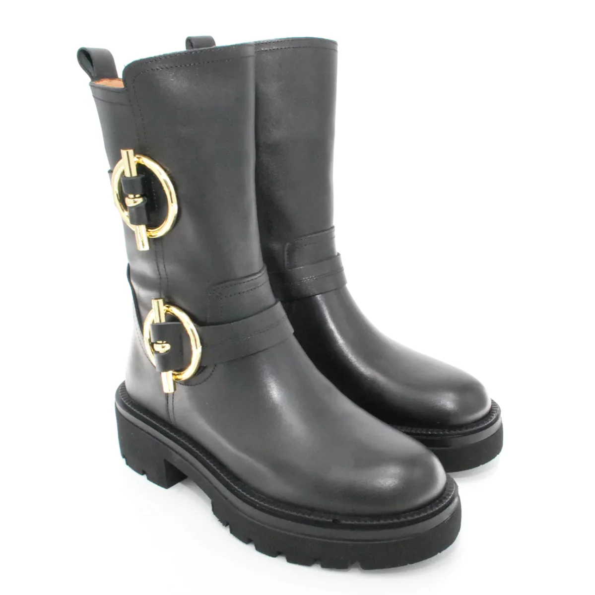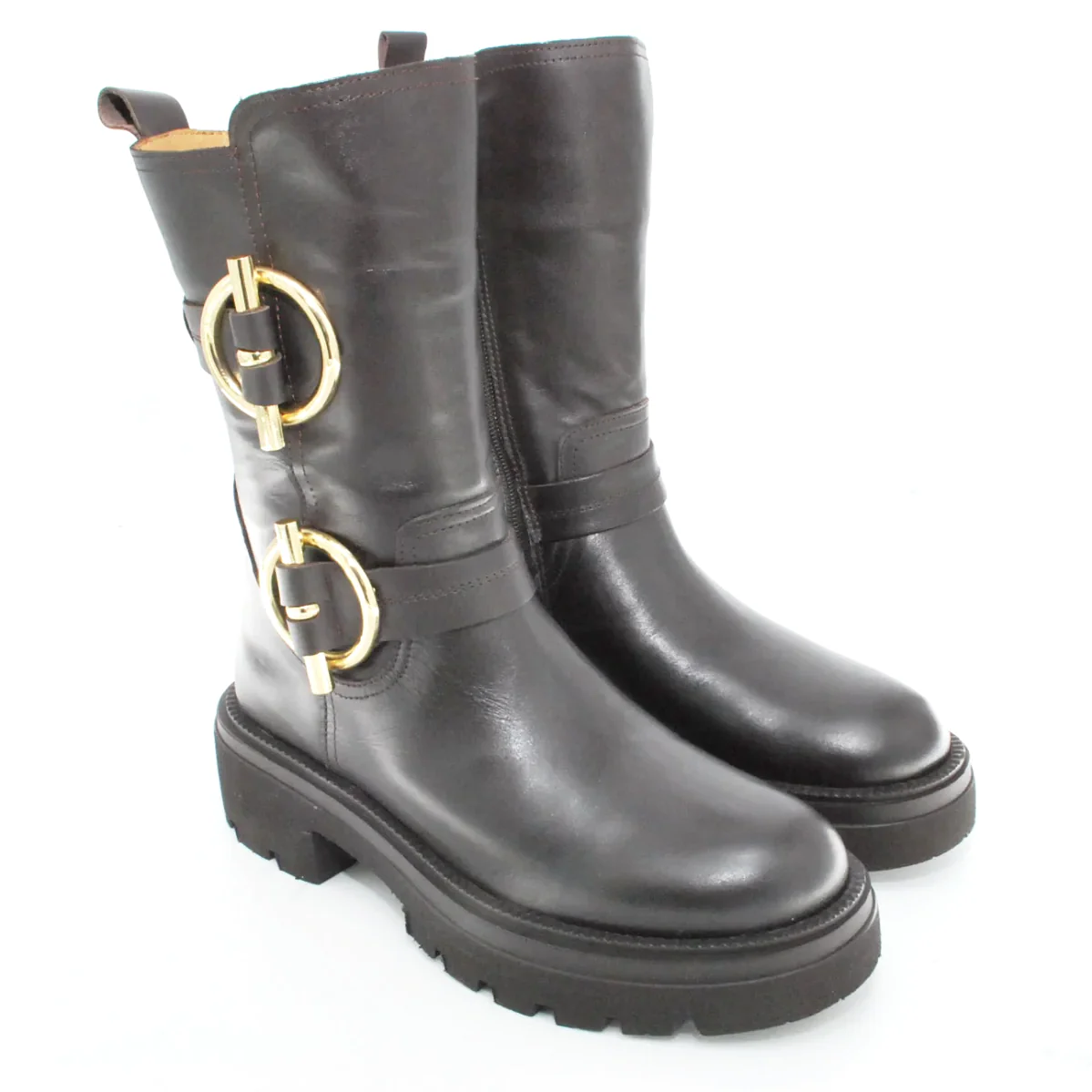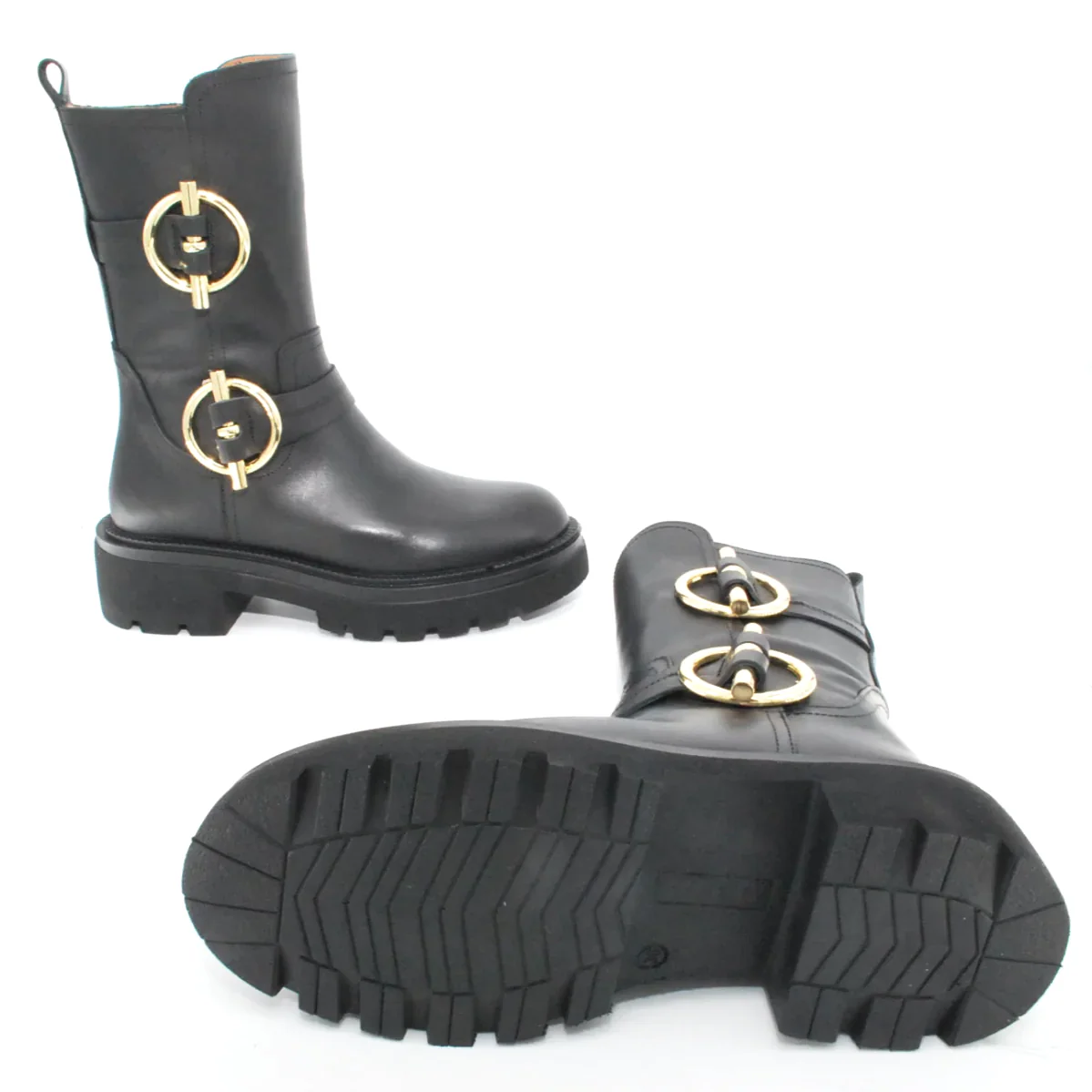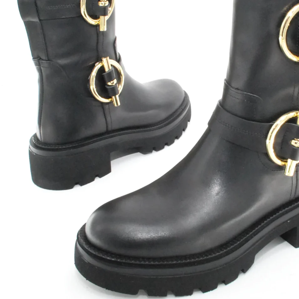 Tomaia in pelle Fodera in pelle Soletta in pelle Suola in gomma antiscivolo Cerniera laterale Applicazione fibbia dorato Altezza tacco 50 mm Altezza gambale 28 Qualitร Artigianale Italiana