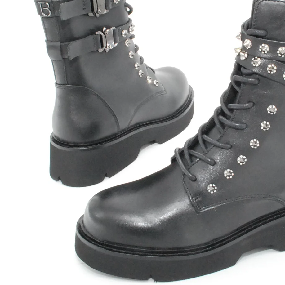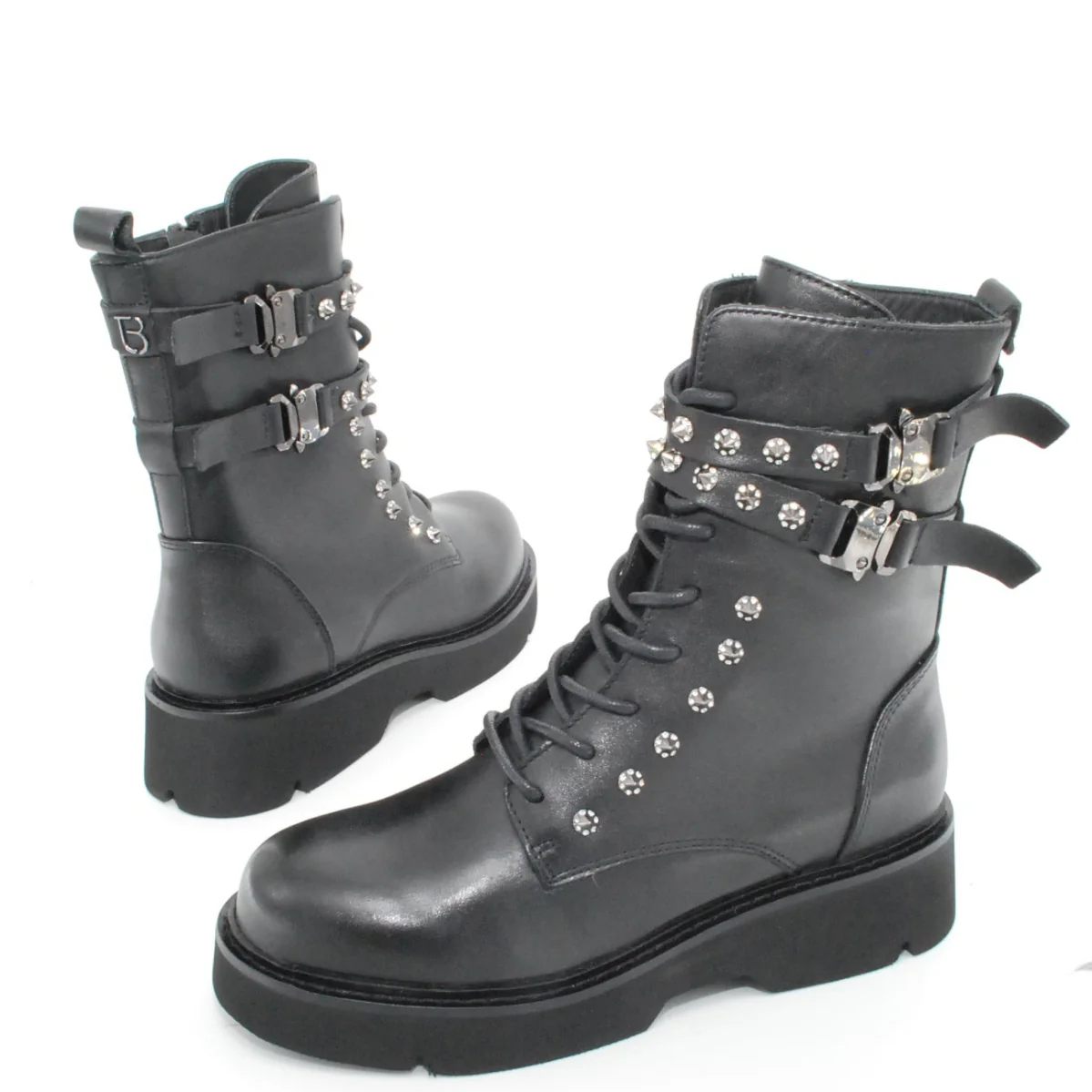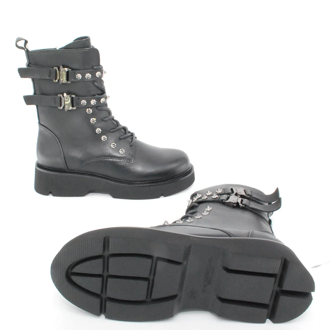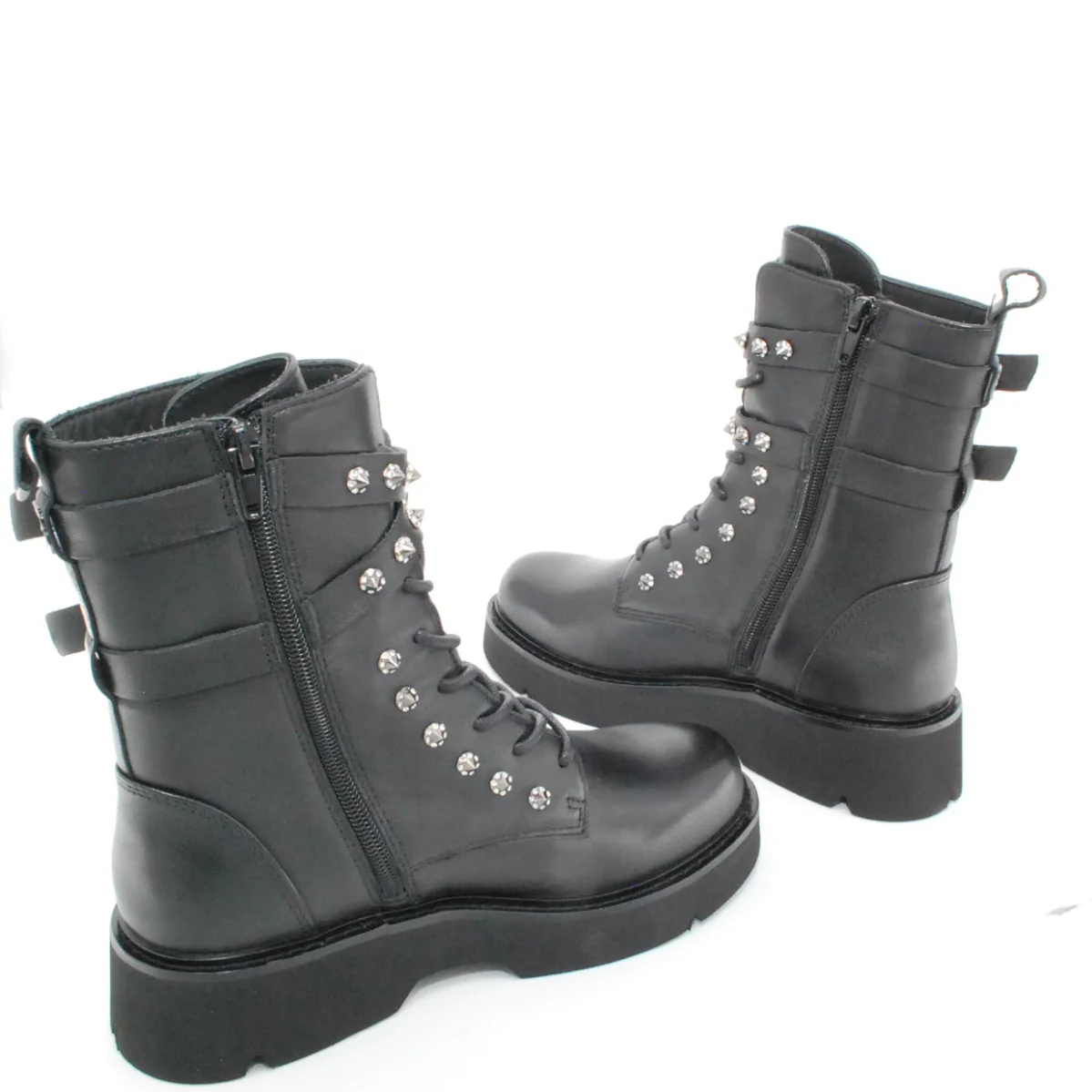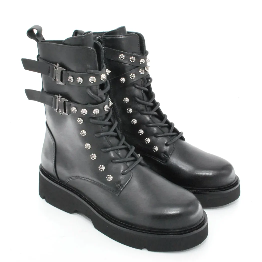 Tomaia in pelle Fodera in pelle Soletta in pelle Cerniera laterale Applicazione borchie Suola in gomma antiscivolo Altezza tacco 50 mm Altezza gambale 18 cm