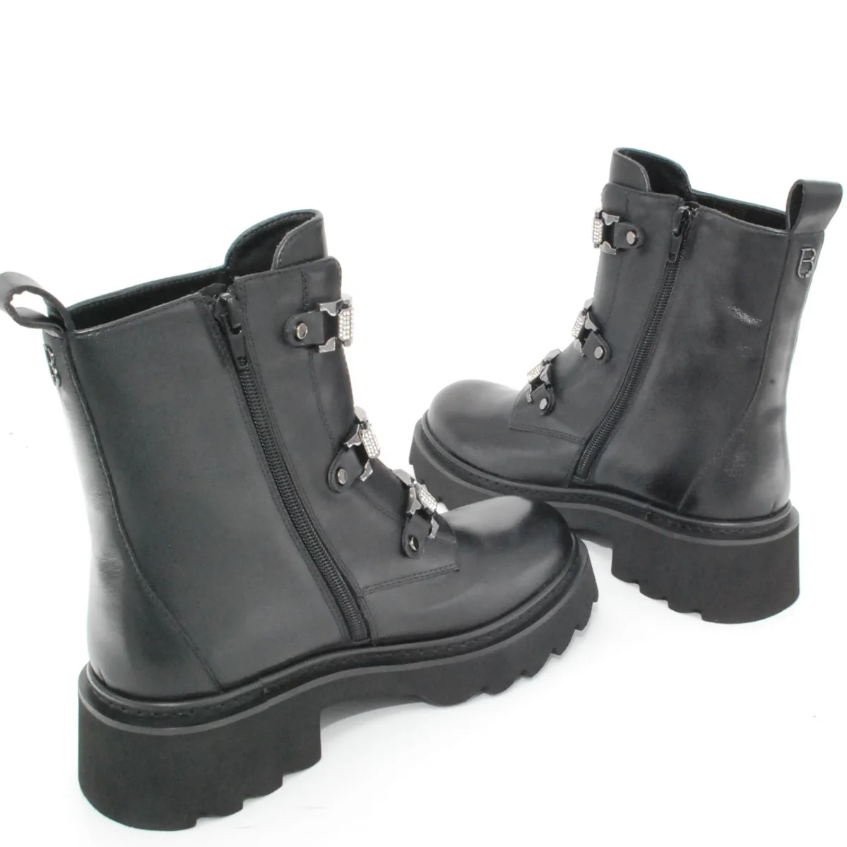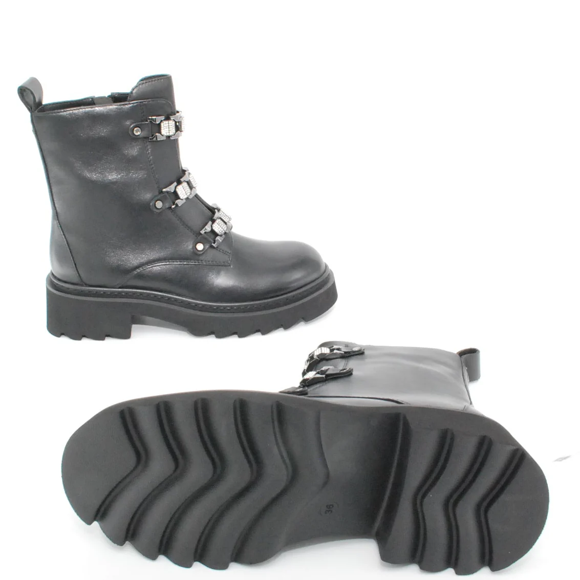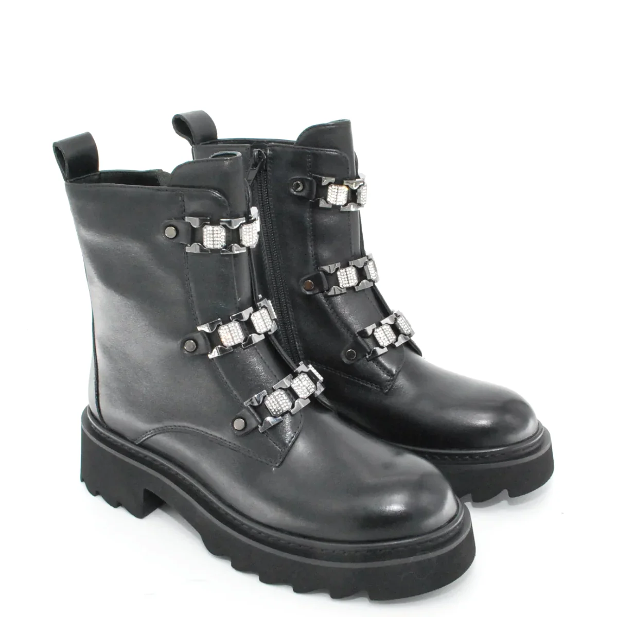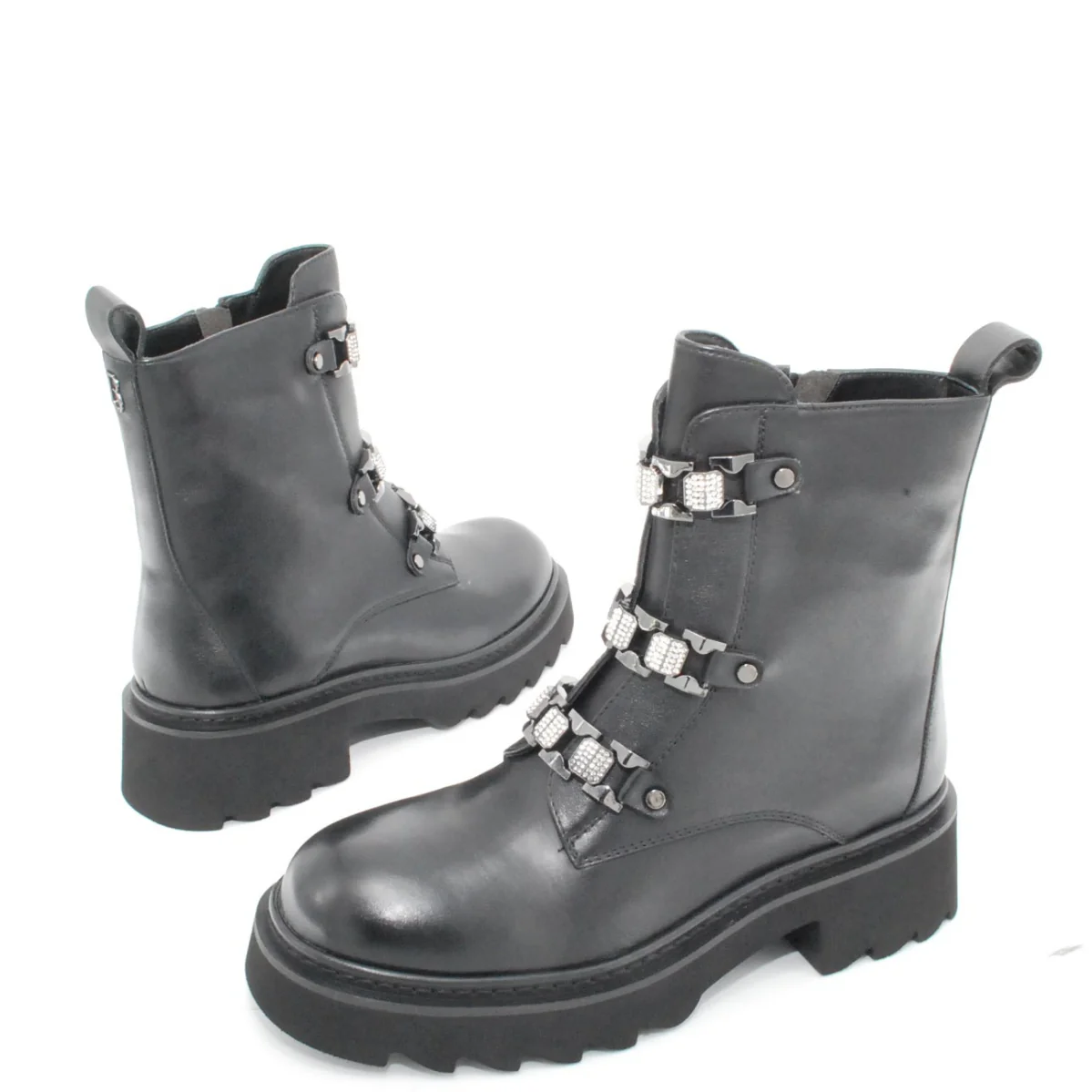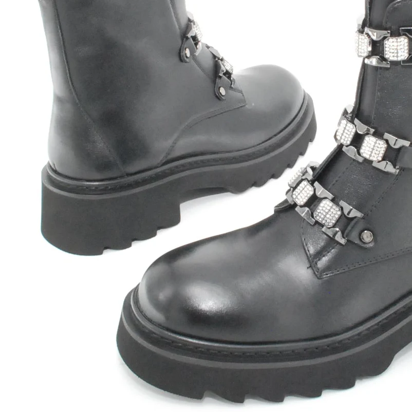 Tomaia in pelle Fodera in pelle Soletta in pelle Cerniera laterale Applicazione moschettone con strass Suola in gomma antiscivolo Altezza tacco 50 mm Altezza gambale 15 cm