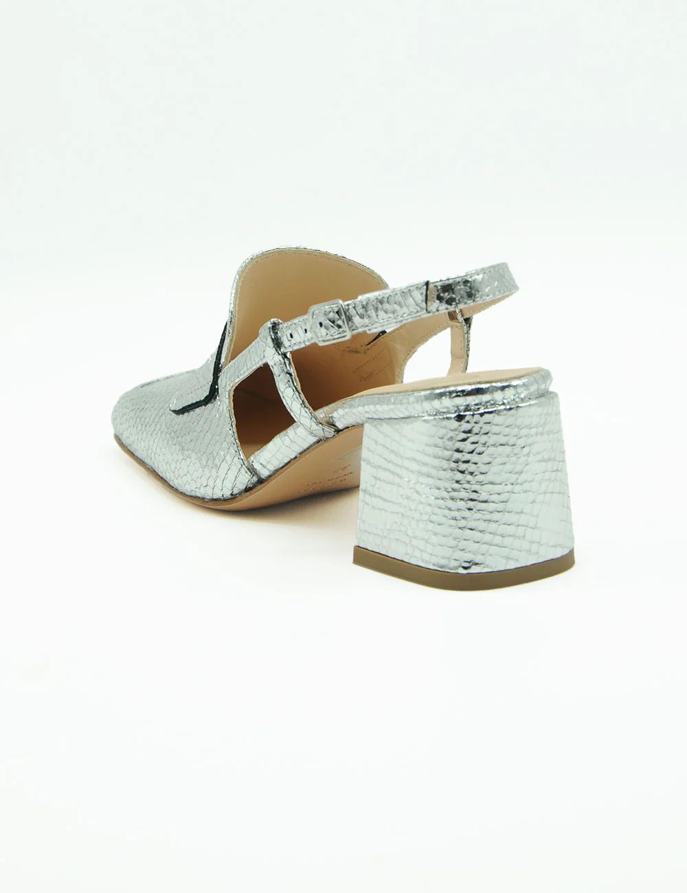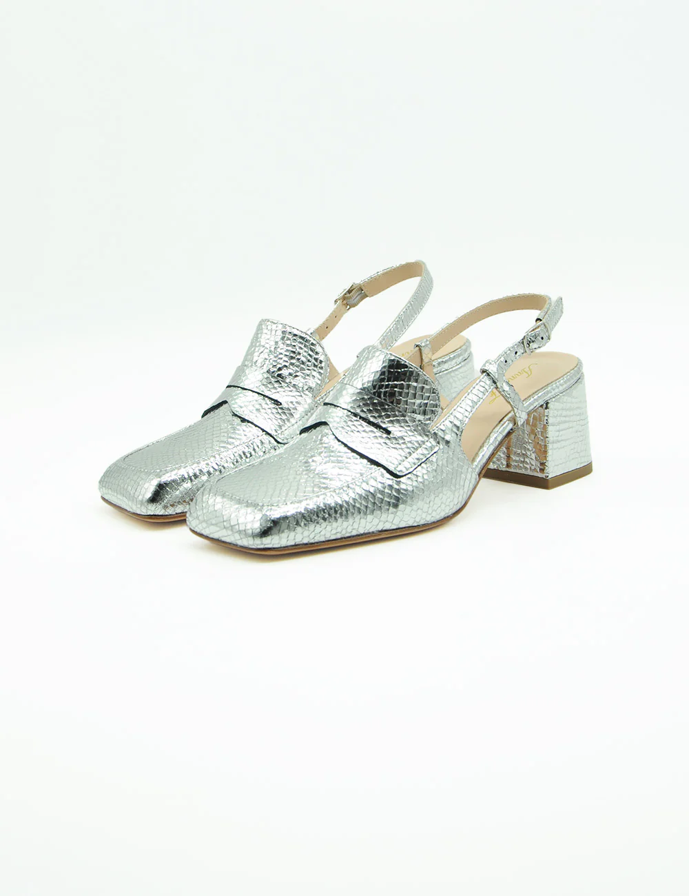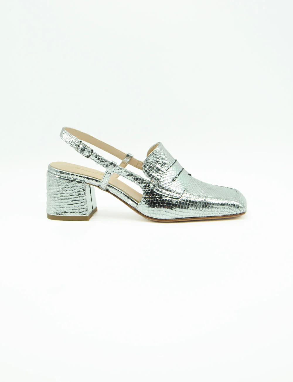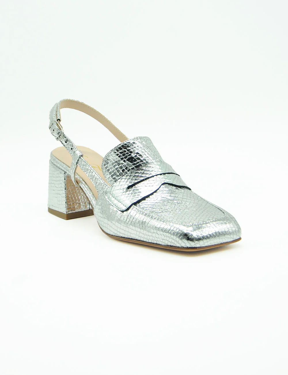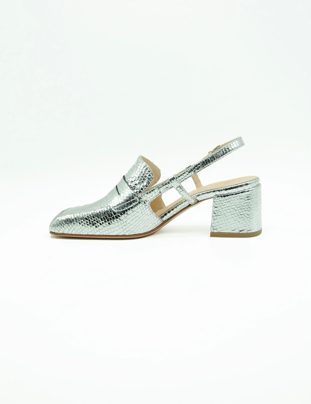 Anna F. Mocassino Whips Argento, mocassino in formato sabot realizzato in pelle laminata con stampa effetto pitone. Cinturino con elastico a scomparsa e fibbia alla caviglia. Morbido sottopiede in pelle. Tacco rivestito e fondo in vero cuoio.