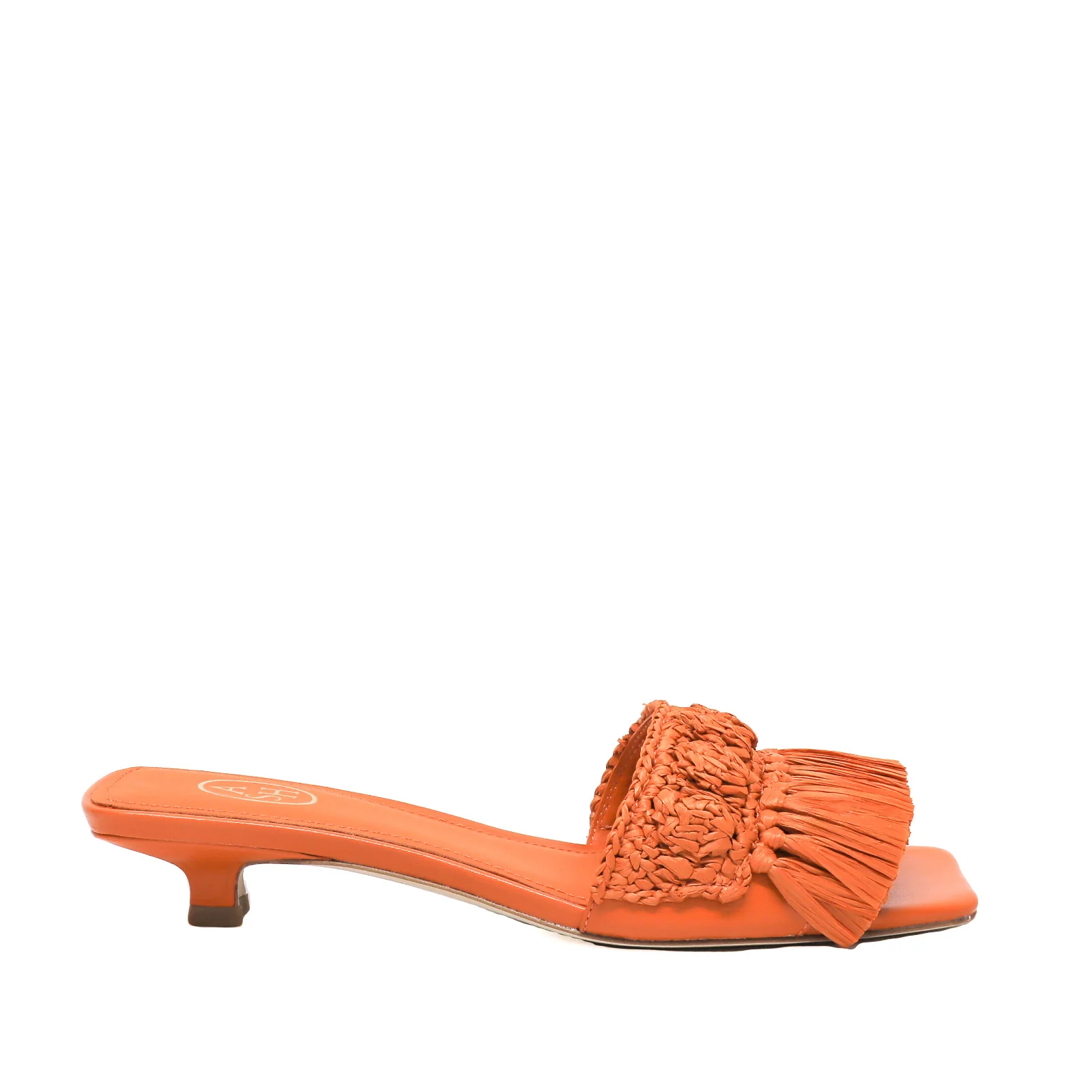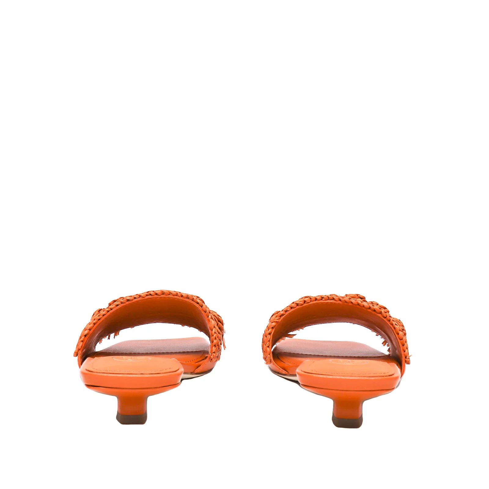 Ciabatta in pelle arancione, tomaia con intreccio e nappine in rafia. Punta aperta squadrata