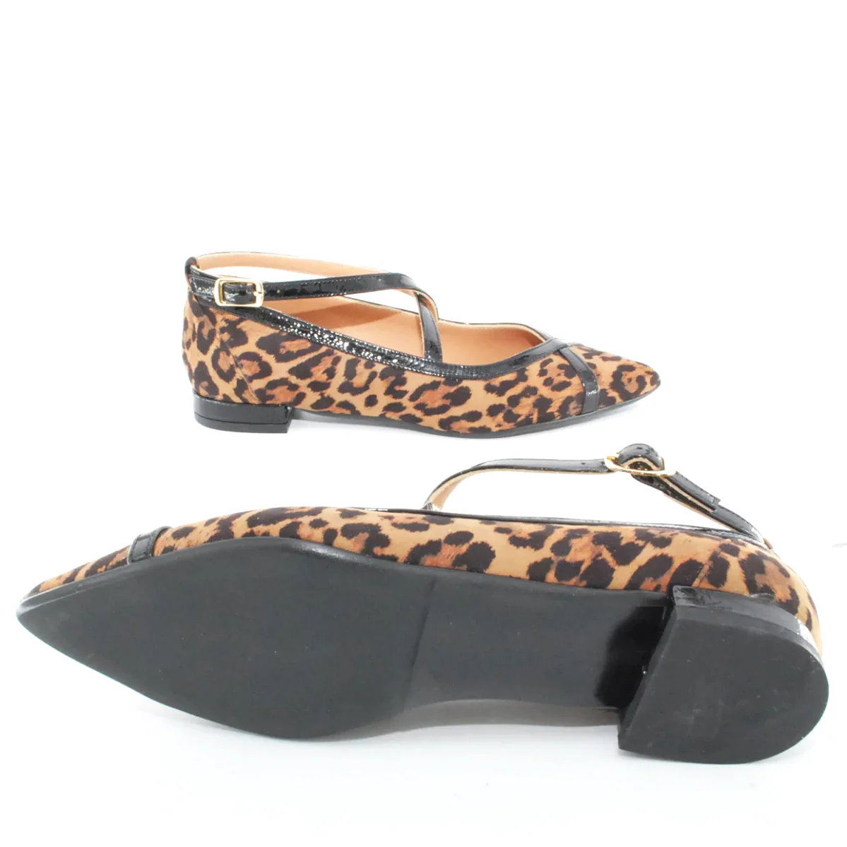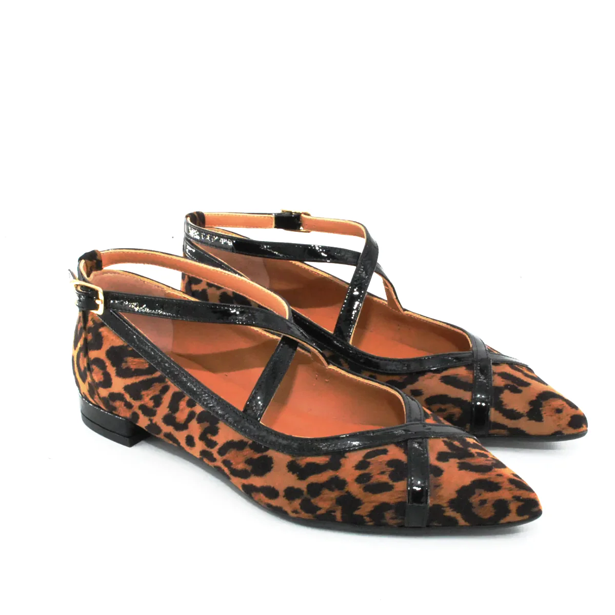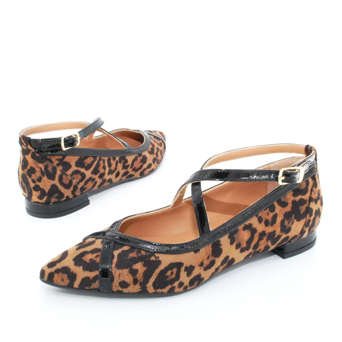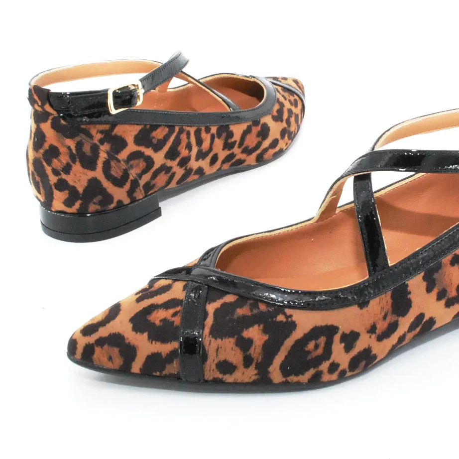 Tomaia in camoscio stampa leopard Fodera in pelle Soletta in pelle Suola in cuoio gomma antiscivolo Tacco rivestito in pelle Cinturino regolabile con fibbia Altezza tacco 20 mm Sotto tacco in gomma Qualitร Artigianale Italiana