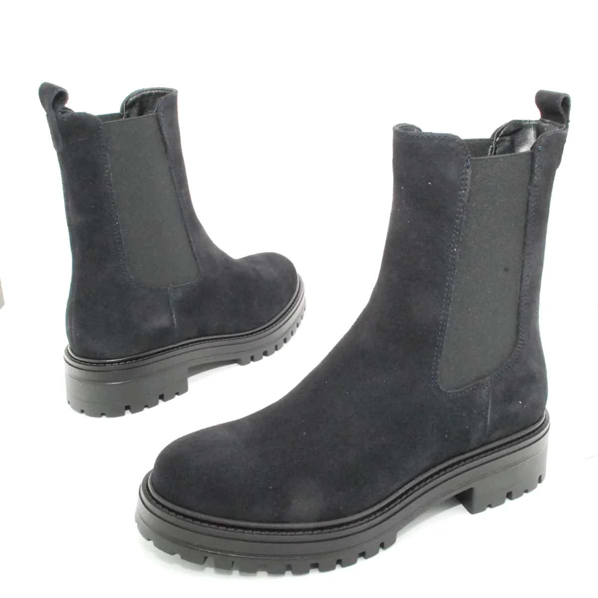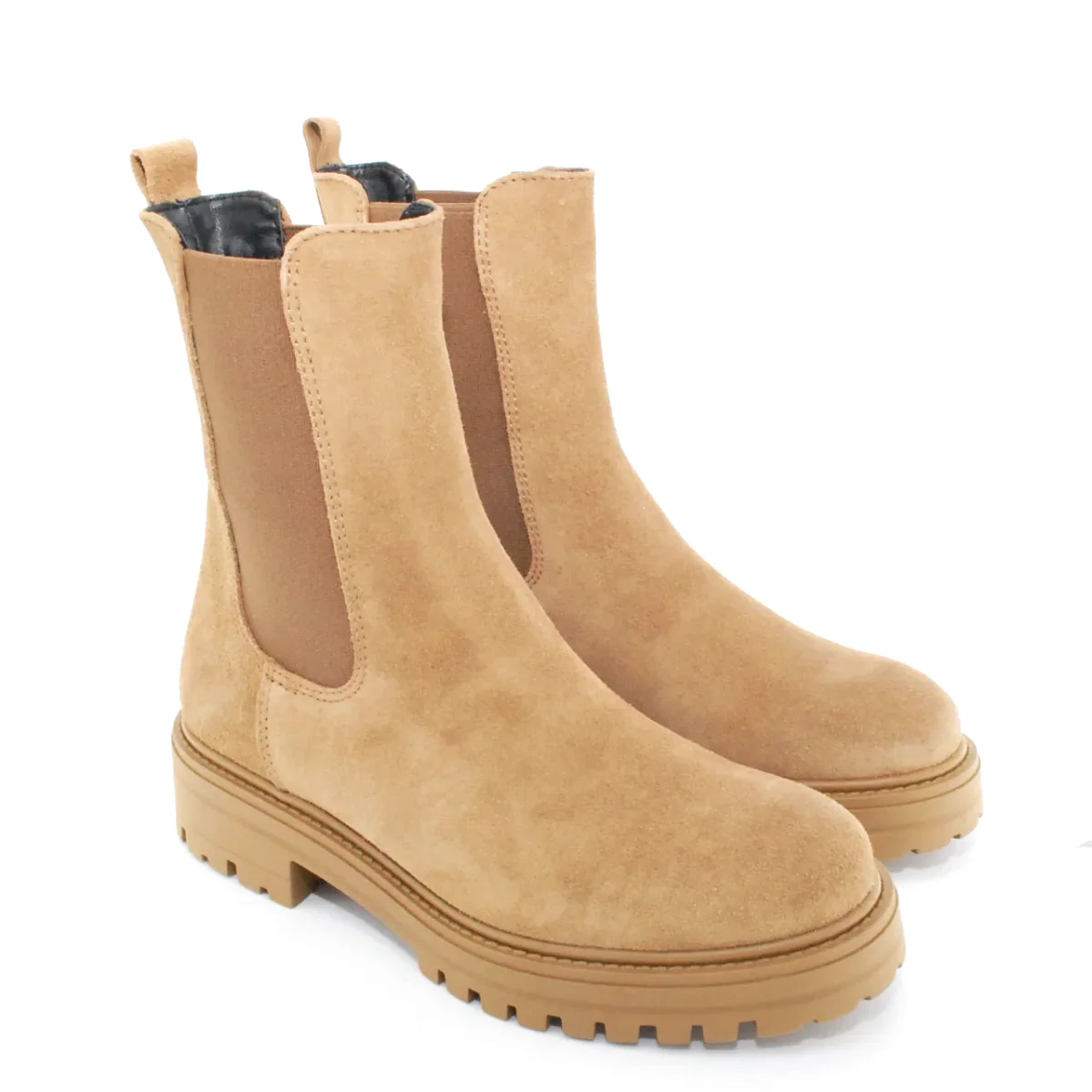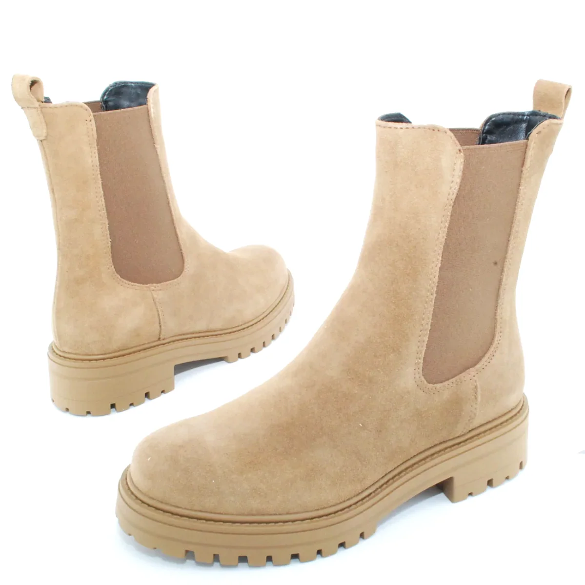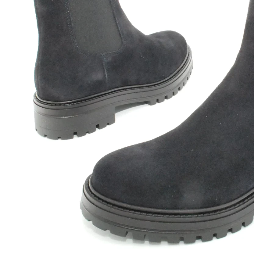 Tomaia in camoscio Fodera in pelle Soletta in pelle Suola in gomma antiscivolo Elastici laterali Altezza tacco 45 mm Altezza gambale 18 cm Qualitร Artigianale Italiana