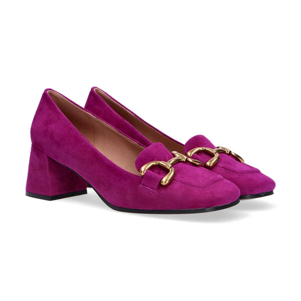 Decollete in camoscio viola ciclamino con morsetto oro opacoFodera in pelleSuola in gommaTacco 6 cmCalzata regolareID Prodotto : 573Z30W VALENCIA MORADOSKU : 573M