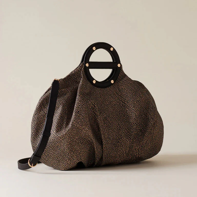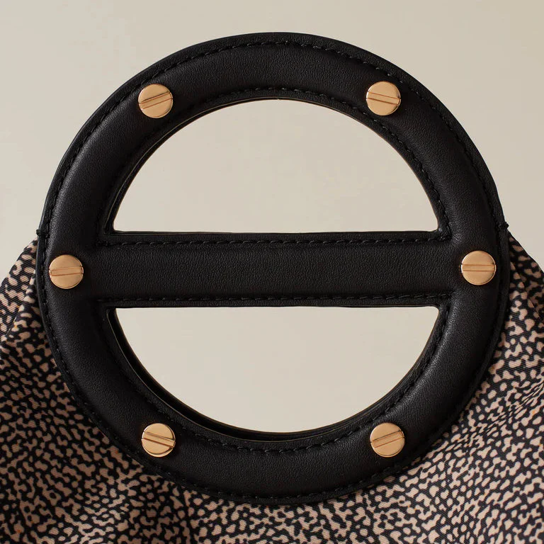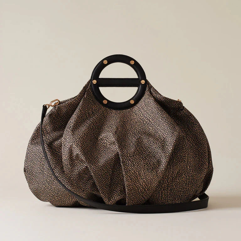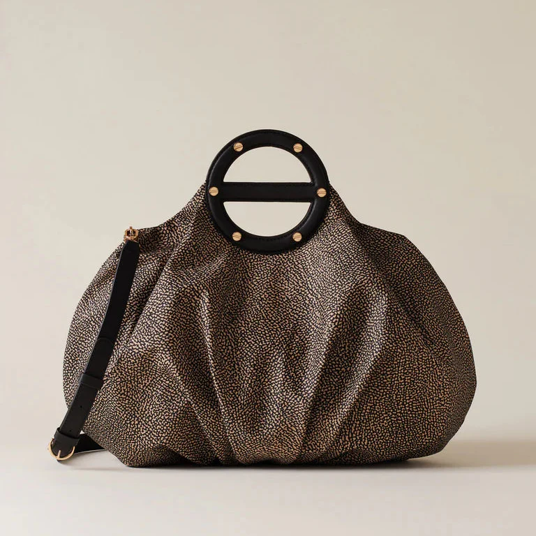 Tessuto riciclato stampa op Dettagli in vitello Fodera in tessuto Chiusura con calamita invisibile Maniglia in pelle a forma di vite Tracolla in vitello regolabile con fibbia e removibile con moschettoni logati Una tasca interna chiusa con zip e tirazip vite Metallerie oro chiaro opaco Applicazioni: dettagli in metallo dorato Altezza: 25 cm Larghezza: 45 […]