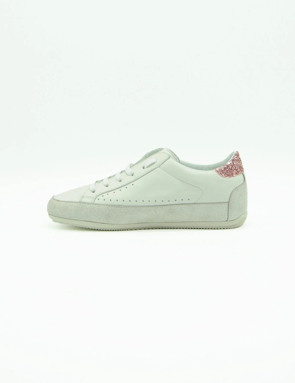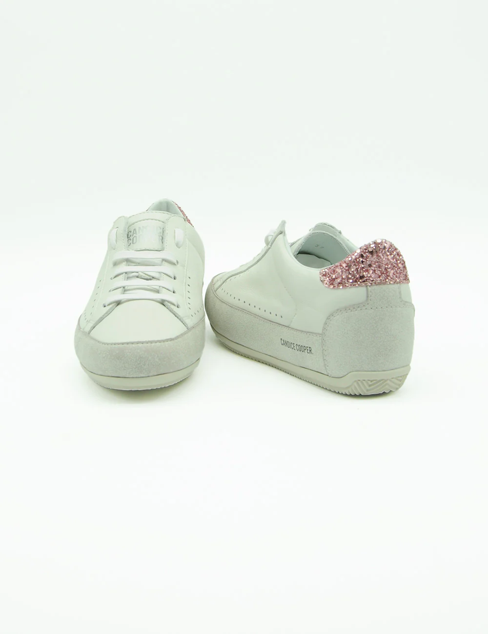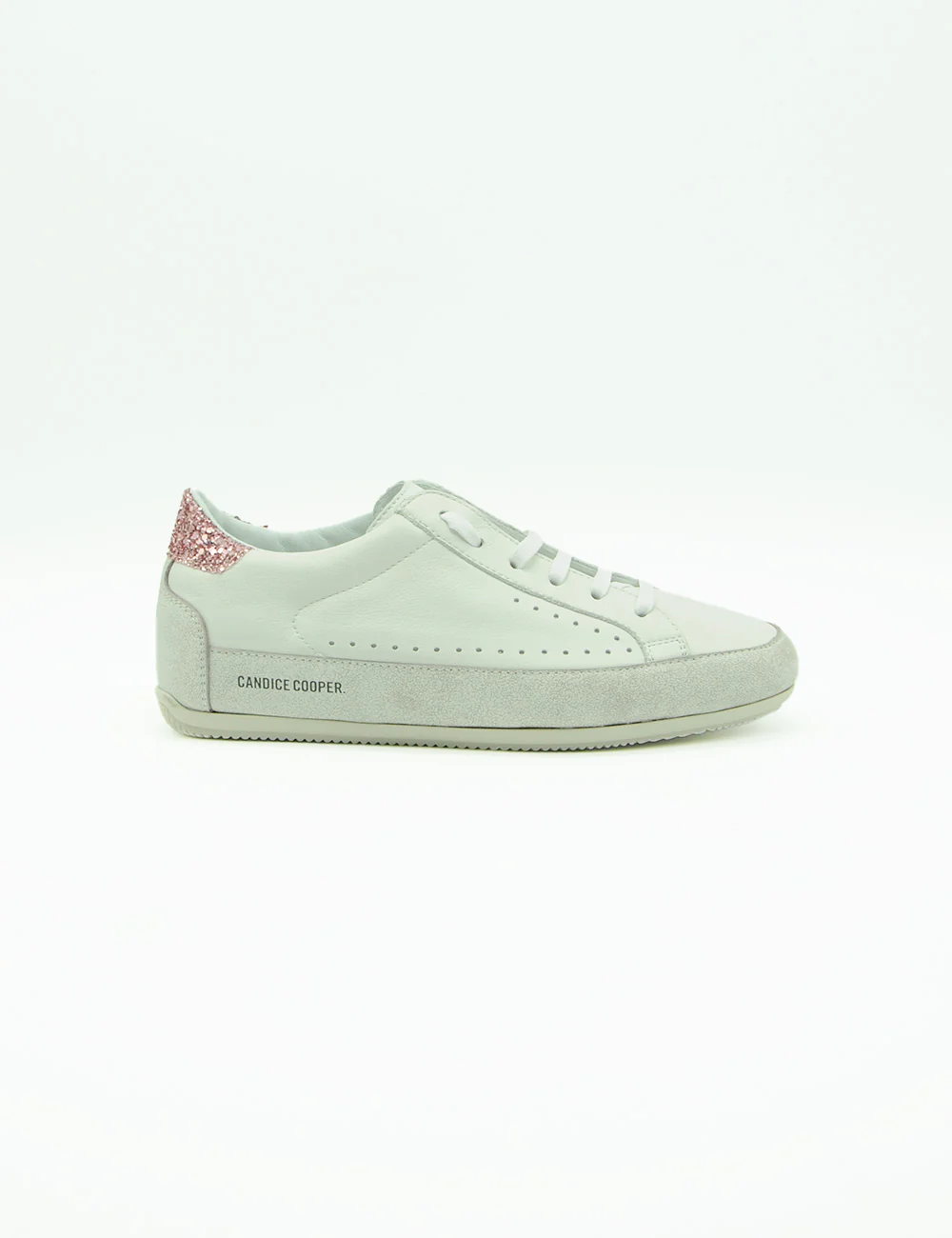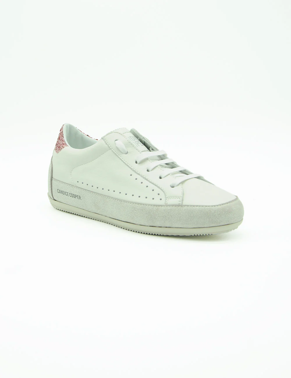 Candice Cooper Sneakers Dafne, sneakers basse in pelle con rinforzi sulla punta e sul tallone. Toppone glitterato rosa. Lacci a nastro, plantare estraibile e sottile suola in gomma rialzata sul tallone.