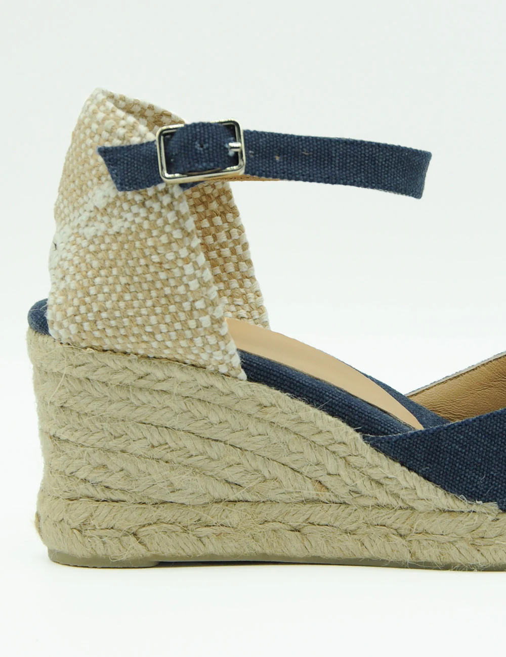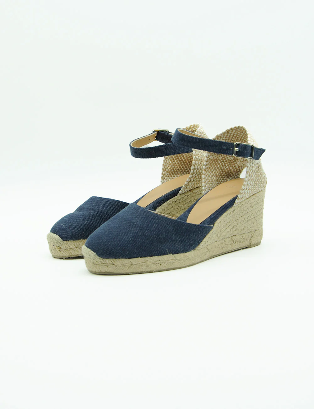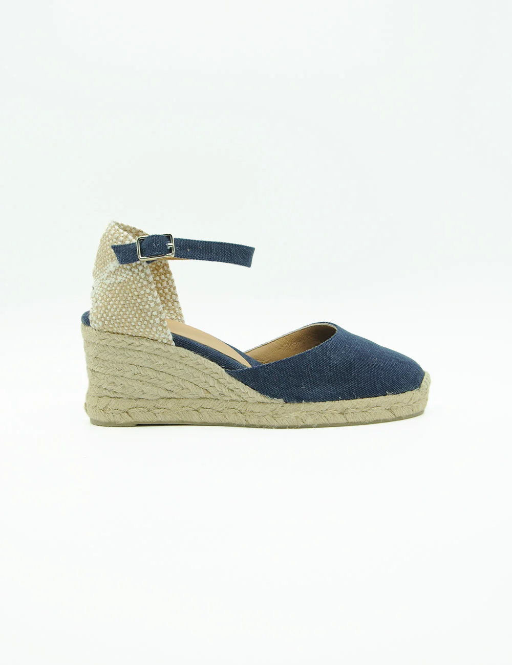 Castaner Carol Azul Oxford, espadrillas in cotone, foderate in pelle, realizzate in Spagna con punta chiusa arrotondata, cinturino alla caviglia e suola in gomma vulcanizzata.