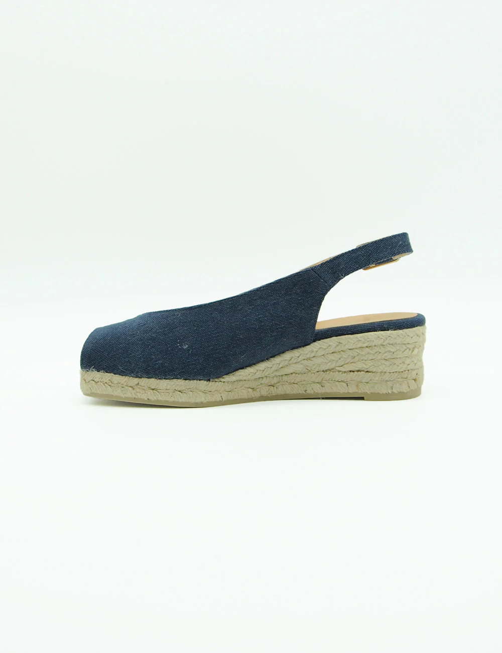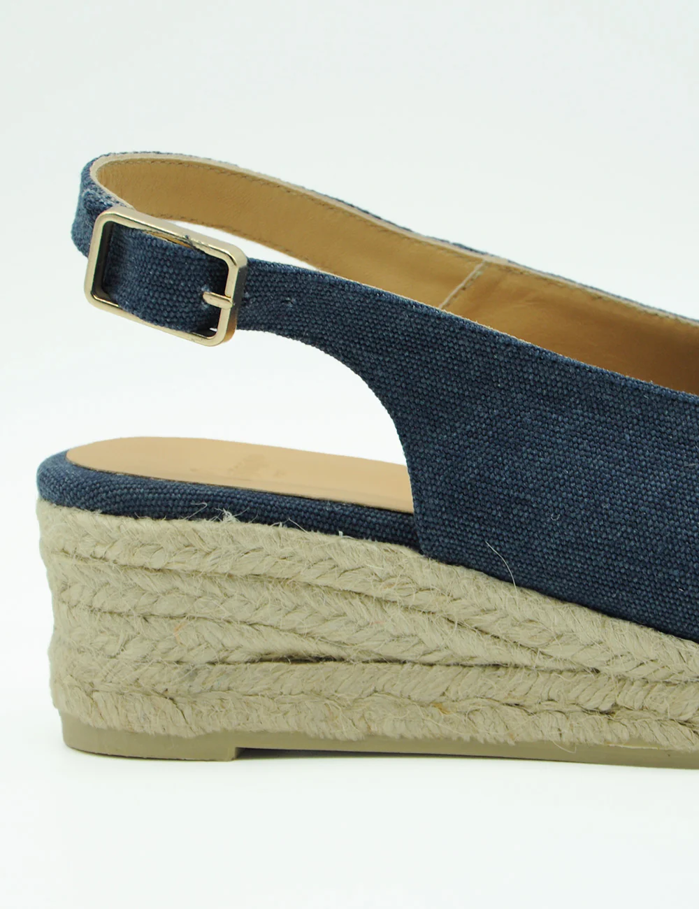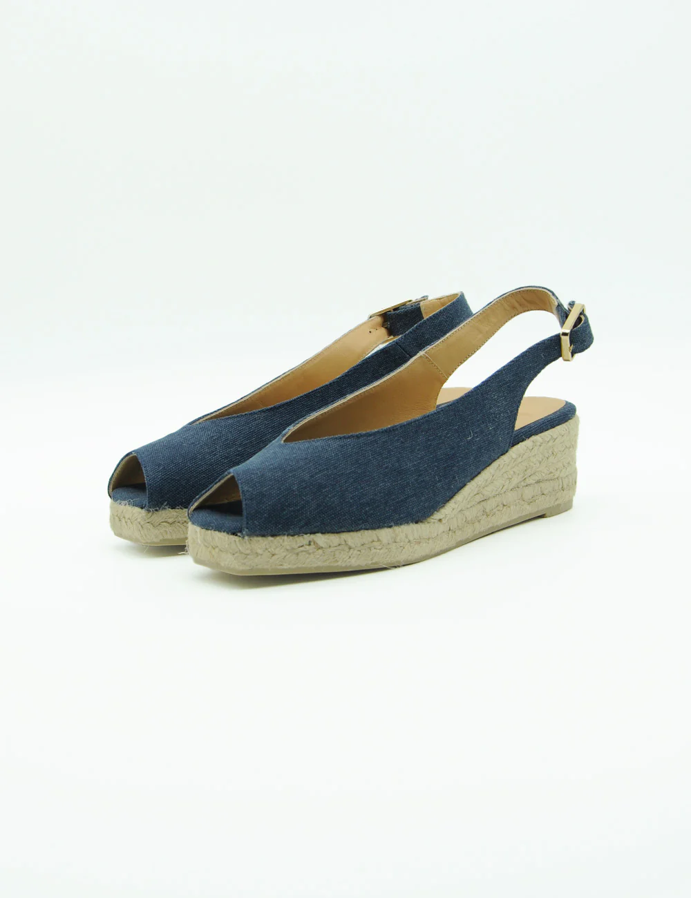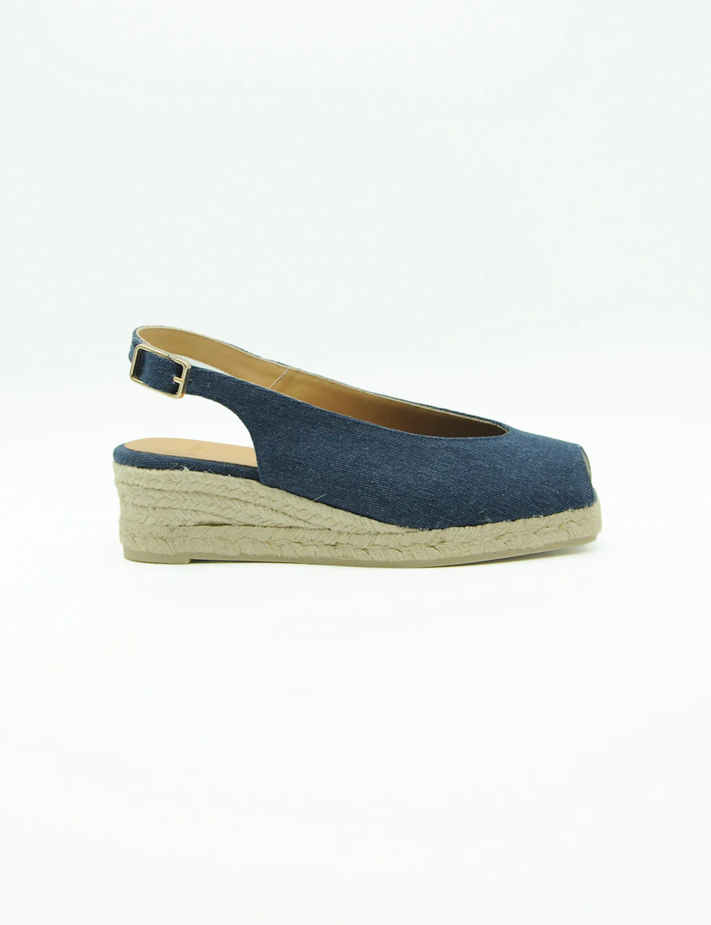 Castaner Dosalia Azul Oxford, espadrillas in cotone biologico, foderate in pelle, realizzate in Spagna con punta aperta squadrata, cinturino alla caviglia e suola in gomma vulcanizzata.