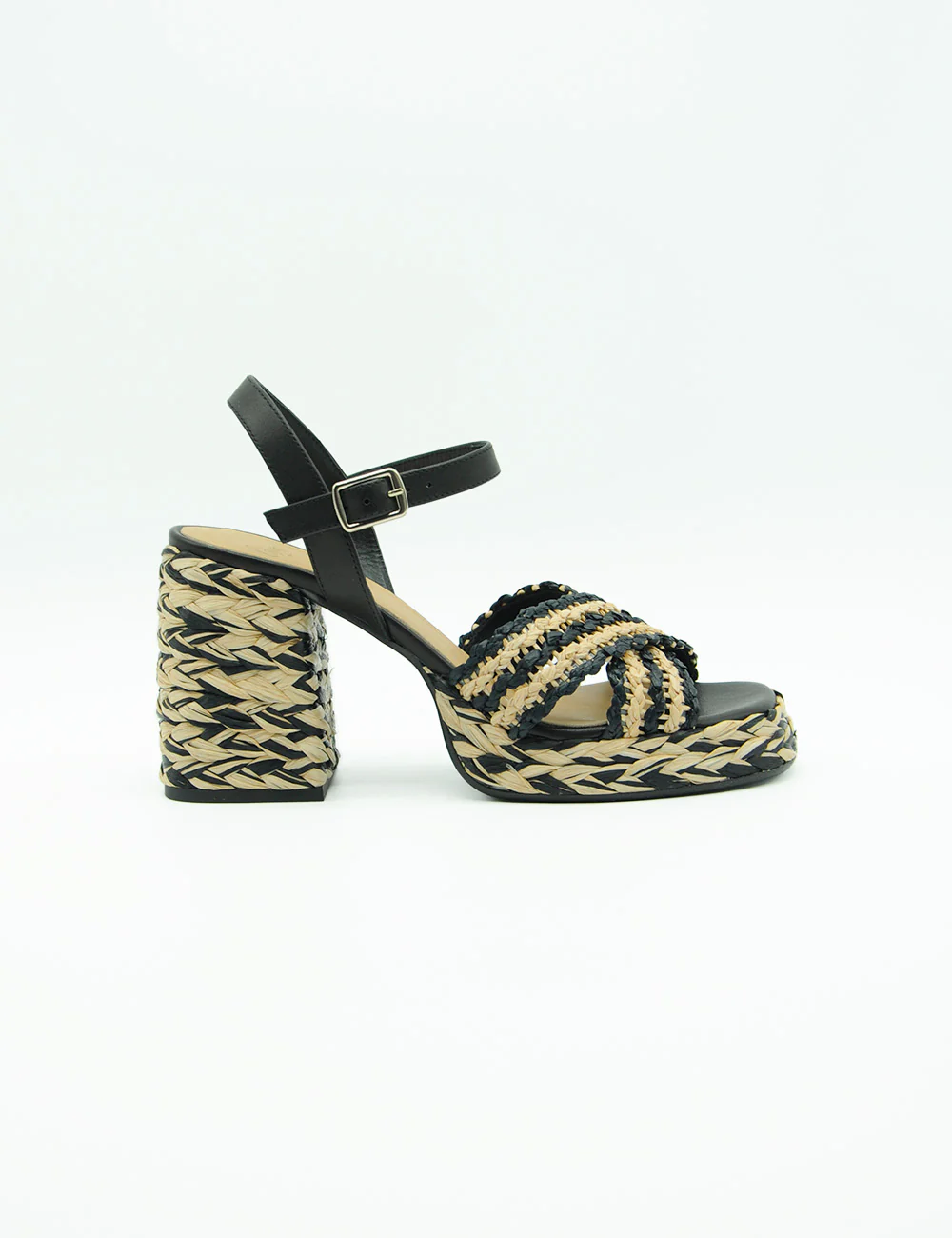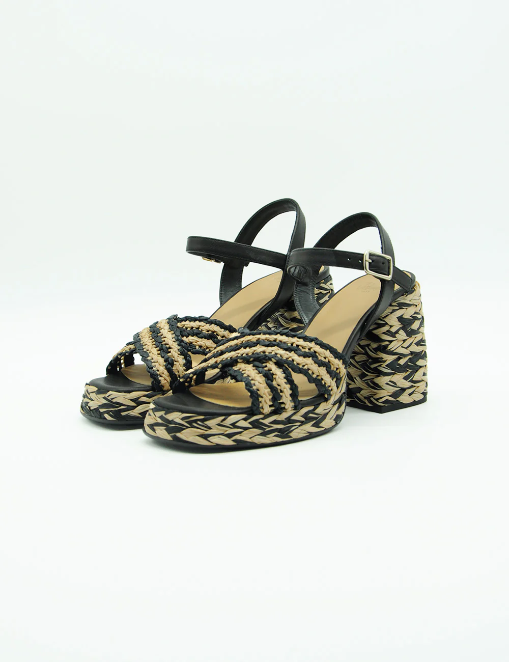 Castaner Vicen Nero Toasted, sandali incrociati in raffia foderati in pelle, realizzate in Spagna, con cinturino alla caviglia e suola in gomma vulcanizzata.