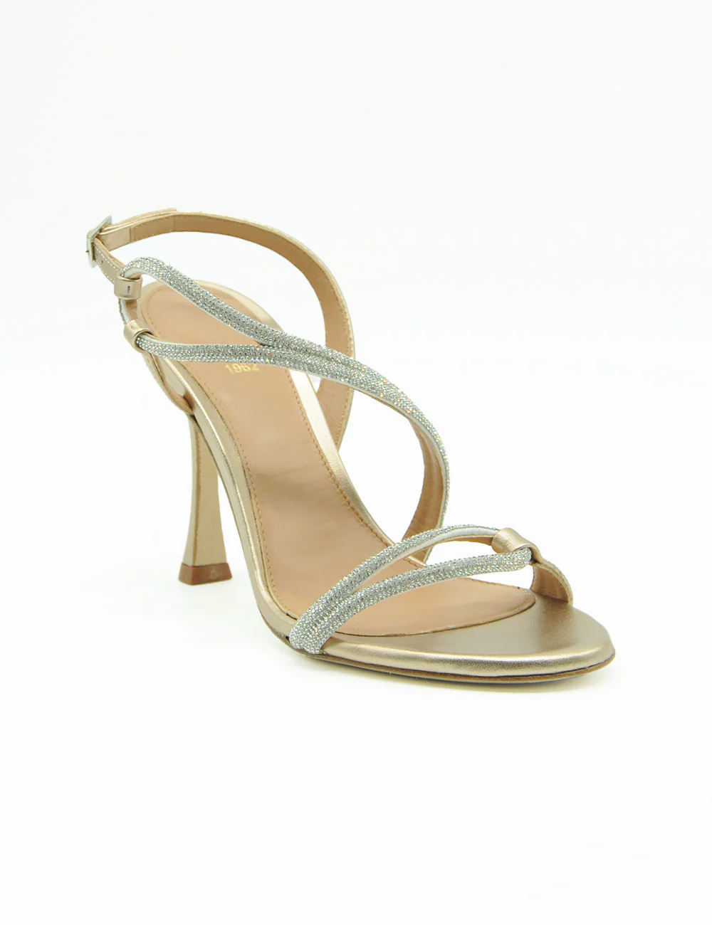 Chantal Sandalo Satin Cristal Oro, sandalo in pelle con cinturino alla caviglia e fasce tubolari sapientemente rivestite di strass. Fondo in vero cuoio.