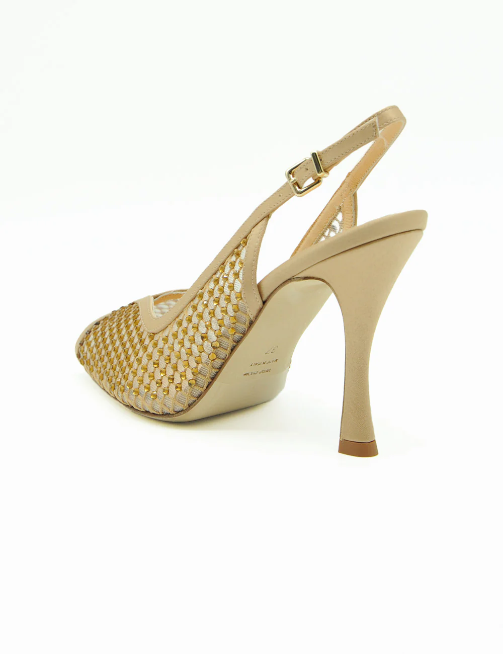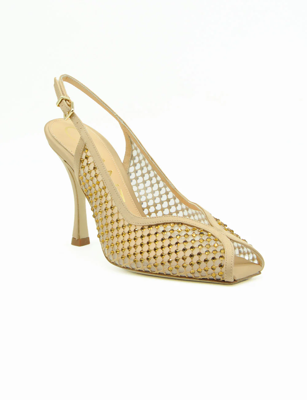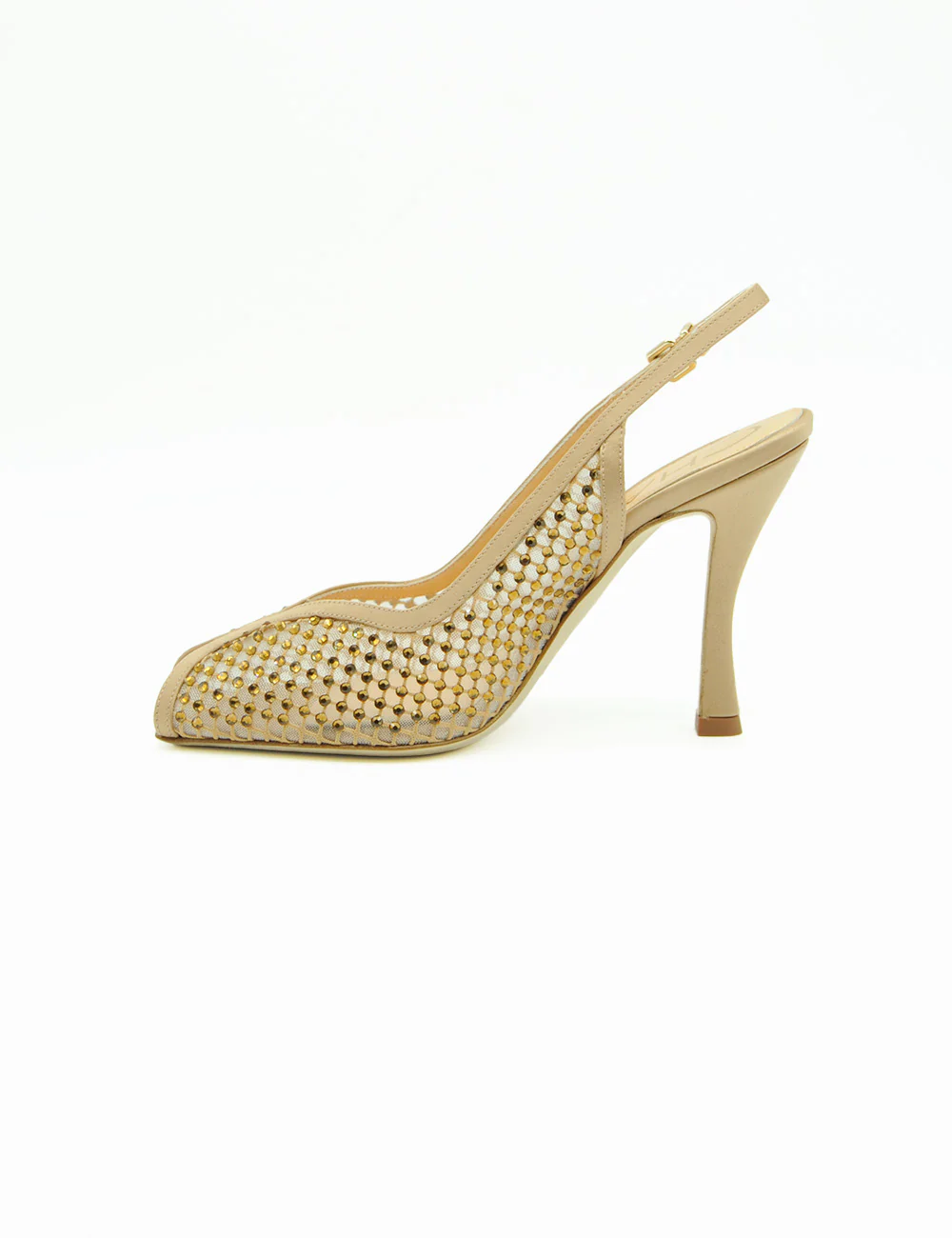 Chantal Sandalo Slingback Nude, tomaia in rete trasparente nude tempestata di mini strass che scintillano ad ogni movimento, per un glow sofisticato e irresistibile.