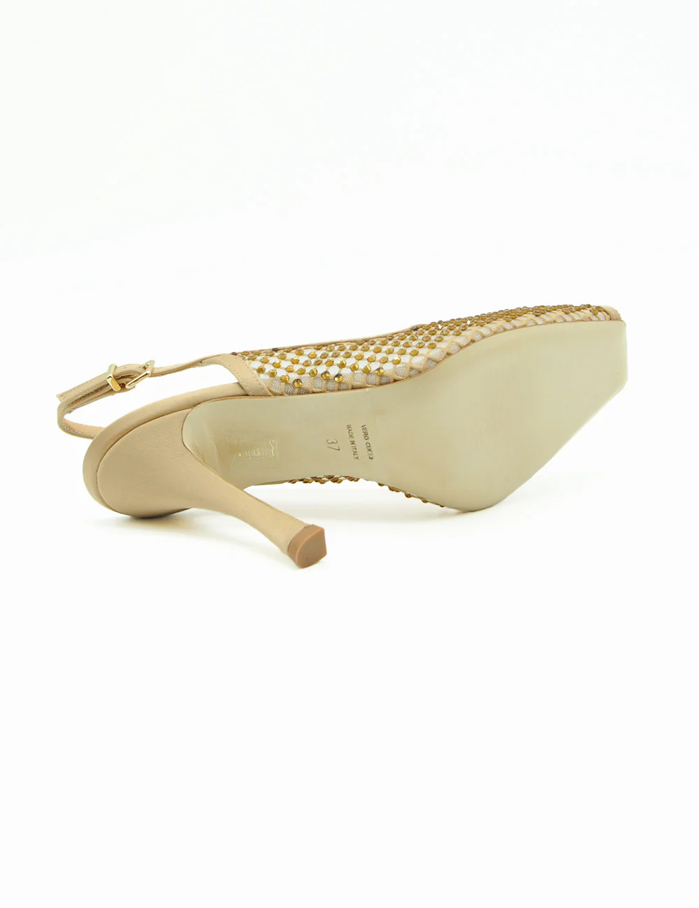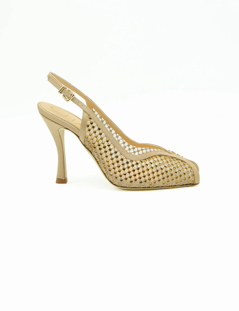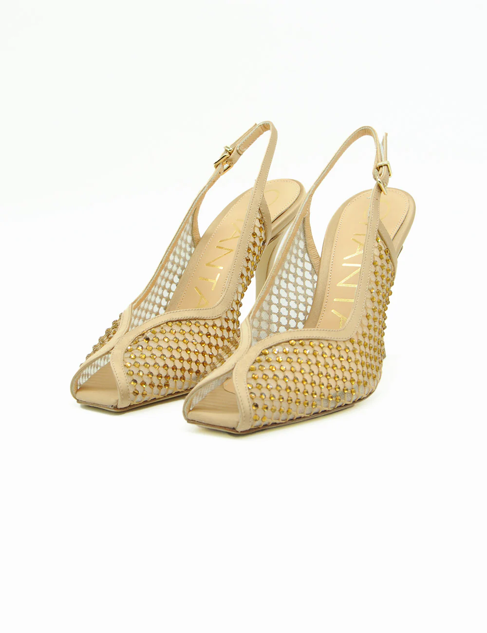 Chantal Sandalo Slingback Nude, tomaia in rete trasparente nude tempestata di mini strass che scintillano ad ogni movimento, per un glow sofisticato e irresistibile.