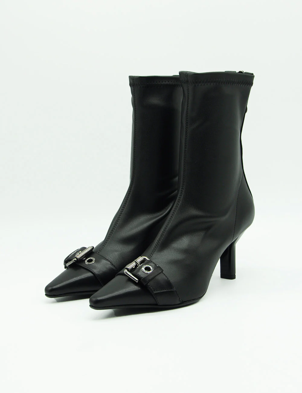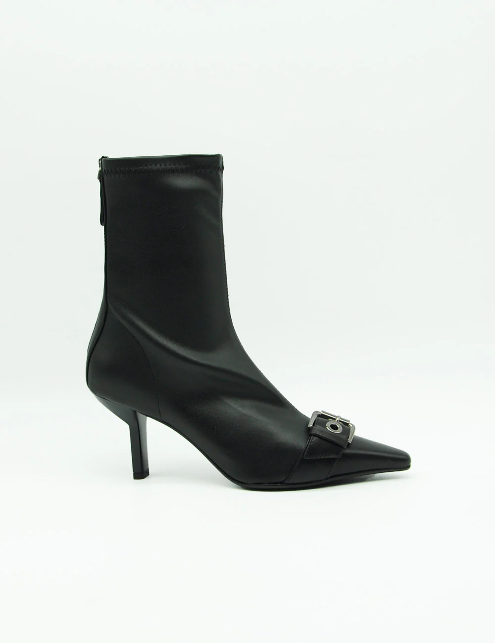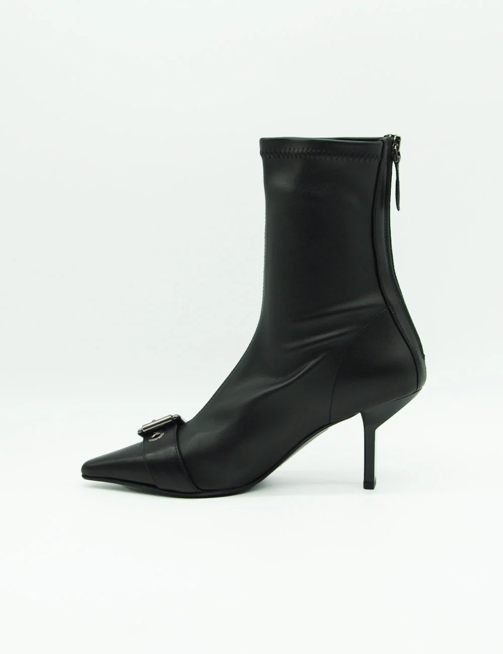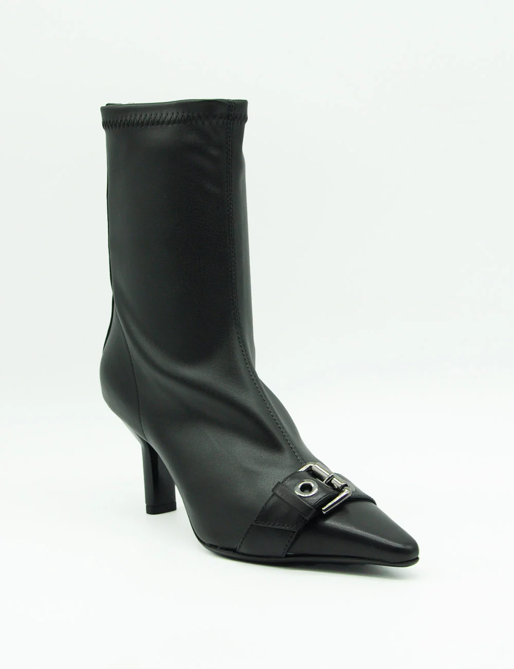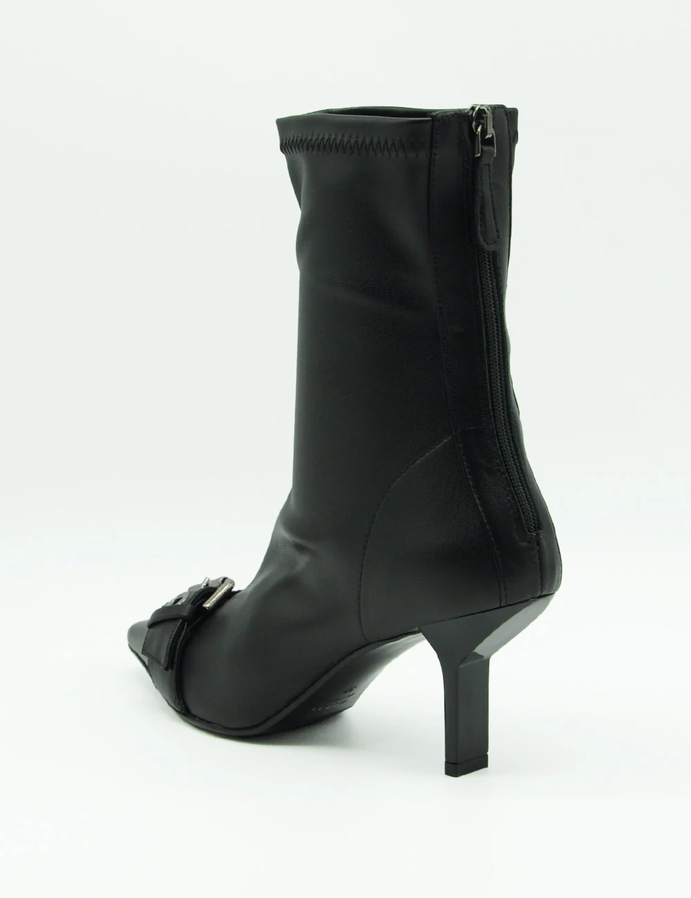 Chantal Stivaletto Nero รจ uno stivaletto in pelle caratterizzato da un gambale elasticizzato e una punta affusolata impreziosita da una fibbia cromata. La suola in cuoio genuino e il tacco di 7 cm conferiscono unโeleganza raffinata e sobria.