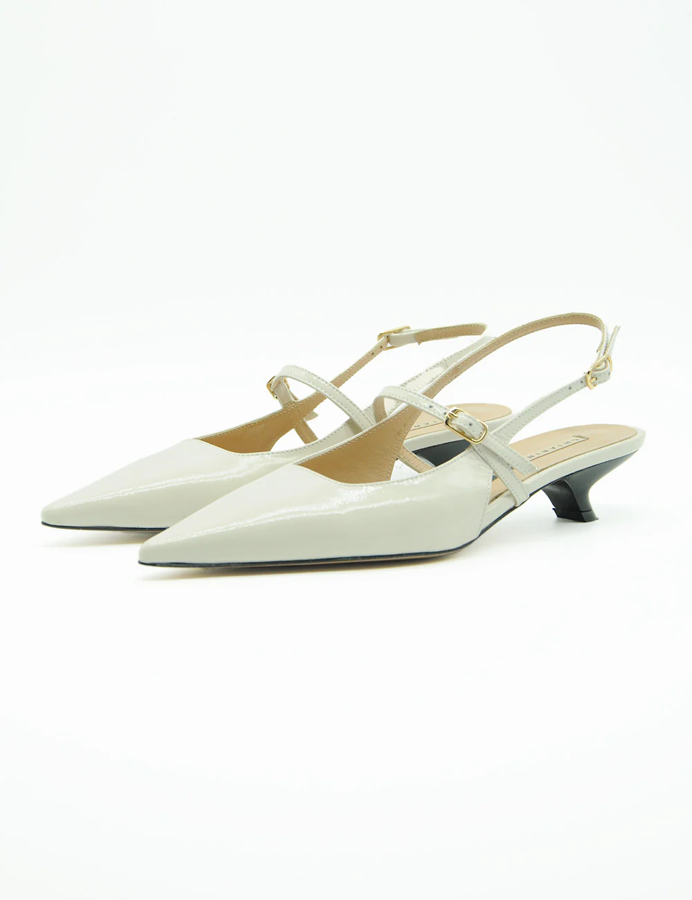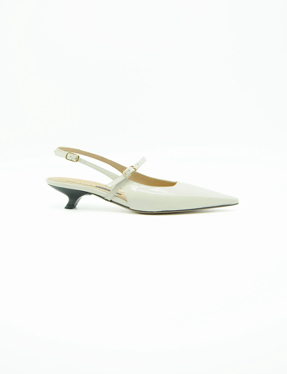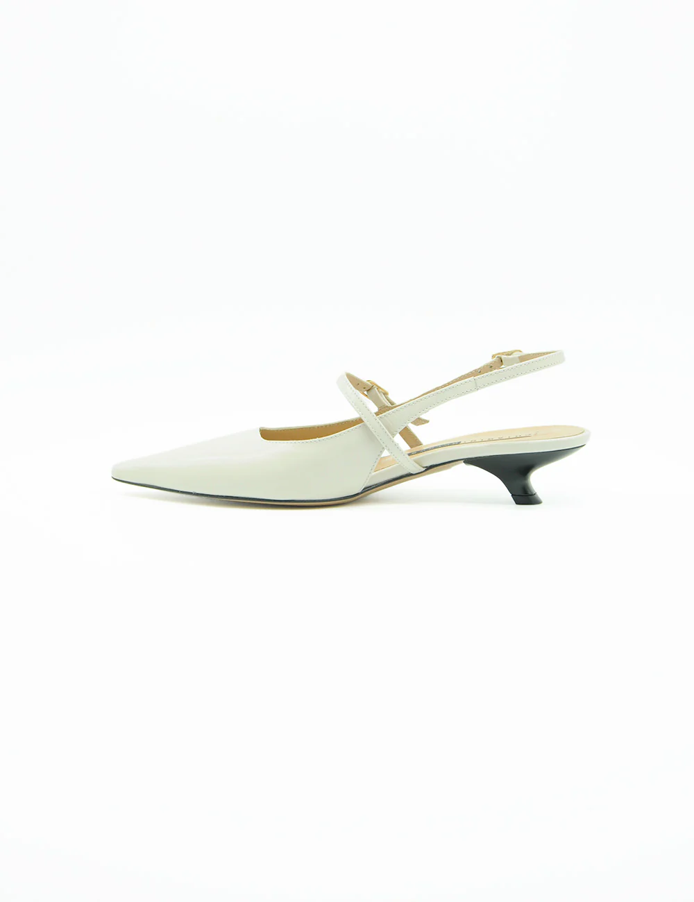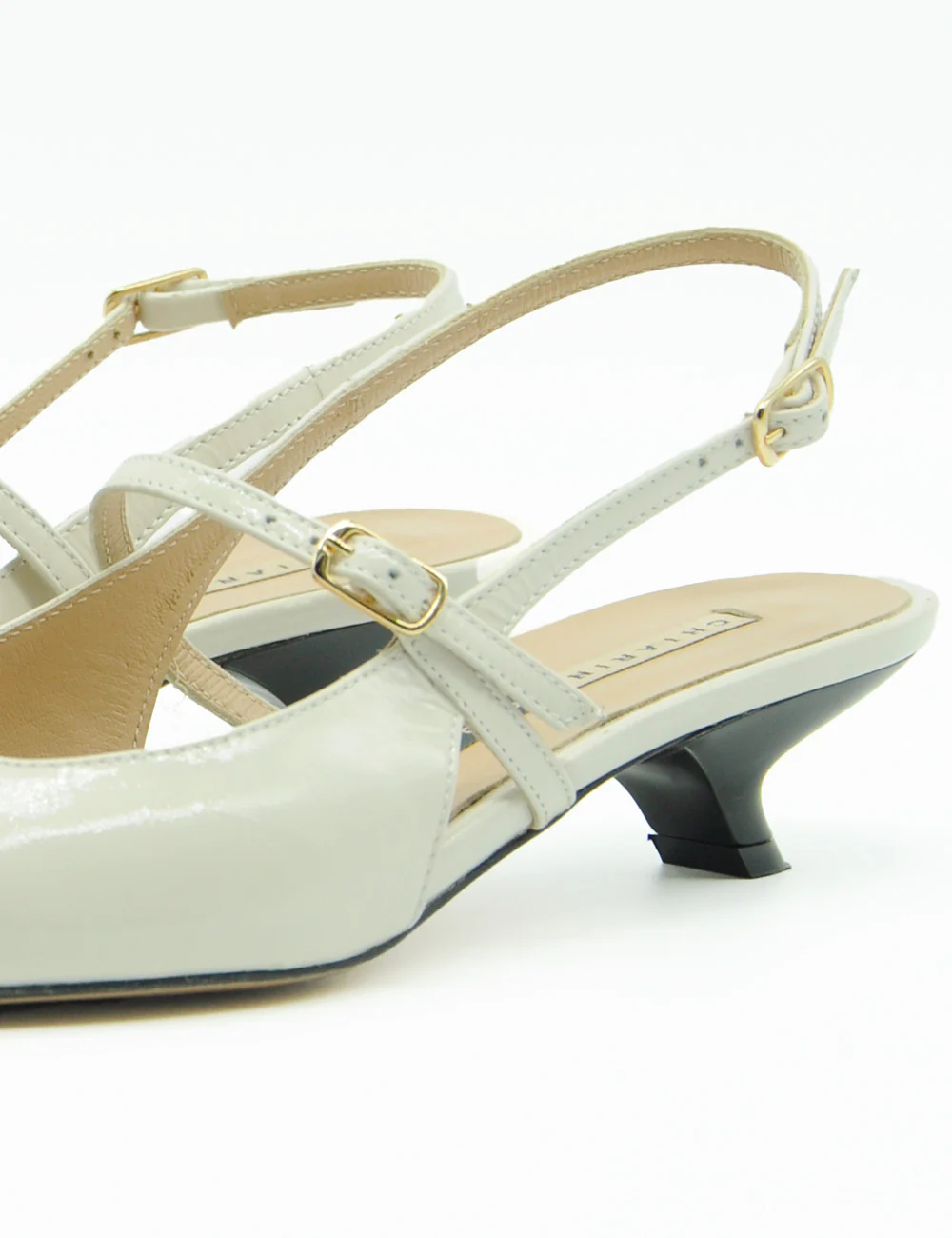 Chiarini Bologna Chanel Milk, chanel in pelle abrasivata con punta affusolata. Cinturino con fibbia oro sul collo piede e alla caviglia. Sottopiede imbottito.