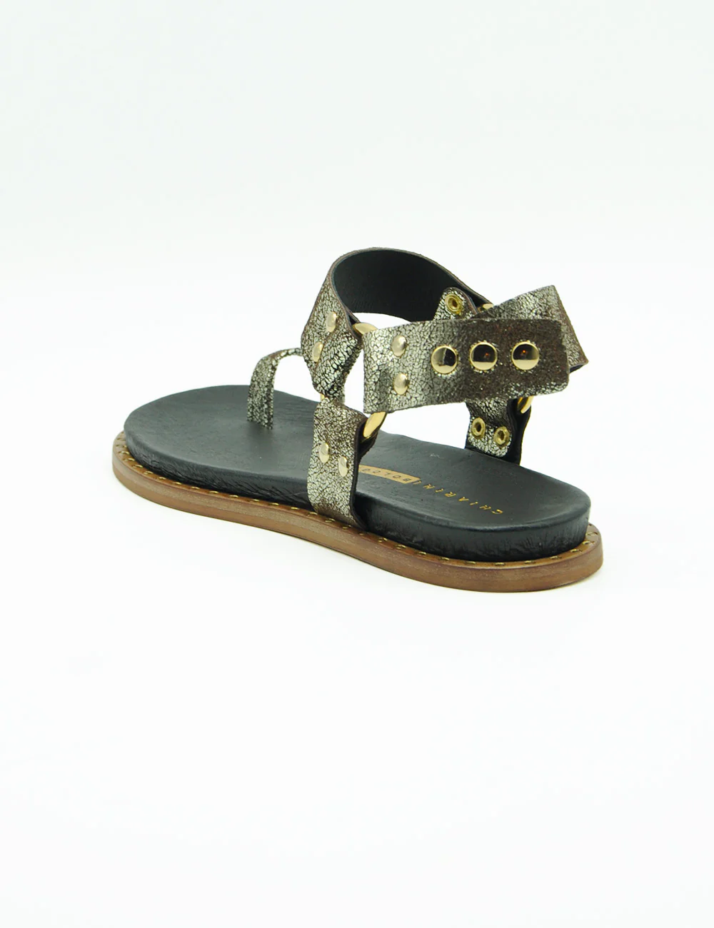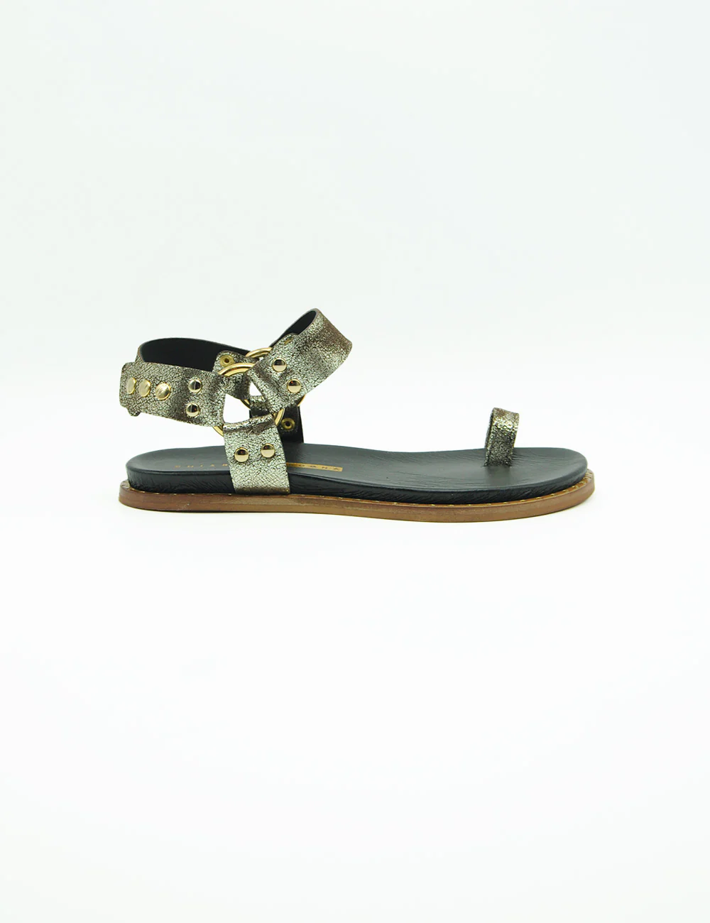 Chiarini Bologna Sandalo Platino, sandalo flat realizzato in pelle laminata. Cinturino alla caviglia con innovativa chiusura regolabile grazie ai bottoni automatici. Mini borchie applicate. Sottopiede in pelle e fondo in gomma.