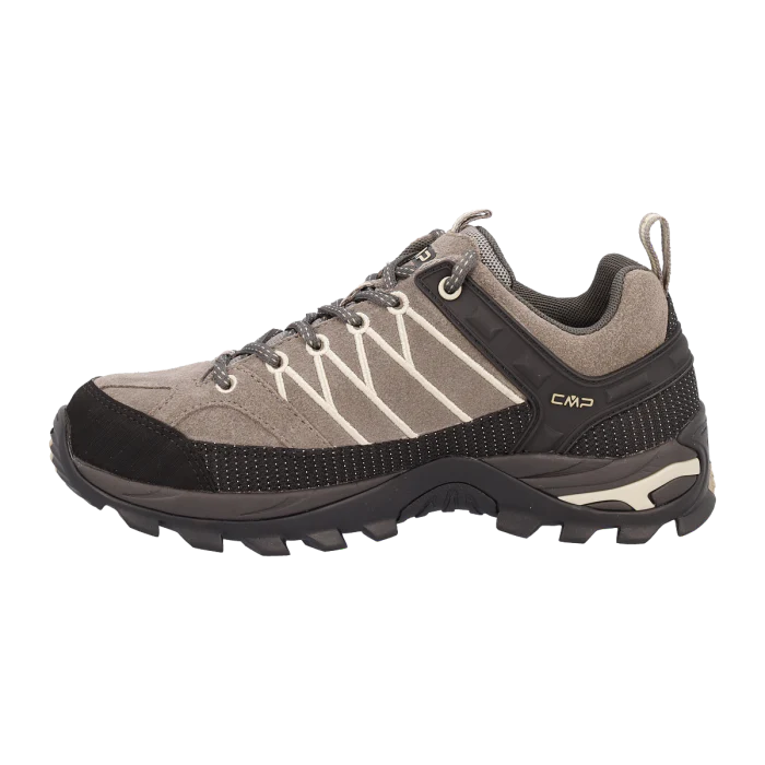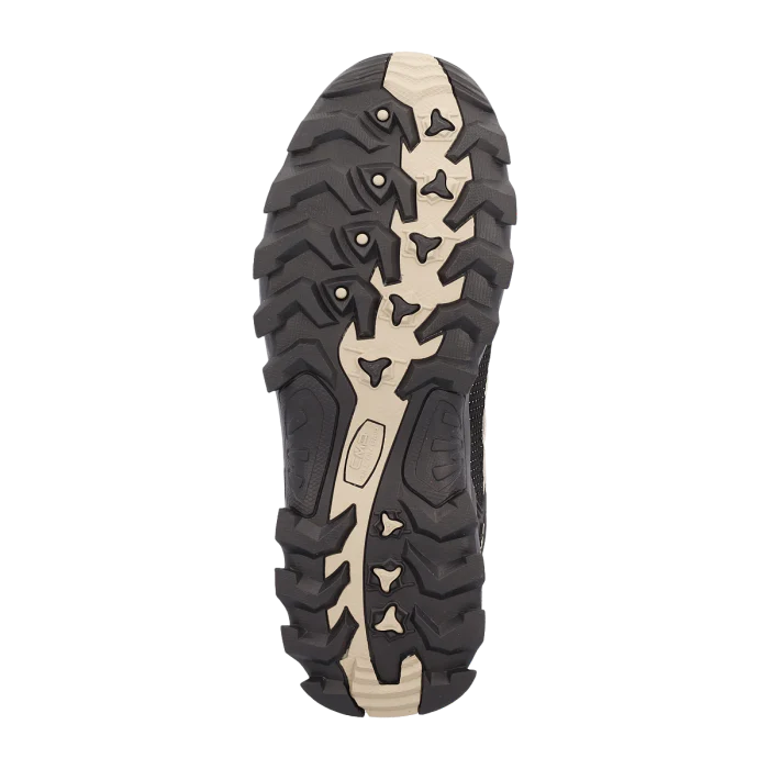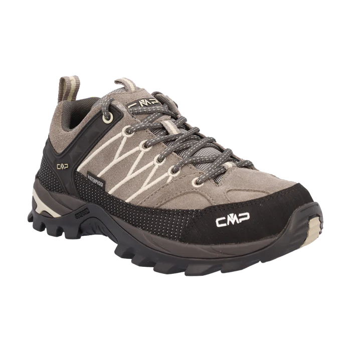 RIGEL รจ uno scarponcino trekking con tomaia in pelle scamosciata, impermeabile, dallo stile sportivo e accattivante grazie ai dettagli in contrasto di colore. Si adatta a tutte le superfici, asciutte o bagnate, grazie alla struttura e la mescola della suola CMP FullOn GRIP.