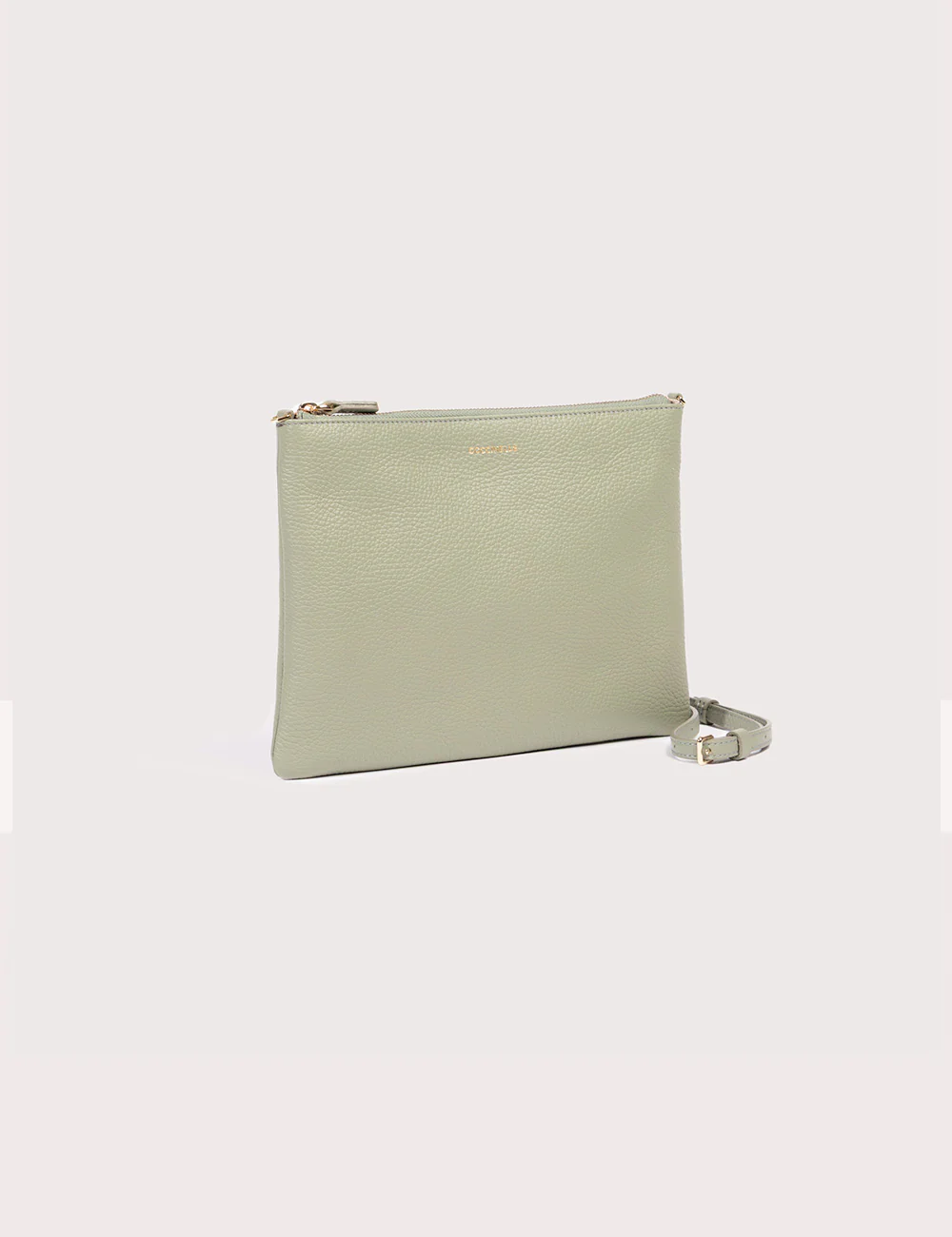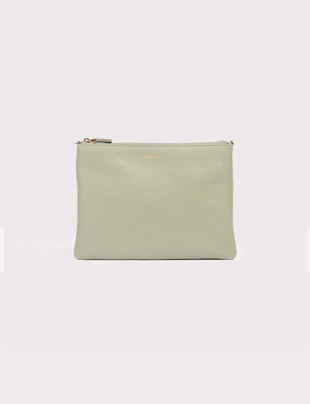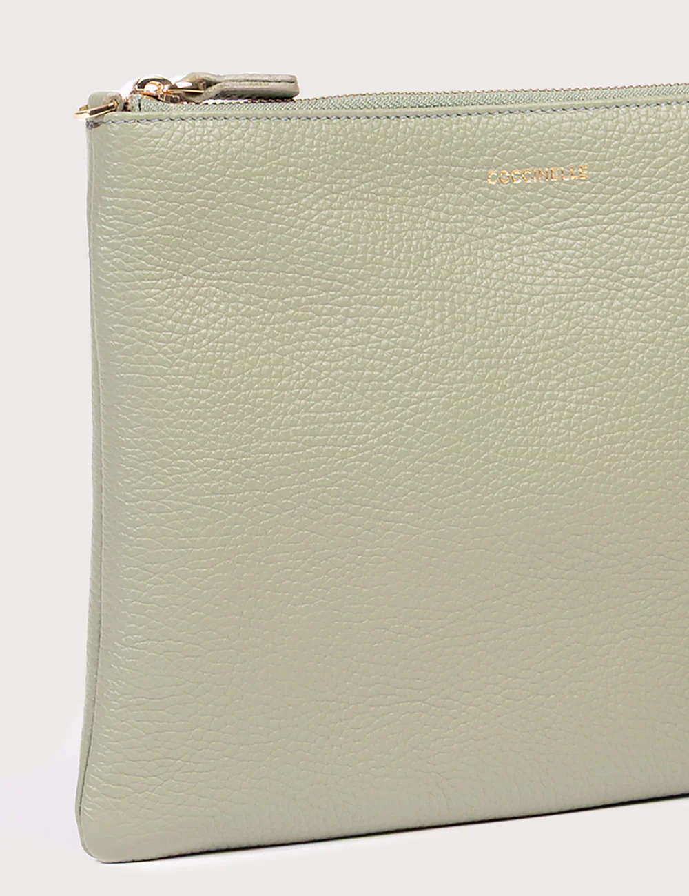 Coccinelle Best Small Greenery, bustina in pelle con grana dotata di chiusura a zip e cinturino da polso in pelle. Portacarte interno. Interno in tessuto. Logo timbro. Galvanica gold.