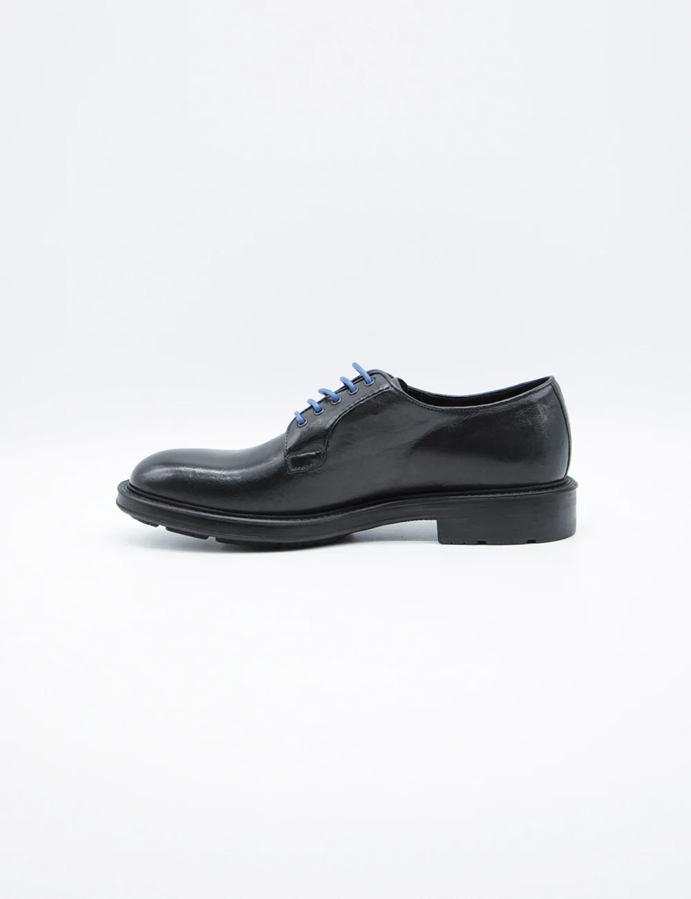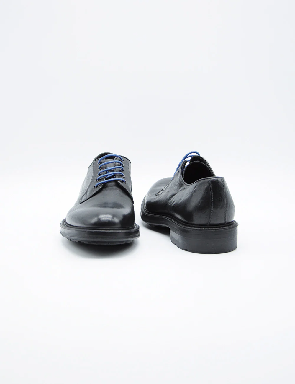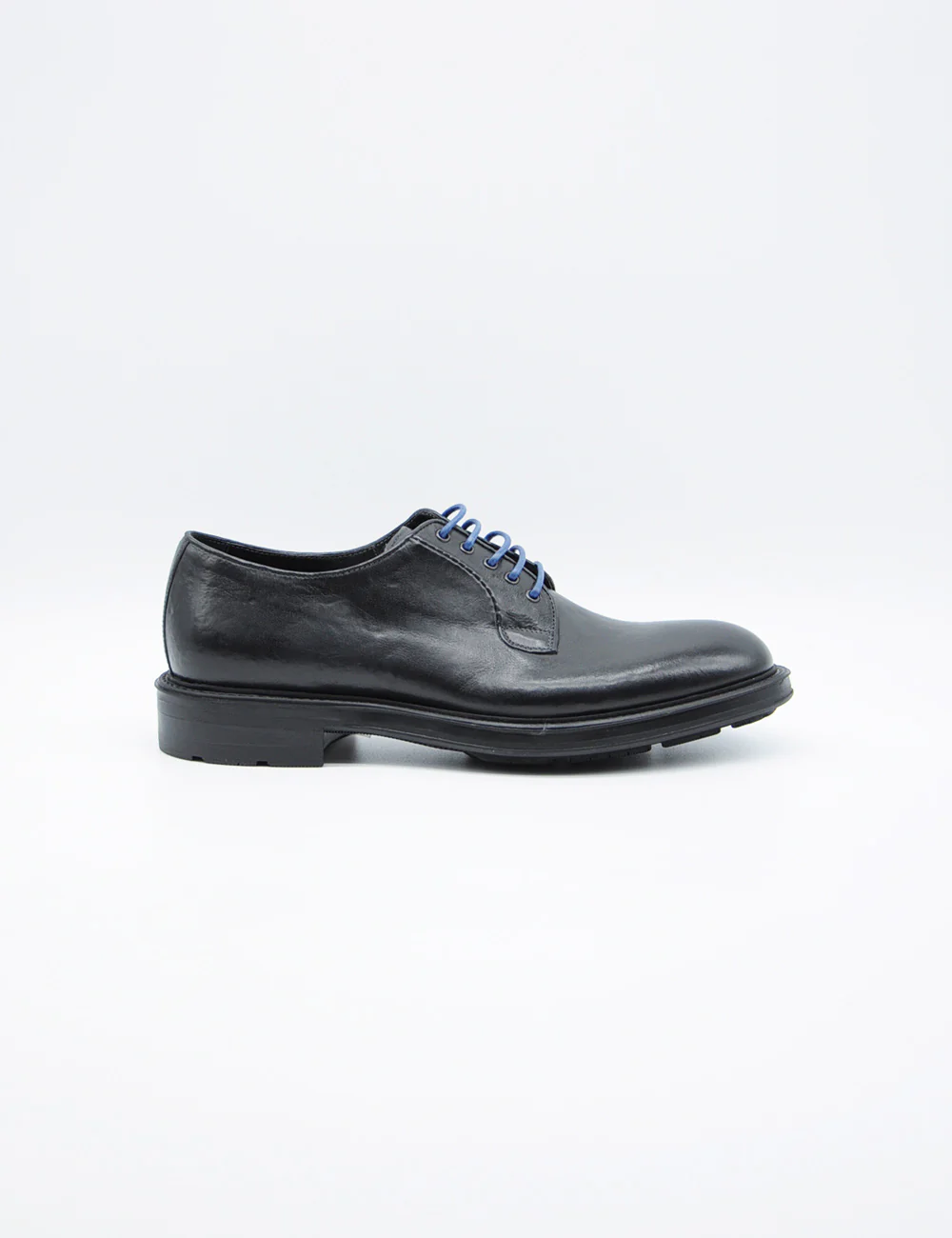 Corvari Derby Nera, scarpe stringate tipo Derby da uomo realizzate in pelle di prima qualitร lavorata unicamente in Italia.