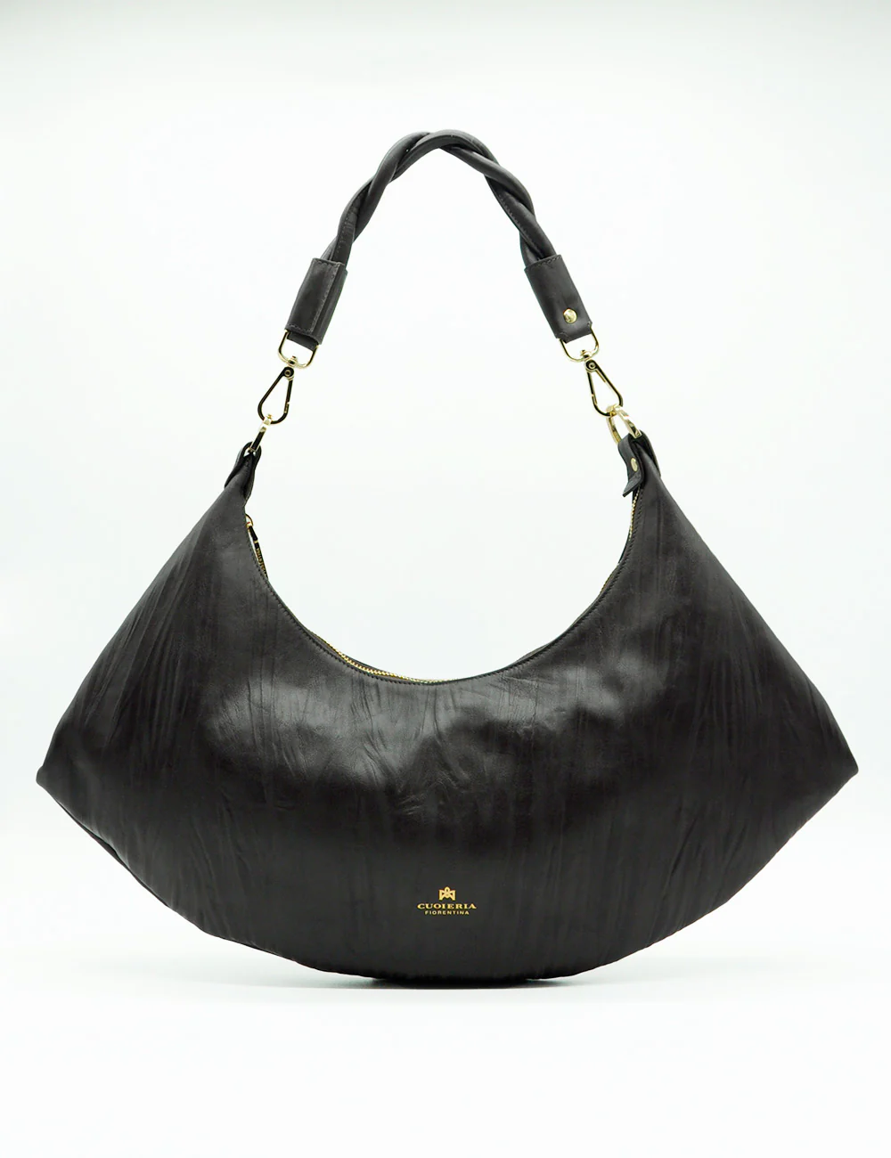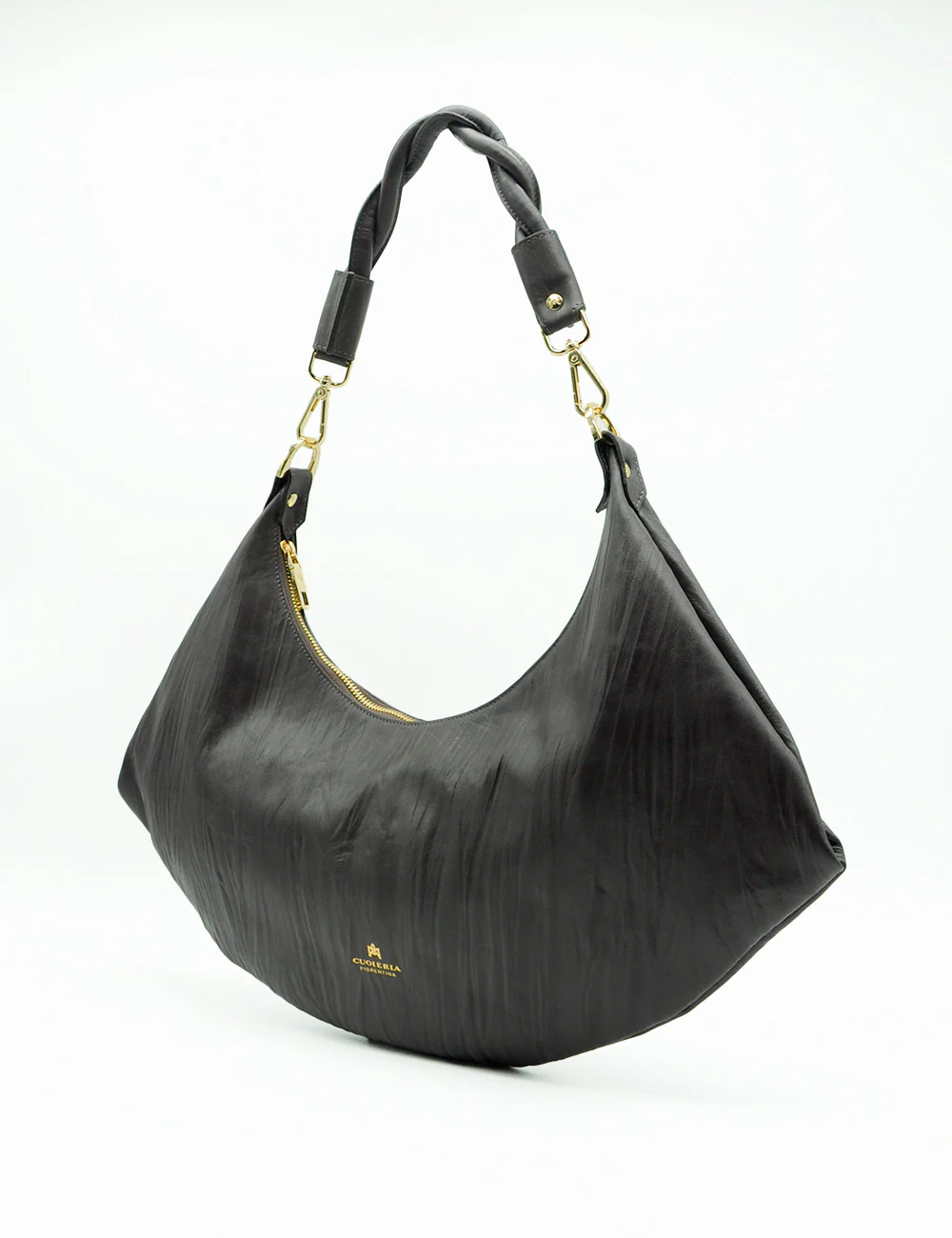 Questa hobo bag firmata Cuoieria Fiorentina combina artigianalità italiana e praticità contemporanea. Realizzata in pelle morbida e avvolgente, presenta una chiusura a zip per massima sicurezza e una capacità generosa che la rende ideale per l’uso quotidiano. Il manico intrecciato aggiunge un dettaglio sofisticato, mentre il logo in stampa oro conferisce un tocco di eleganza discreta. La tonalità cioccolato si abbina facilmente a qualsiasi guardaroba, garantendo versatilità senza compromessi sulla qualità .