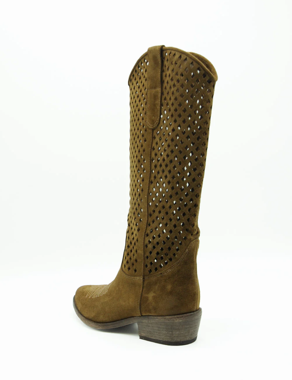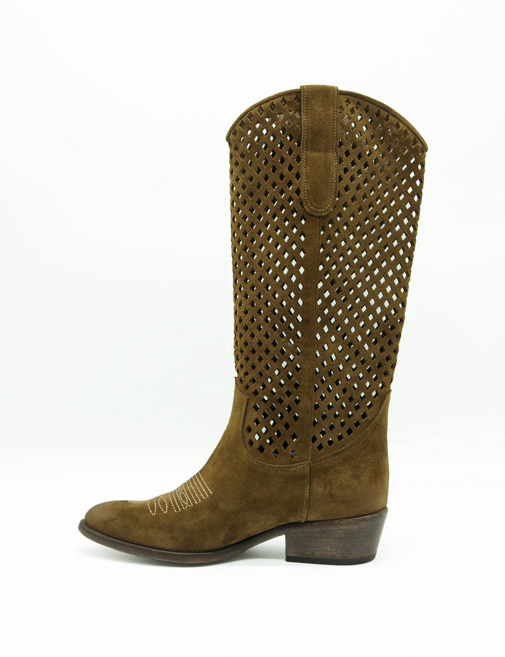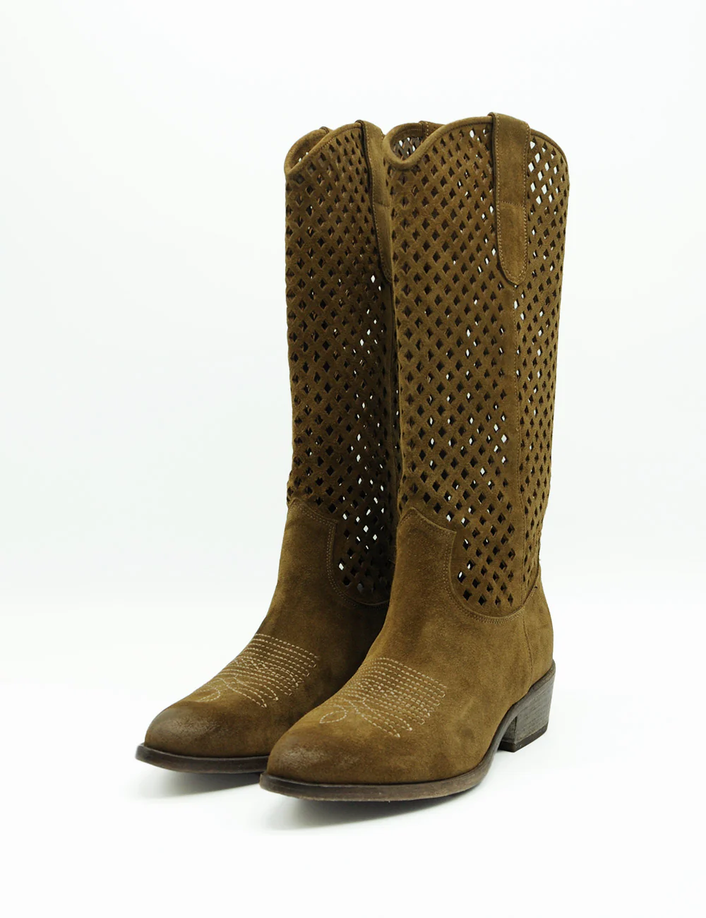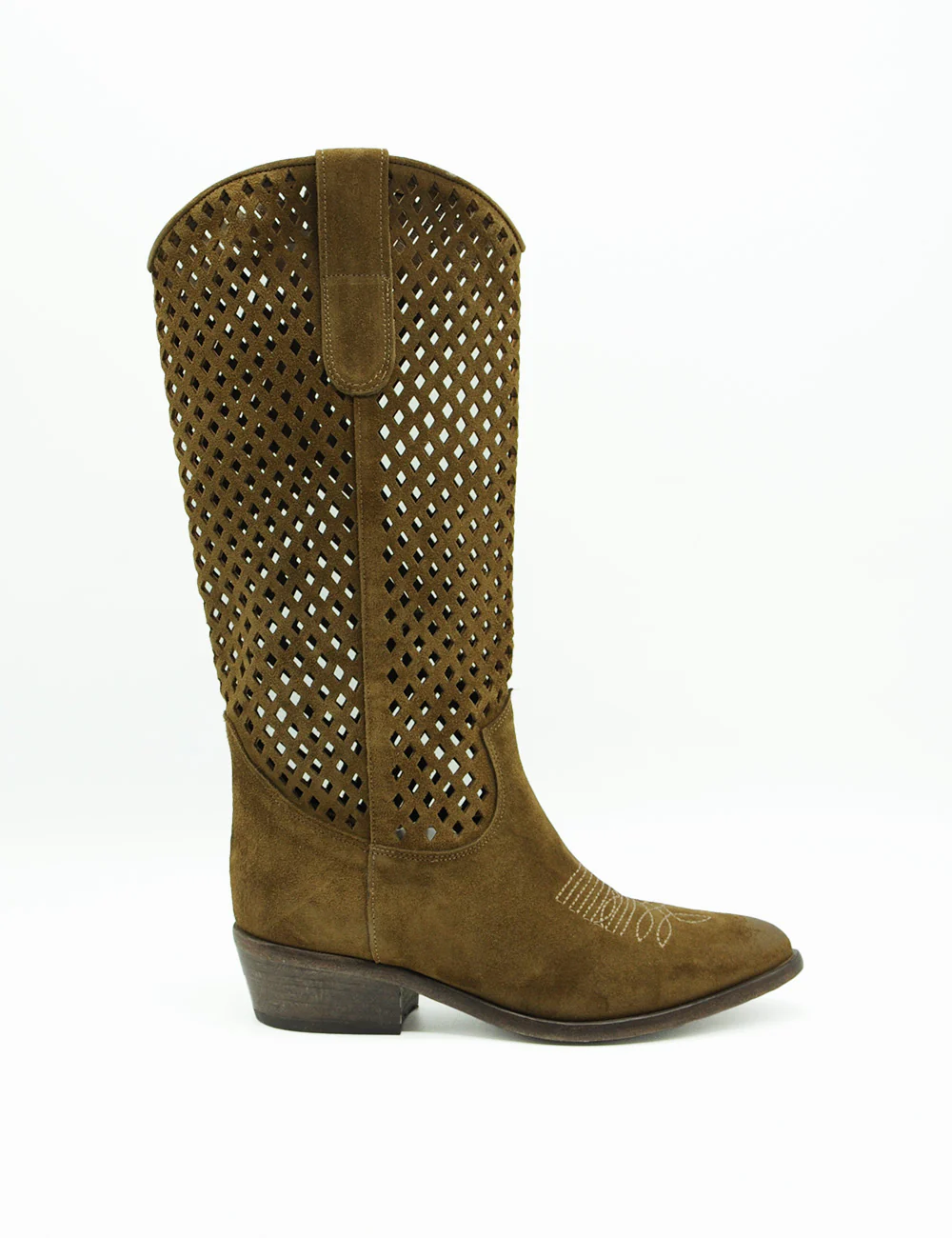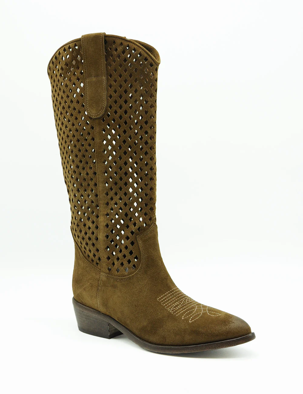 Curiosité Texano Coffee, il perfetto mix tra heritage western e modernità italiana: questi stivali cowboy Curiosité in camoscio marrone oliva conquistano con il loro design traforato ultra-aerato, ideale per le mezze stagioni e un’allure boho-chic effortless.