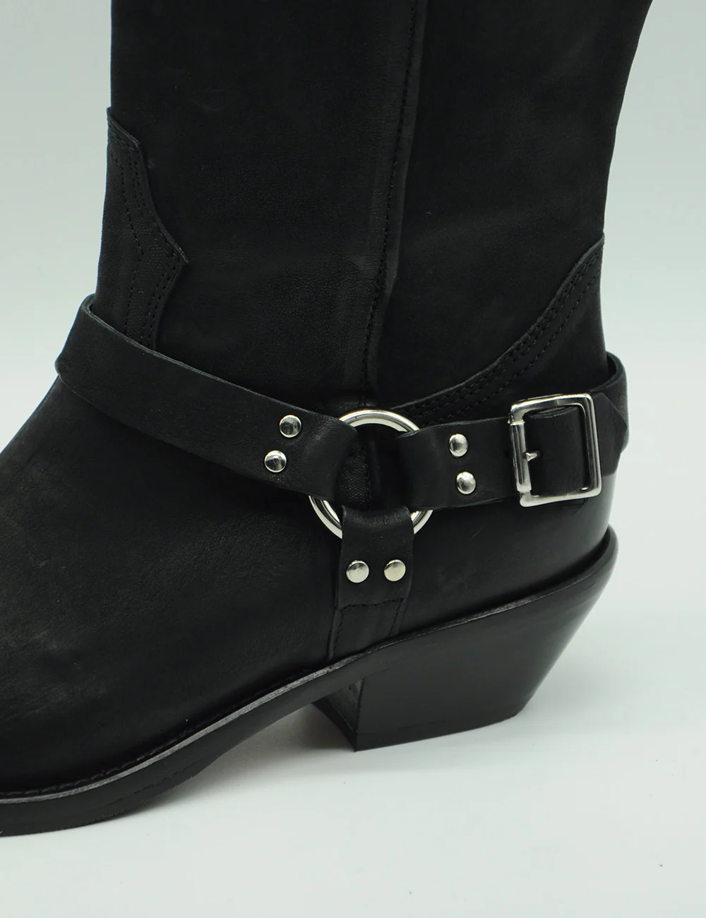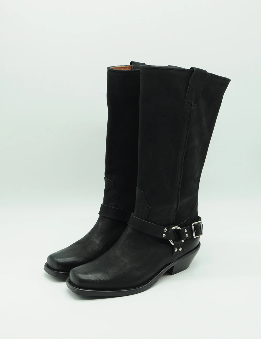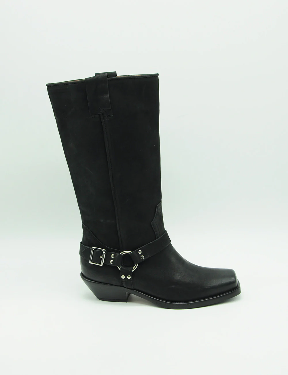 Curiosité Texano Lindos Nero, realizzato in pelle spazzolata e pelle scamosciata sul gambale con le tecniche della migliore tradizione con applicazioni cromo alla caviglia.
