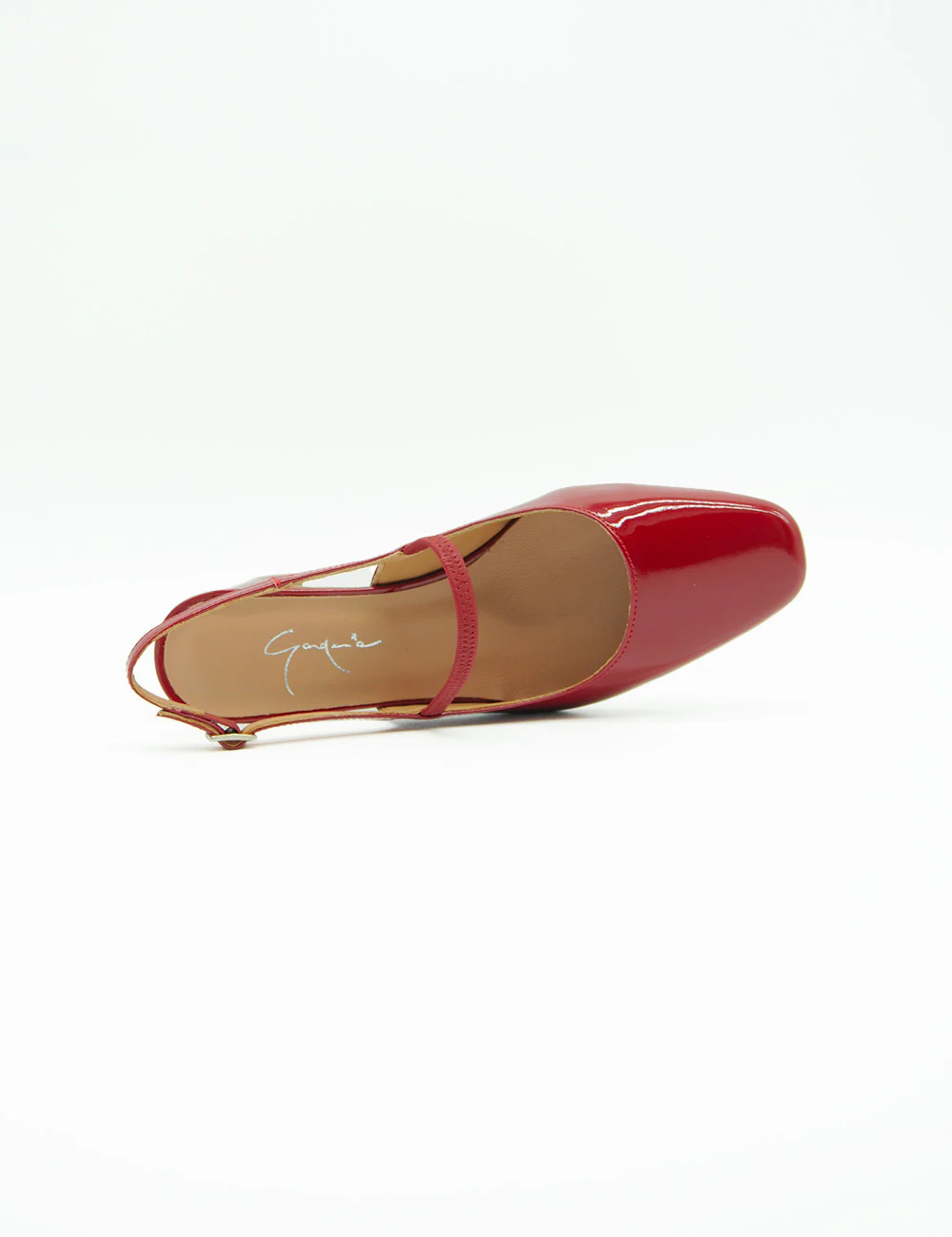 Gardenia Chanel Rossa, chanel in vernice, cinturino con fibbia alla caviglia ed elastico in tono sul collo del piede.