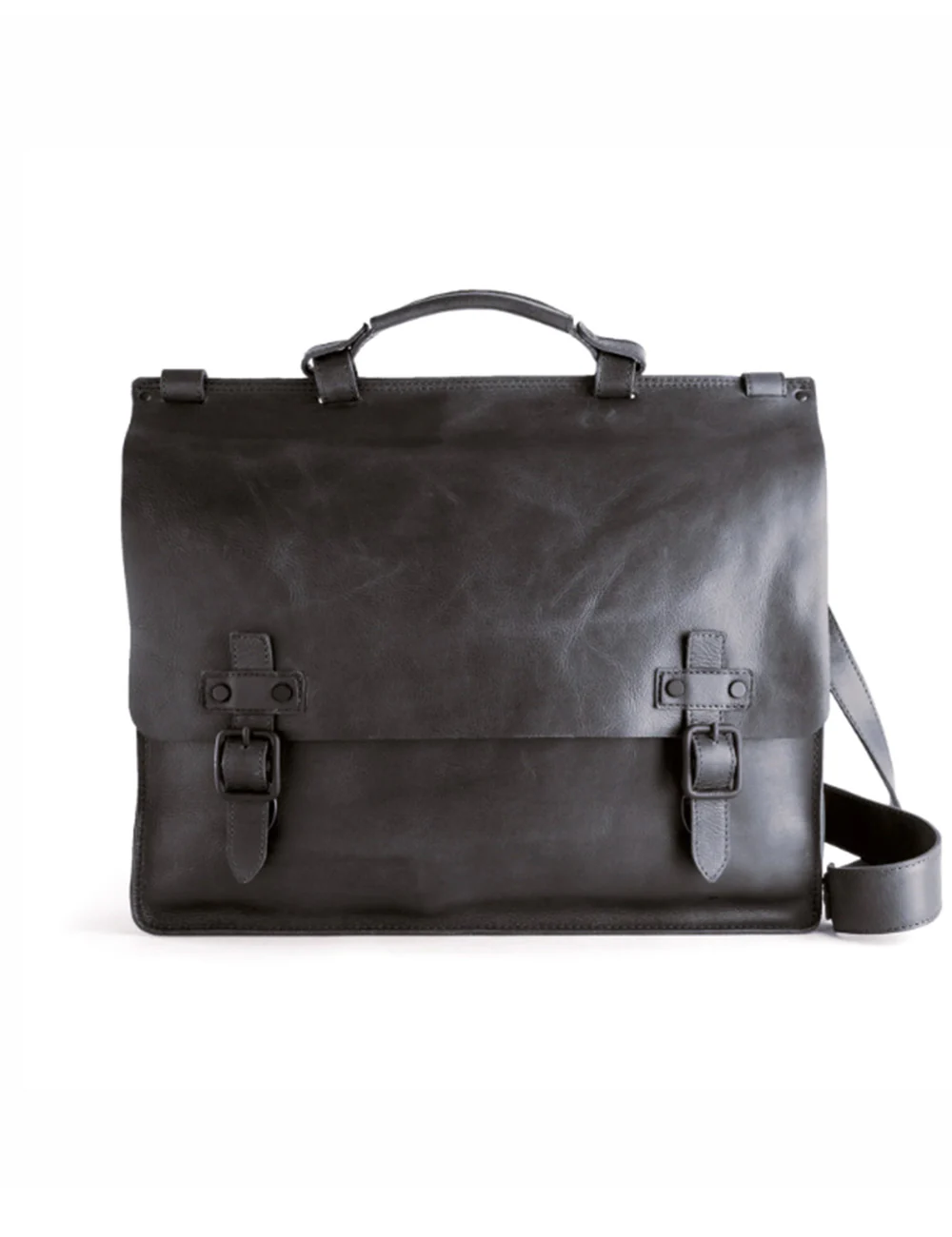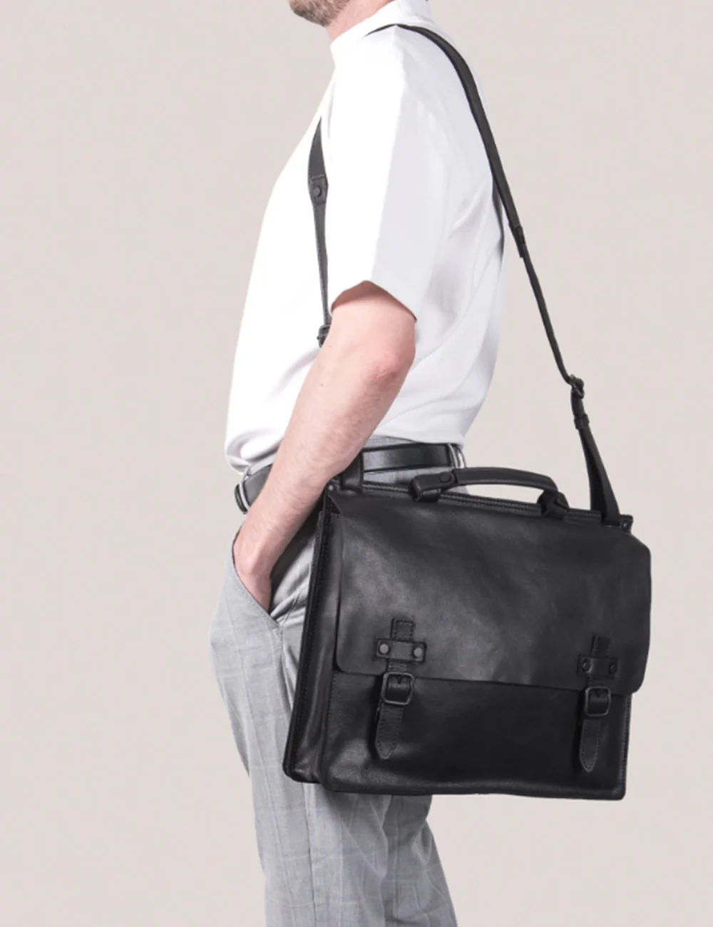 Harold’s Cartella Aberdeen Black, cartella in pelle conciata al vegetale dotata di scomparto principale per cartelle grandi , scomparto interno con cerniera e 4 scomparti per carte. 2 portapenne, scomparto per notebook sul retro esterno, per un notebook da 15 pollici. Maniglia per il trasporto e tracolla regolabile