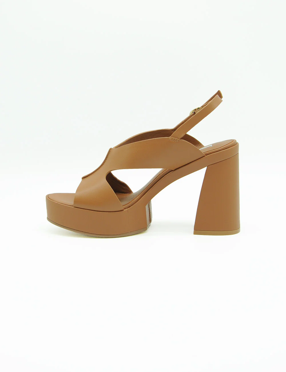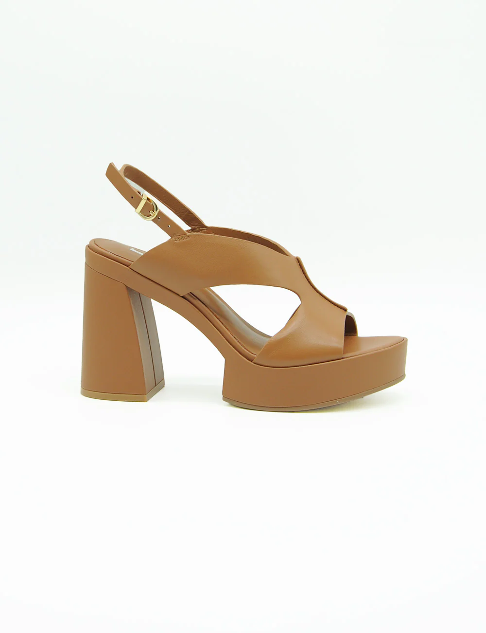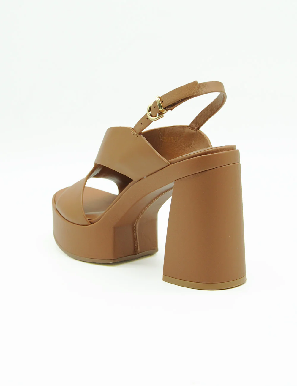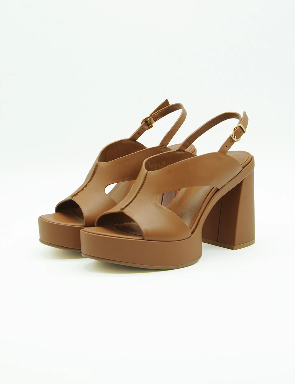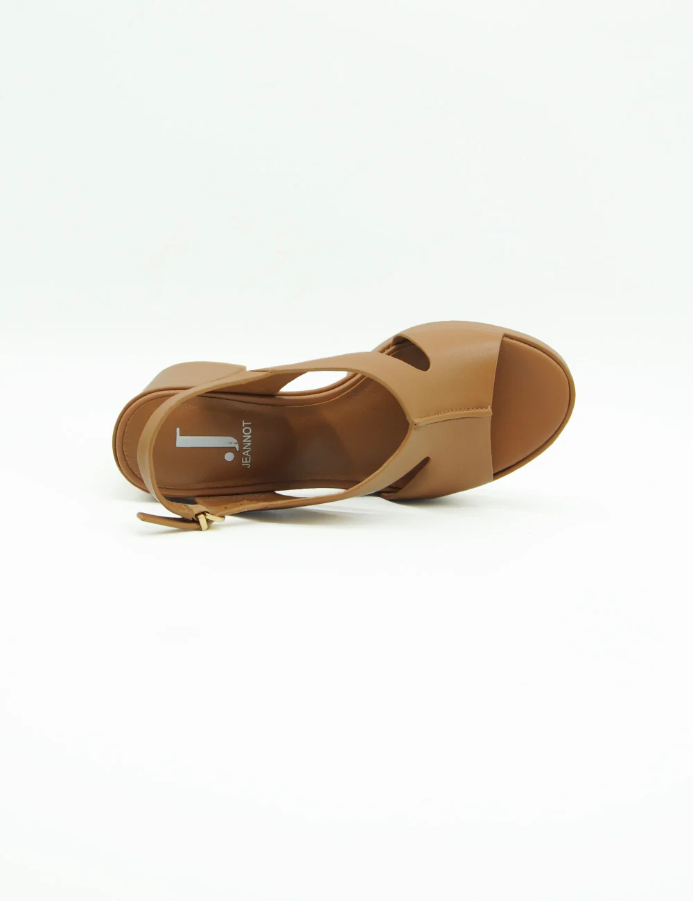 Jeannot Sandalo Cuoio, sandalo platform realizzato in nappa sagomata a taglio vivo con cinturino alla caviglia. Platform rivestito in pelle. Sottopiede in pelle e fondo in gomma.