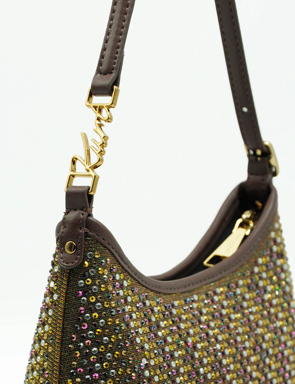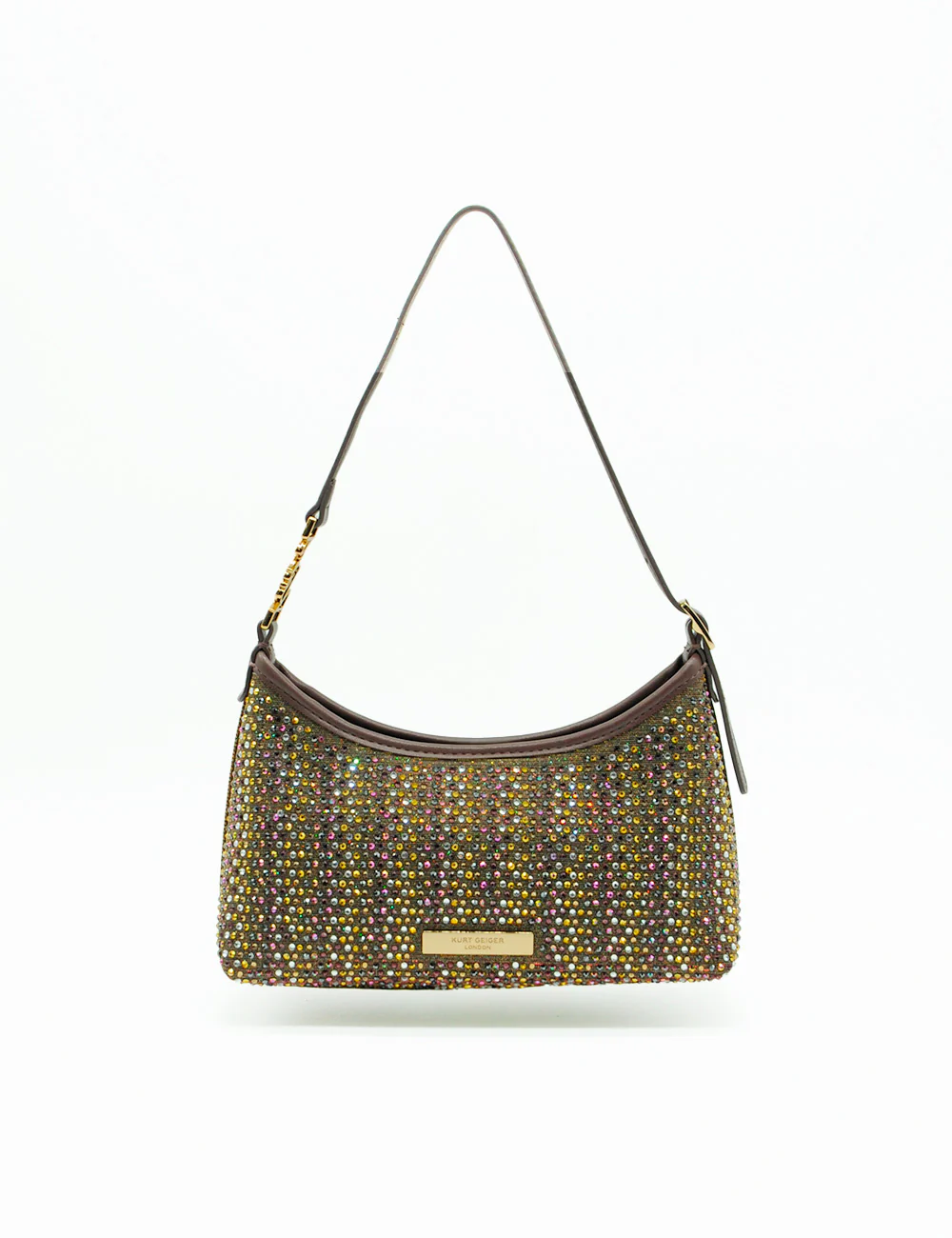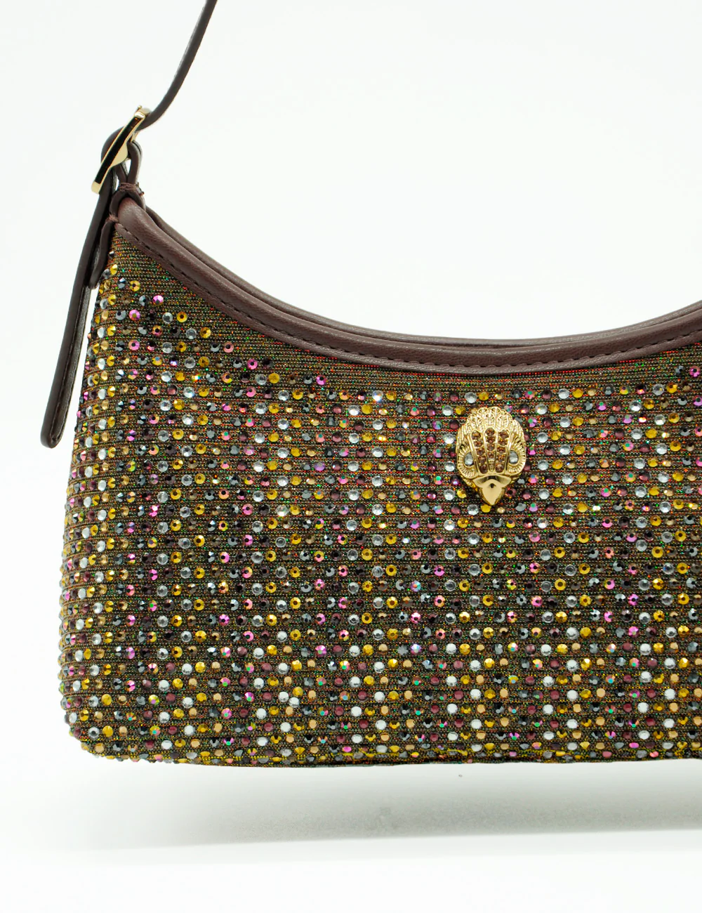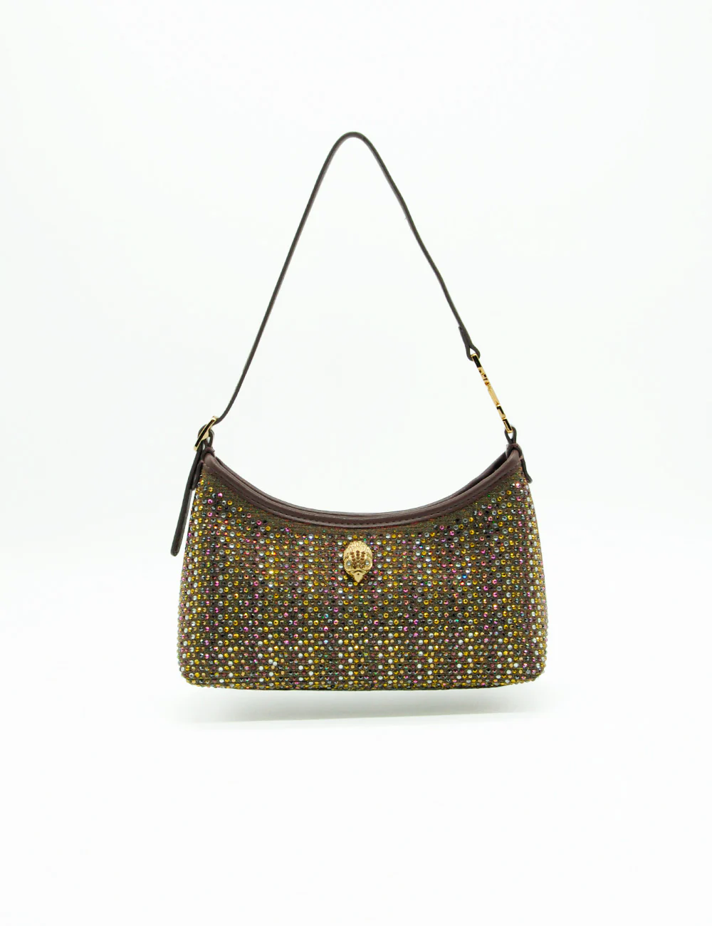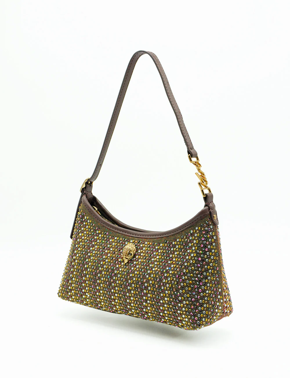Realizzata con base in tessuto tecnico bronzo interamente ricoperta da strass multicolore (sfumature oro, giallo, rosa, viola, verde, argento e iridescenti), questa borsa emana un bagliore magico sotto ogni luce. Il dettaglio iconico Kurt Geiger – placca centrale a forma di conchiglia/eagle head in metallo dorato incastonata con cristalli – aggiunge un tocco di heritage british luxury.