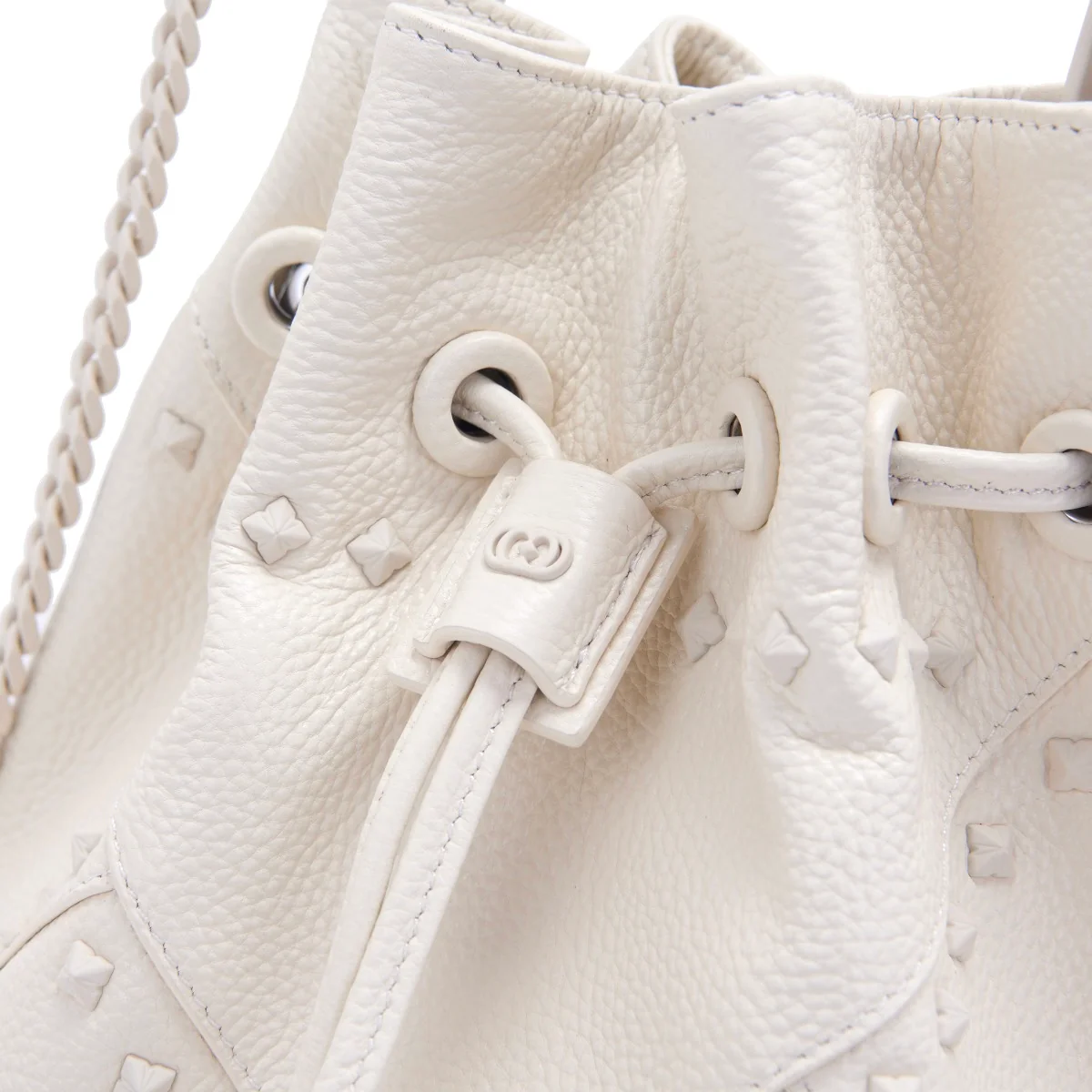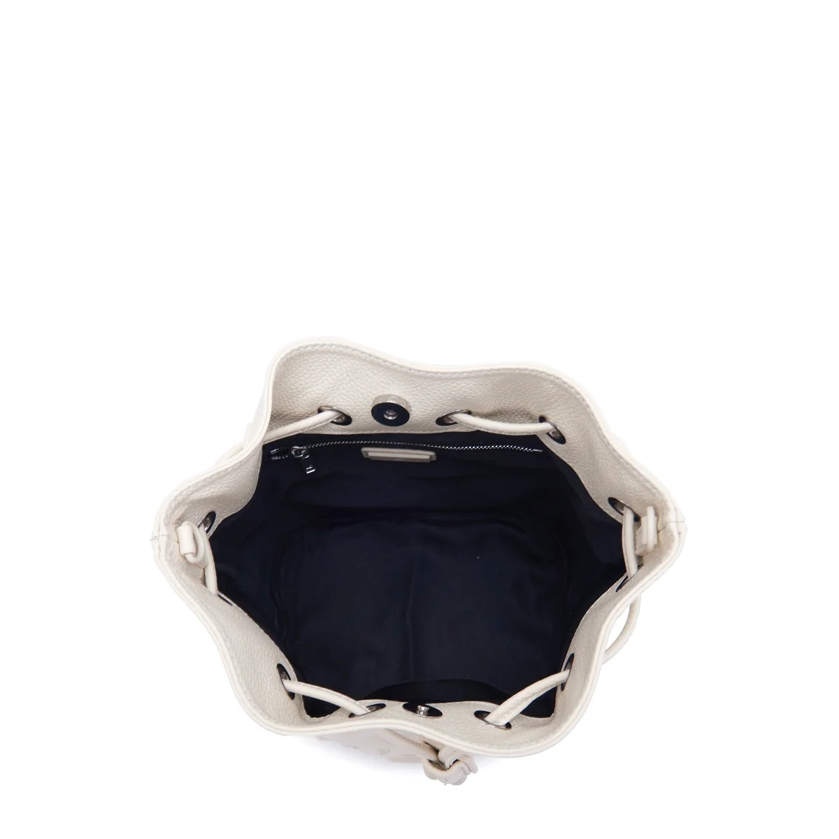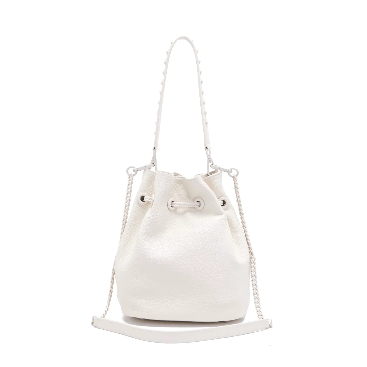 Secchiello in pelle martellata con borchie in tinta applicate lungo le spezzature, tracolla e manico rimovibile. Dimensioni 21x15x25 cmID Prodotto :141P MA 164 TBL AVORIOSKU : MA-164I
