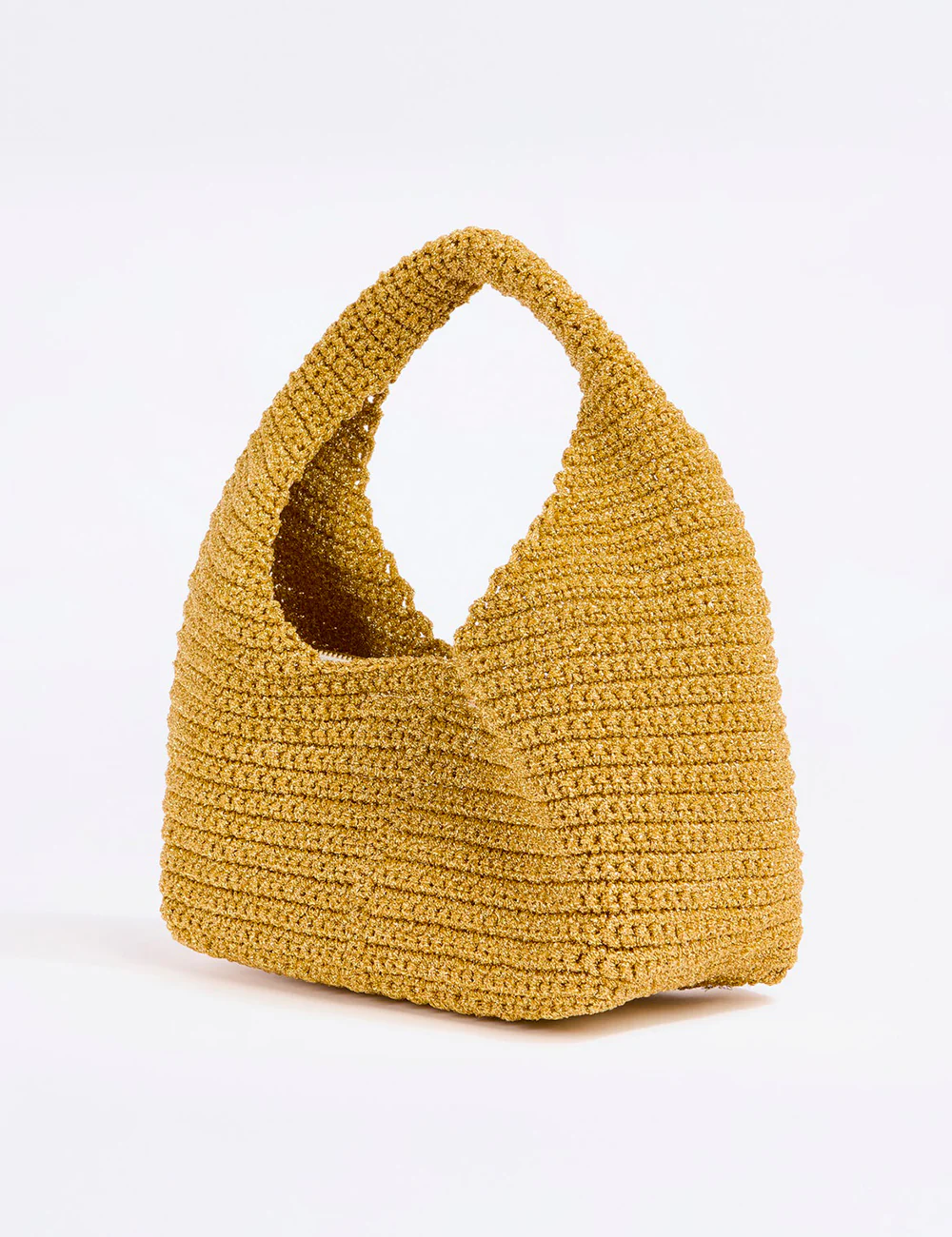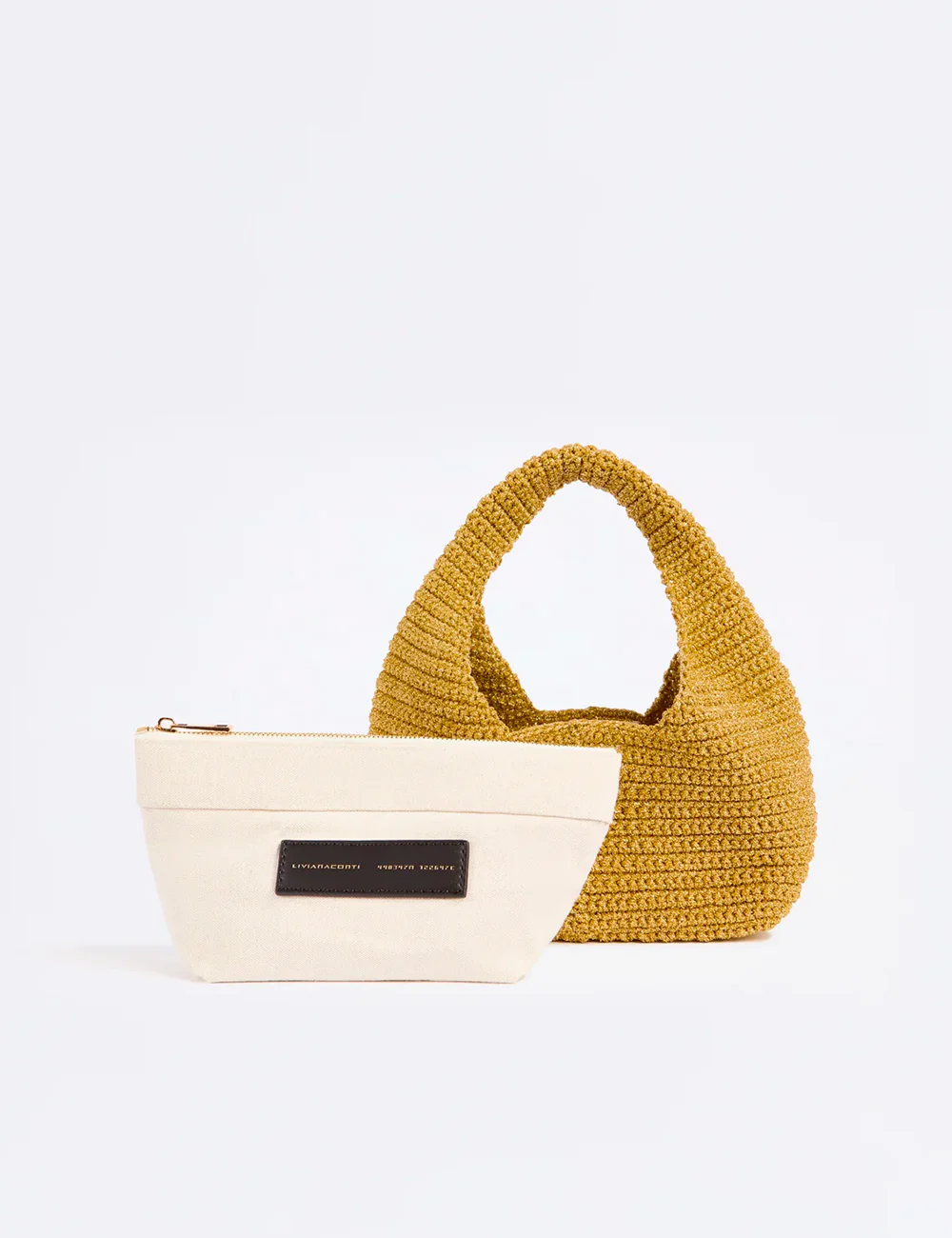 Liviana Conti Mini Hobo Oro, piccola hobo bag in lurex intrecciata a mano, con pouch interna in canvas estraibile, chiusura magnetica.