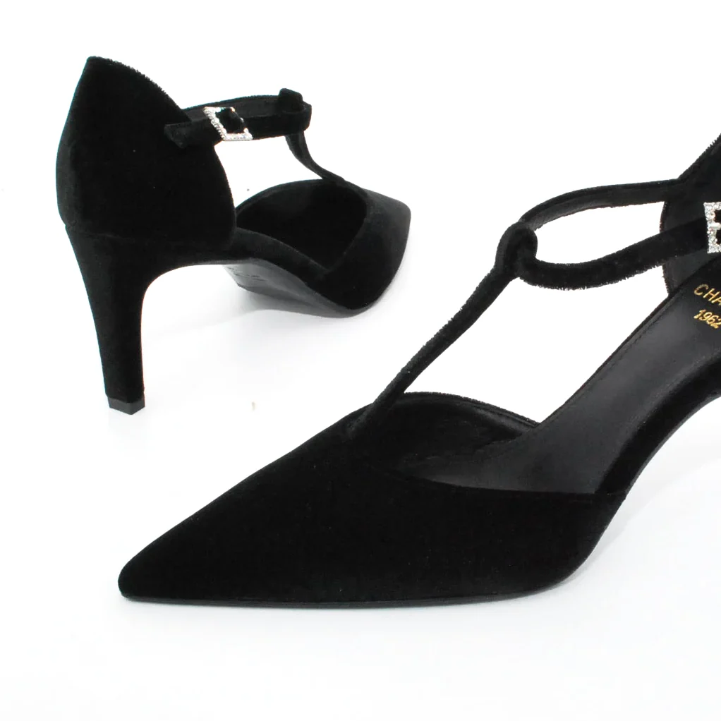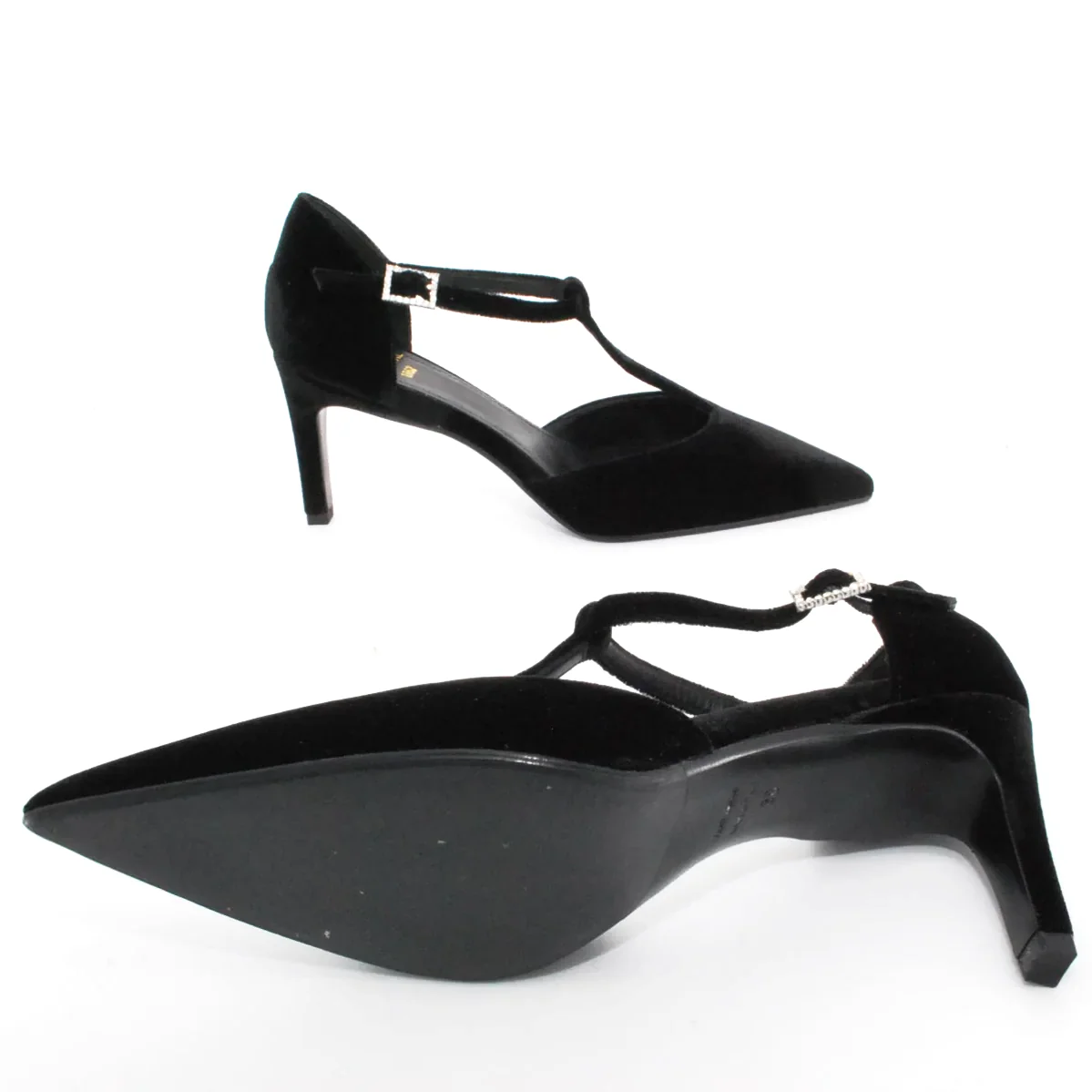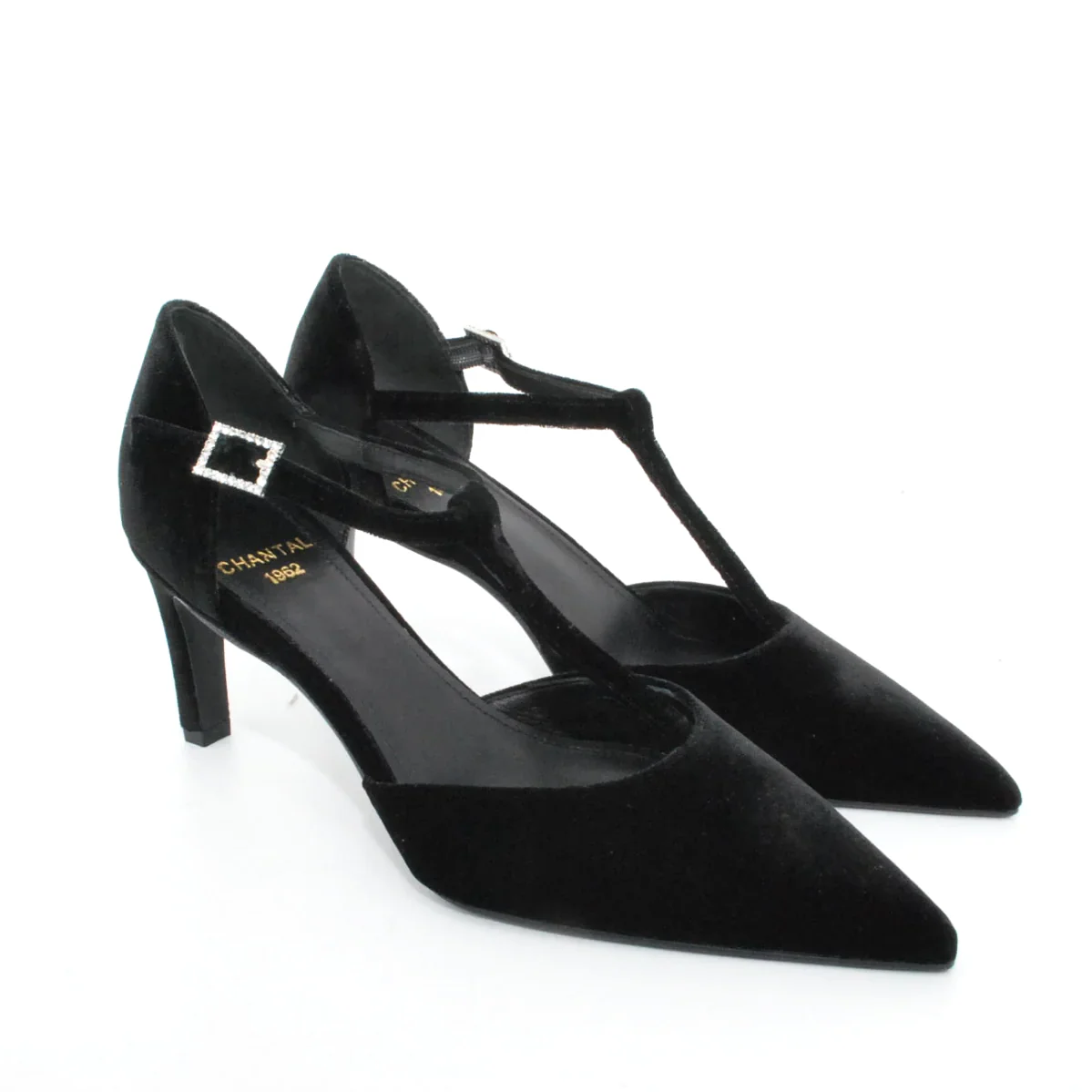Tomaia in velluto Fodera in pelle Soletta in pelle Suola in cuoio e gomma Tacco rivestito in velluto Cinturino regolabile con fibbia Altezza tacco 80 mm Sotto tacco in gomma Qualitร Artigianale Italiana