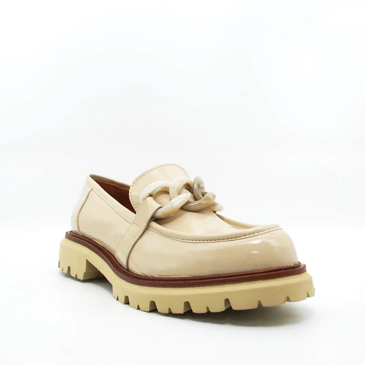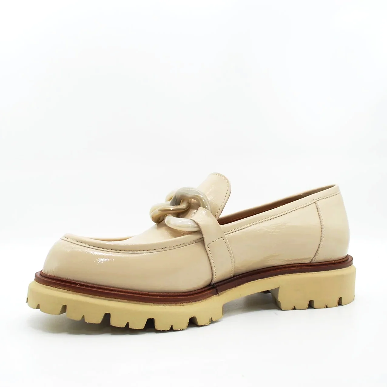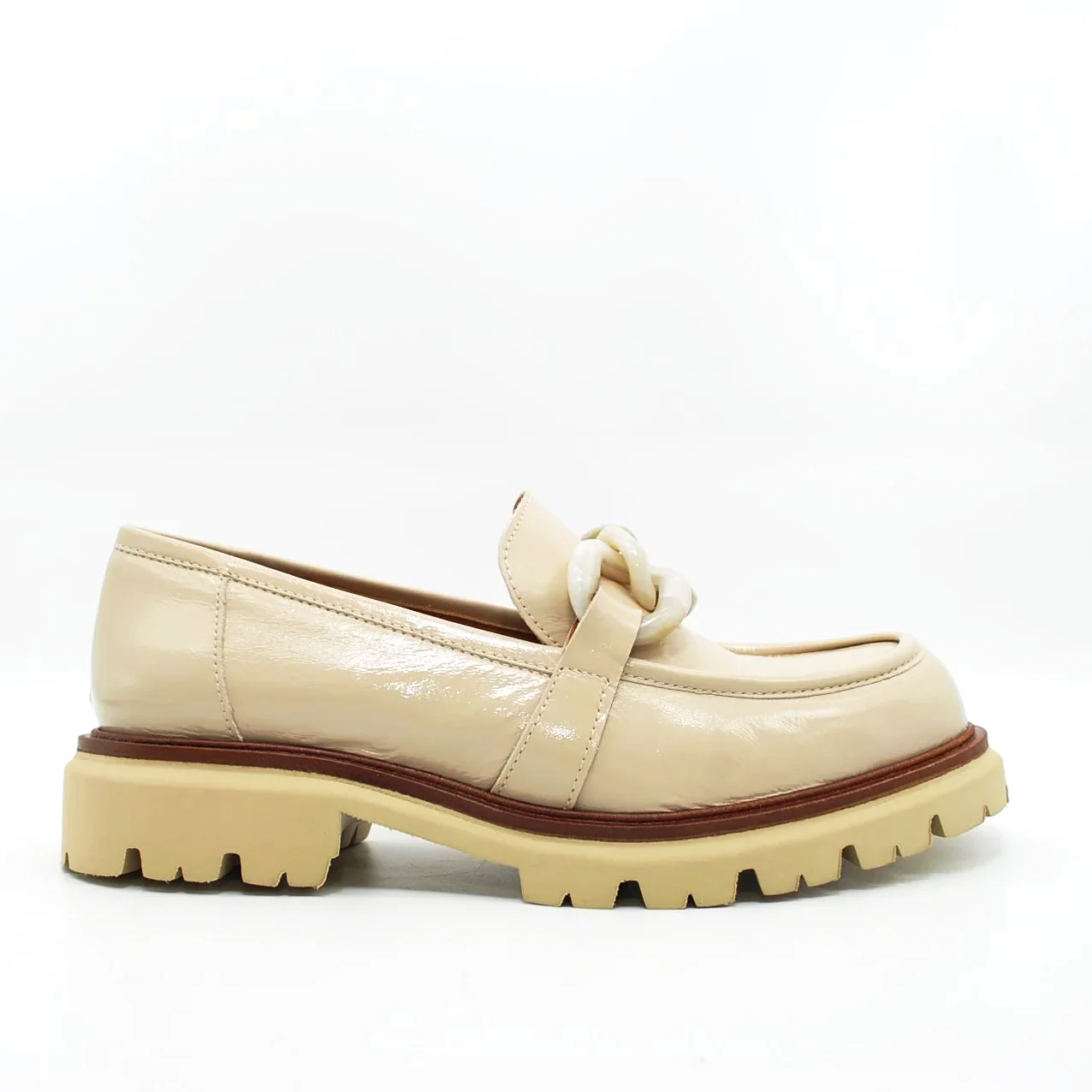 Mocassino in pelle verniciatafodera in pelle suoletta imbottita in pelle suola in gomma extralight 30 mmapplicazione catena fatta a mano da artigiani italiani