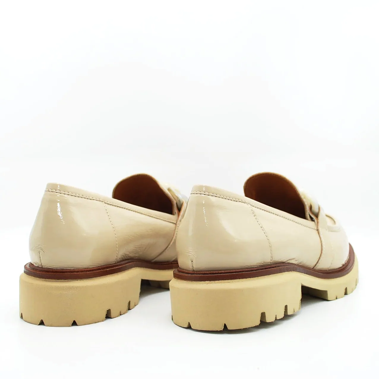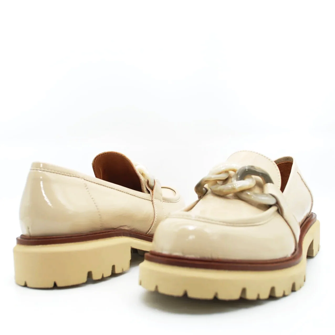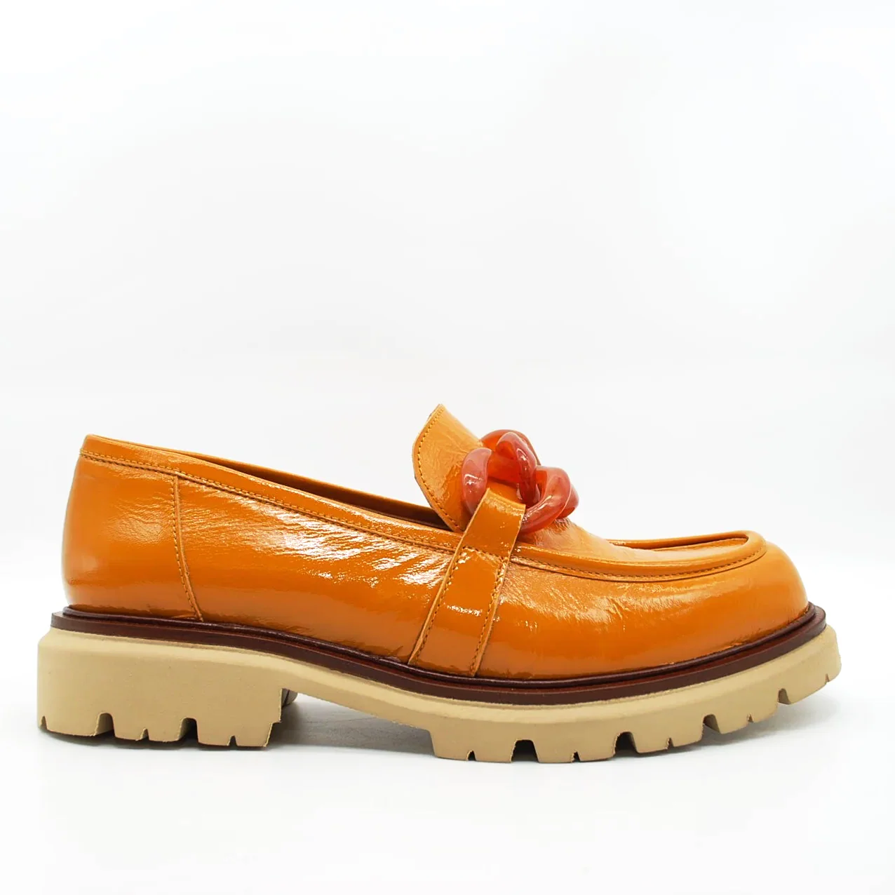 Mocassino in pelle verniciatafodera in pelle suoletta imbottita in pelle suola in gomma extralight 30 mmapplicazione catena fatta a mano da artigiani italiani
