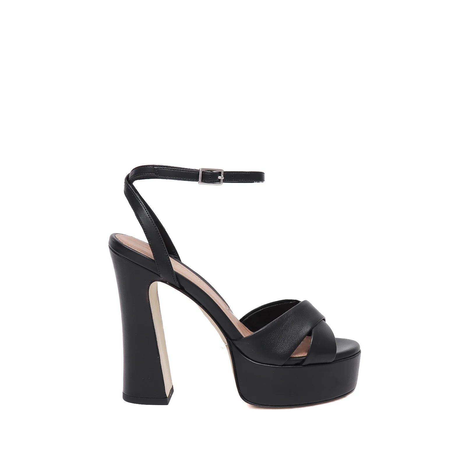 Sandalo in pelle nera con cinturino alla caviglia Fodera in pelleSuola in cuoioTacco 13 cm , plateau 3 cmCalzata regolareCOLORE : NeroProdotto in ItaliaID Prodotto : 2593 NAPPA NERASKU : 2593-N