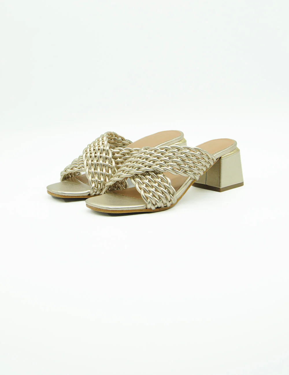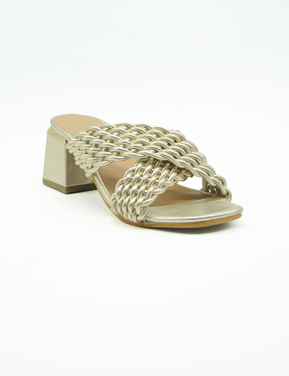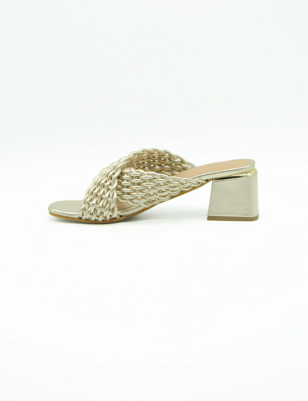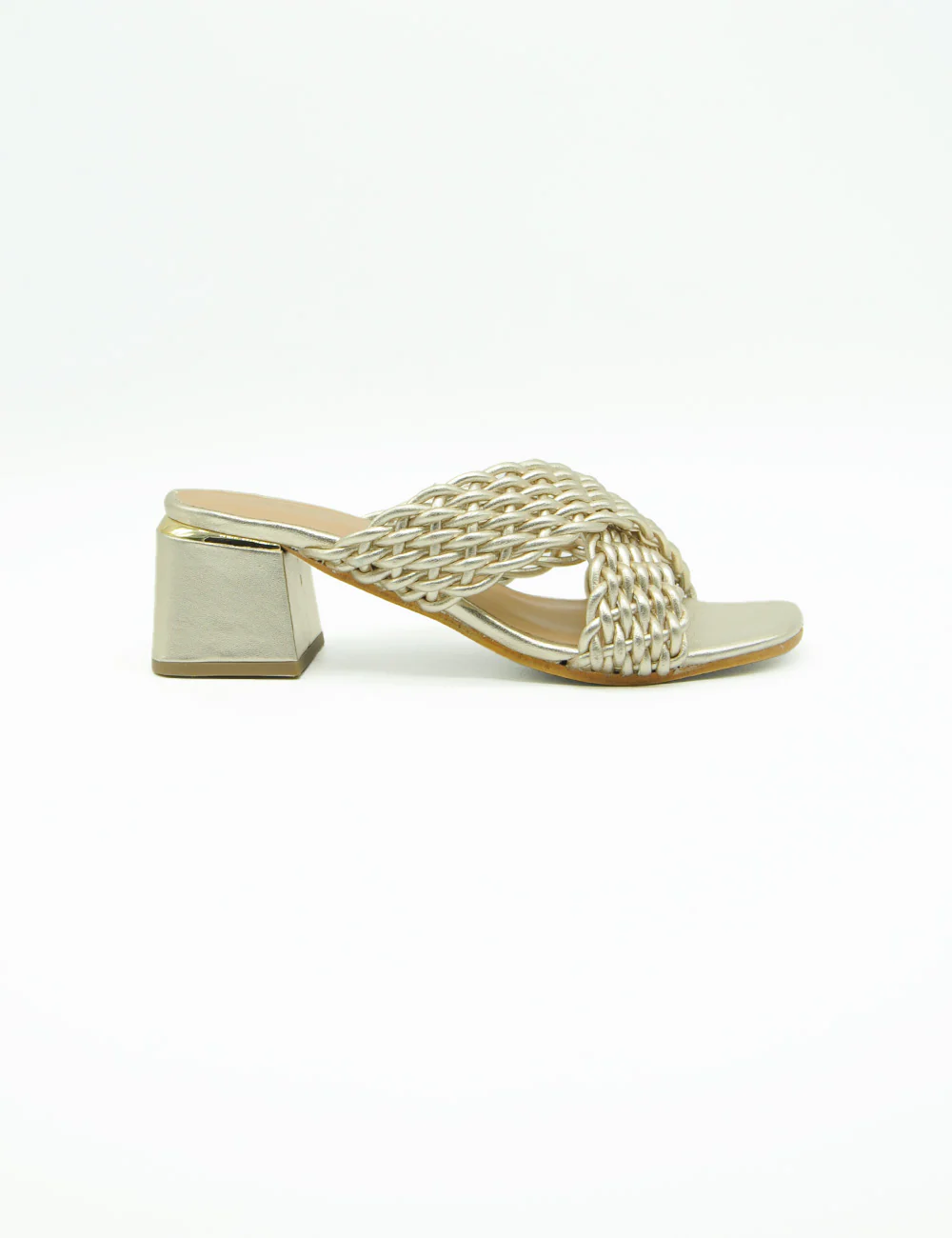 Parodi Sandalo Oro, sandalo in morbida pelle a fasce incrociate lavorate ad intreccio. Sottopiede in pelle e fondo in vero cuoio. Tacco altezza 6 cm con inserto in metallo effetto oro.