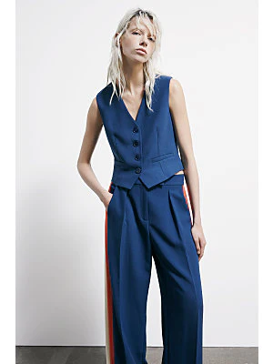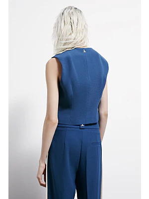 Gilet in twill tecnico con fodera a contrasto colore che interpreta il tailoring moderno e sperimentale della donna Patrizia Pepe. Minimale e sofisticato, si abbina ai pantaloni fluidi con bande a contrasto per un total look distintivo.