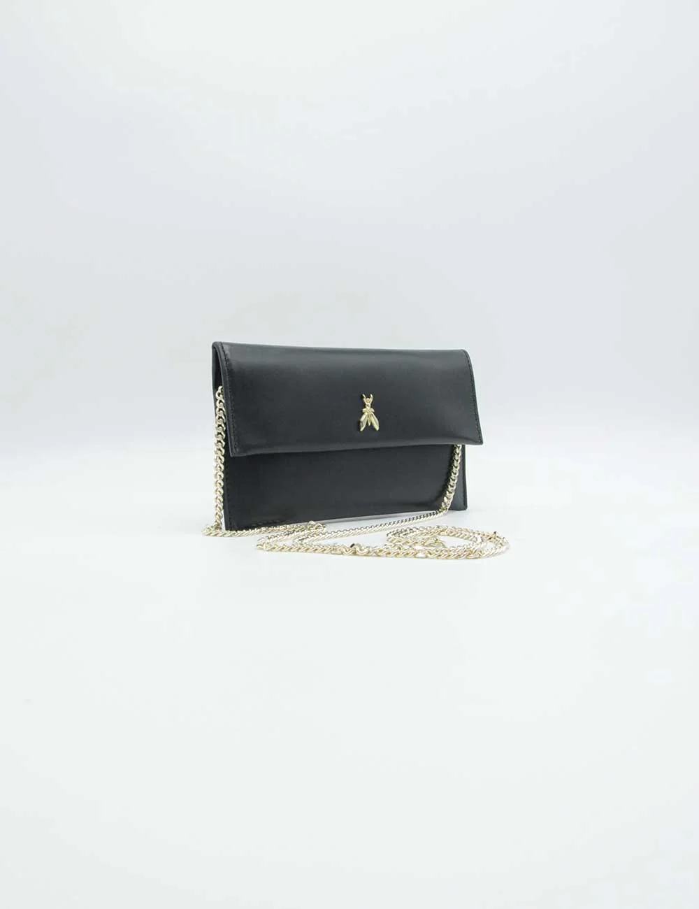Patrizia Pepe Pochette Small Black Light Gold, pochette in pelle di Vitello liscio con applicazione Fly 35mm. Tracolla in catena staccabile, fodera maxilogo. Galvanica Light Gold