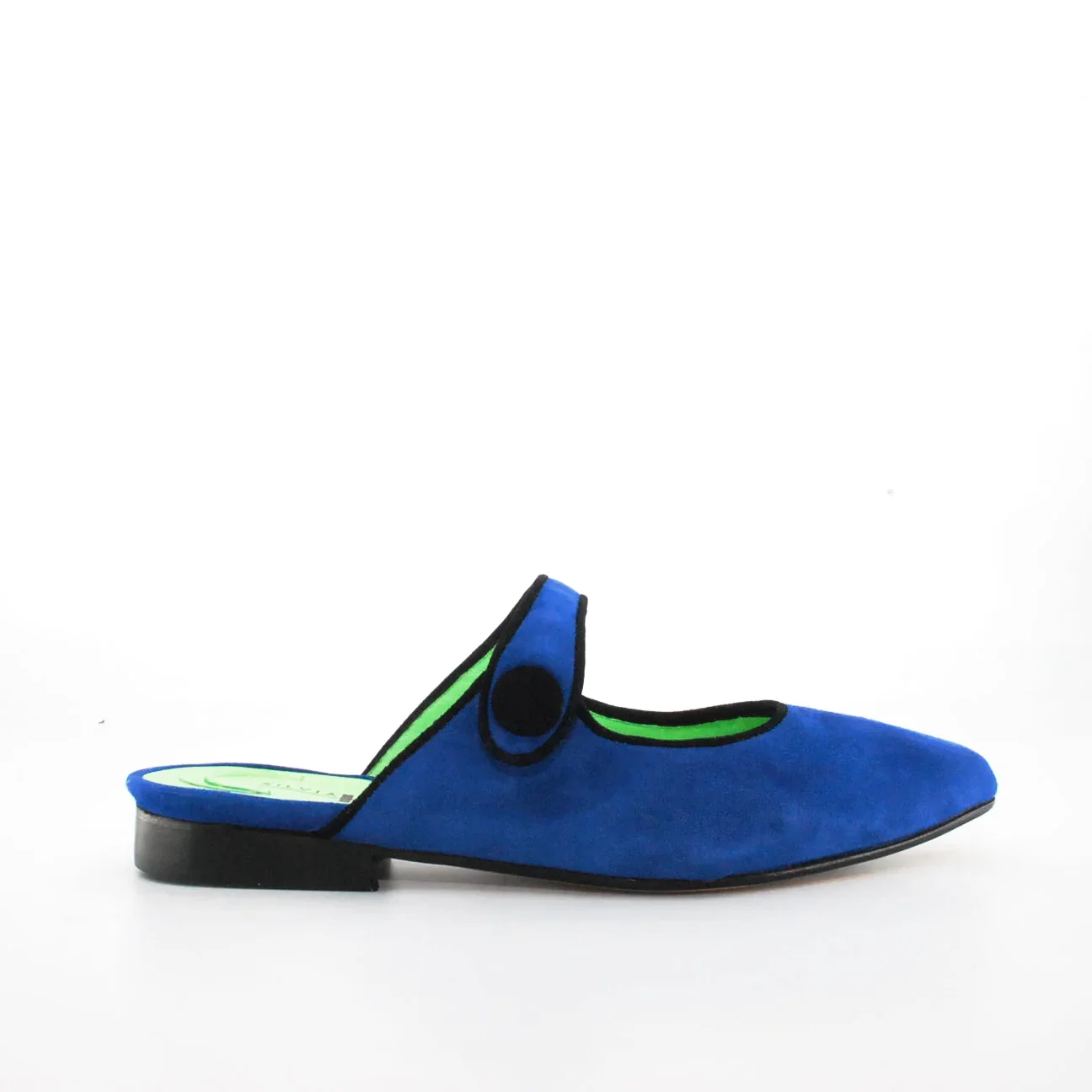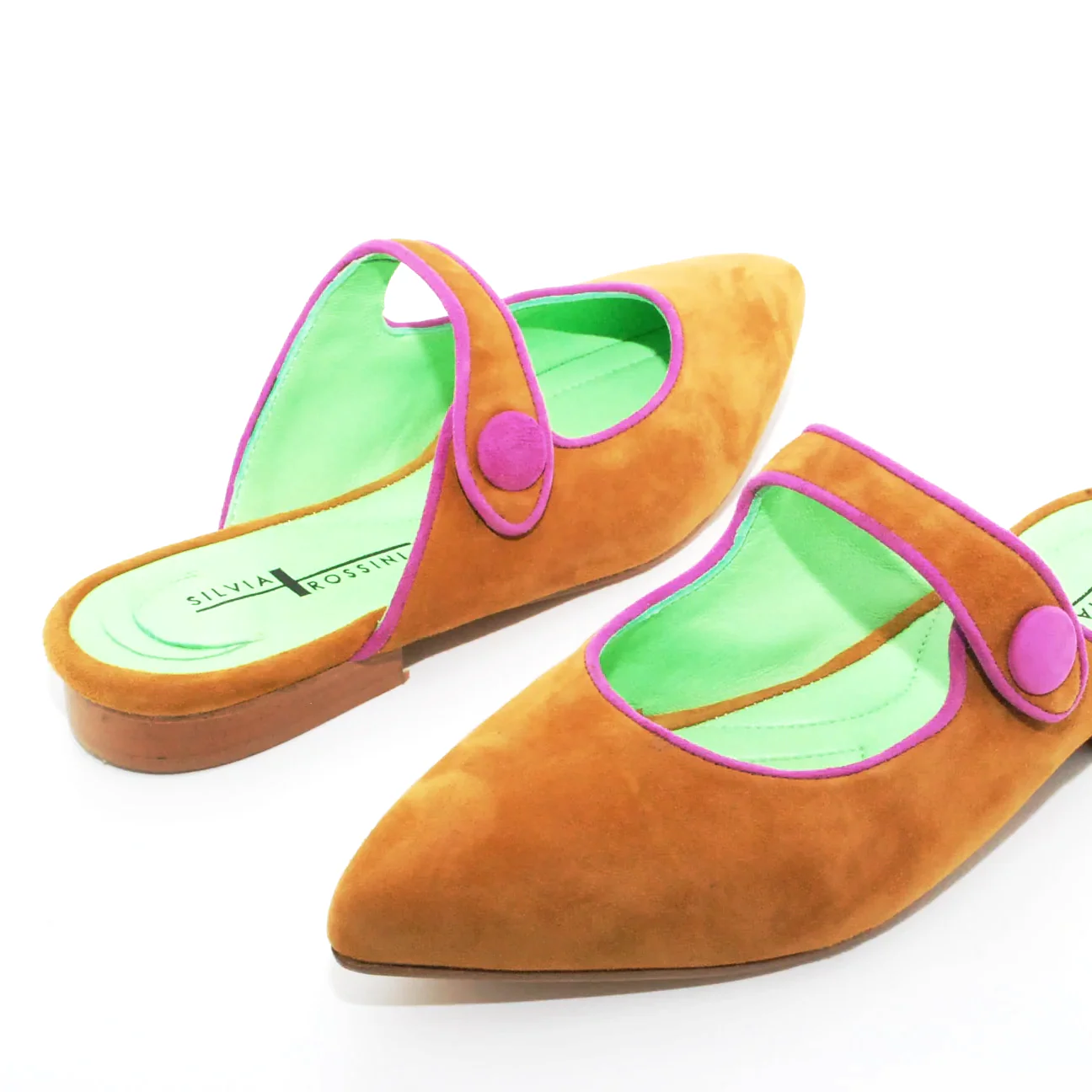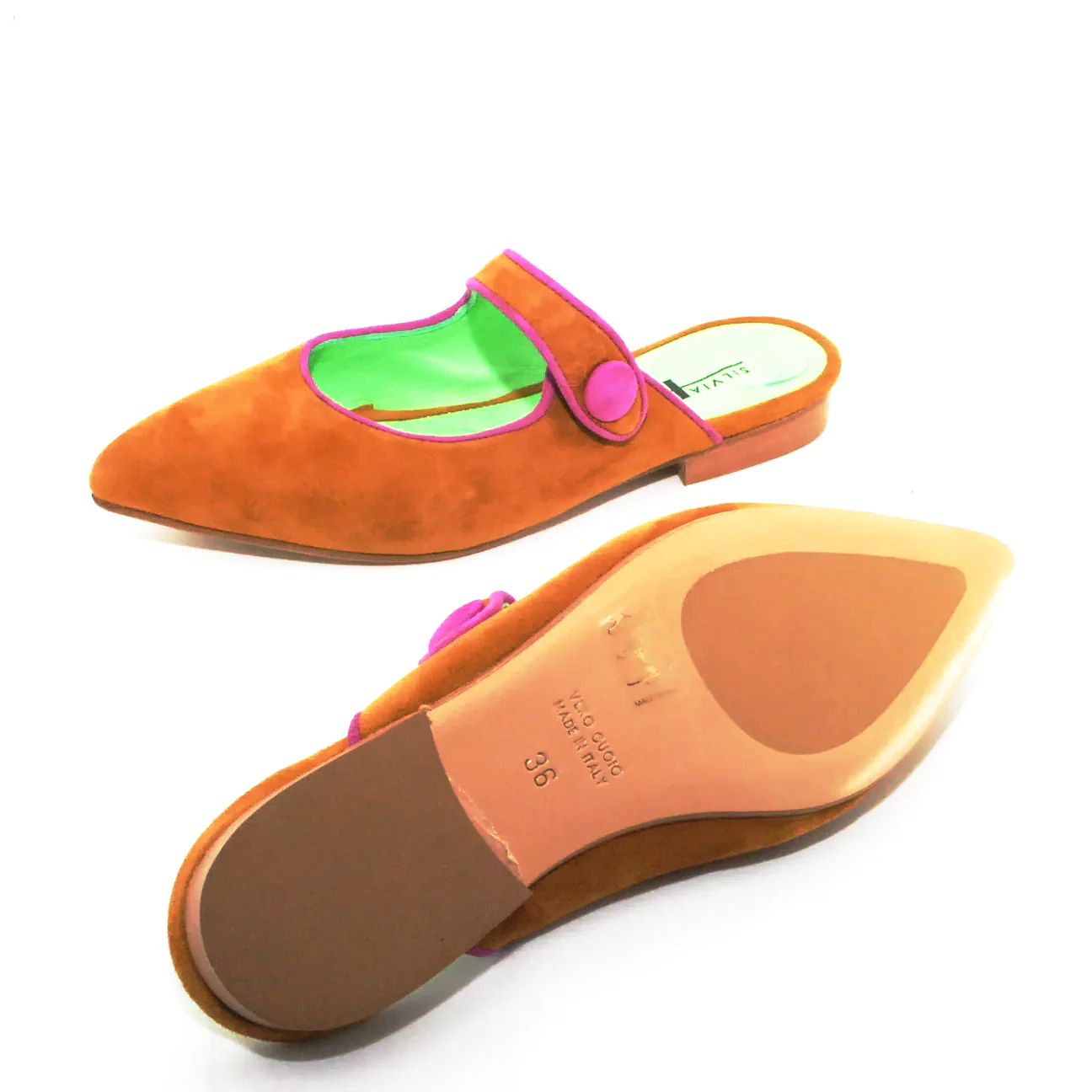 Tomaia in camoscio Fodera in pelle Soletta in pelle Listino sul collo del piede regolabile con elastico Suola in cuoio con antiscivolo in gomma Applicazioni: Bottone in camoscio Altezza tacco 25 mm Sotto tacco in gomma Qualitร artigianale Italiana