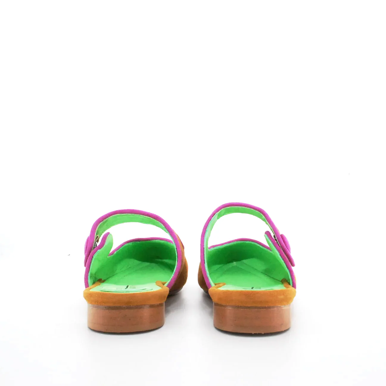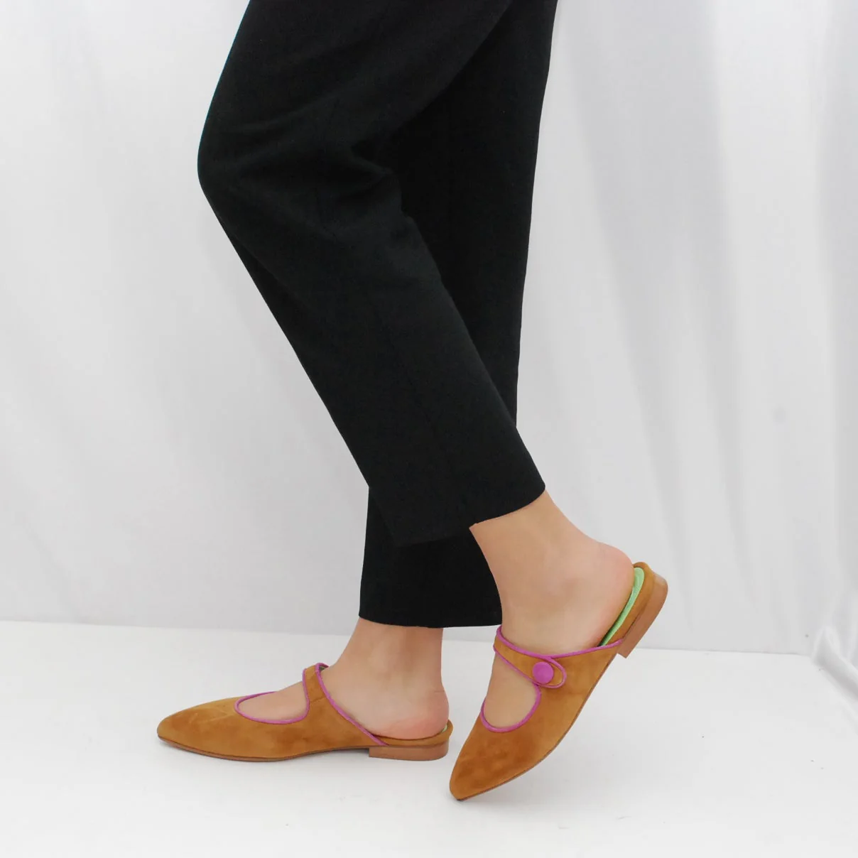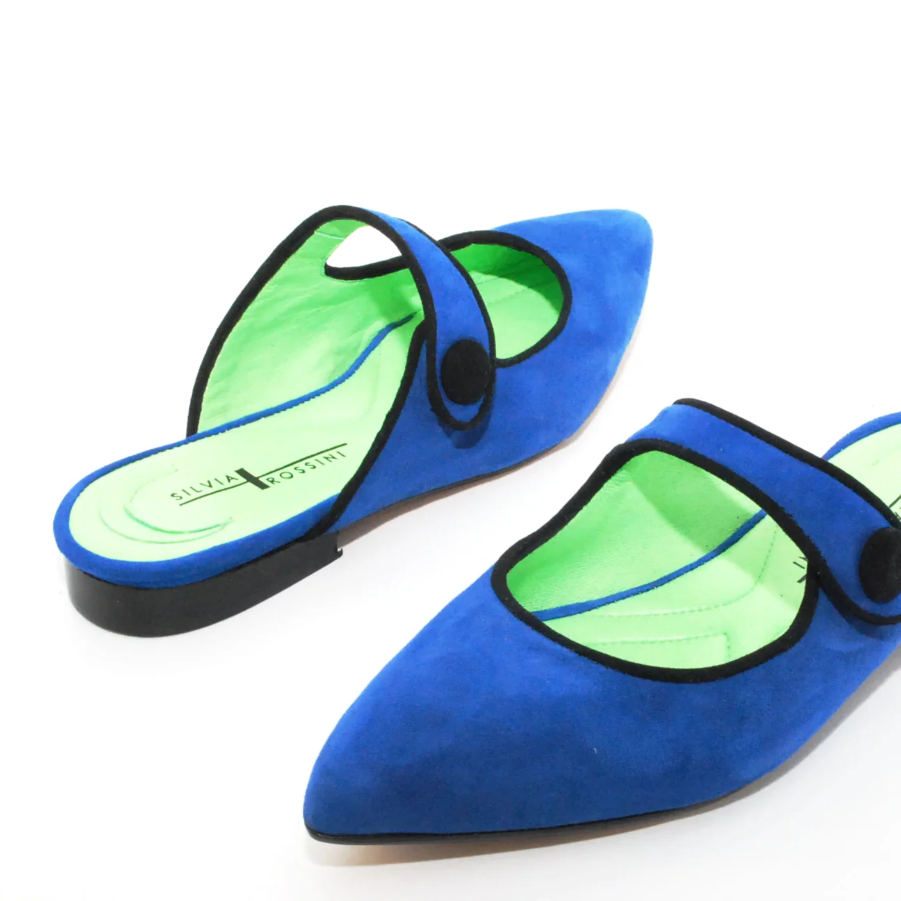 Tomaia in camoscio Fodera in pelle Soletta in pelle Listino sul collo del piede regolabile con elastico Suola in cuoio con antiscivolo in gomma Applicazioni: Bottone in camoscio Altezza tacco 25 mm Sotto tacco in gomma Qualitร artigianale Italiana