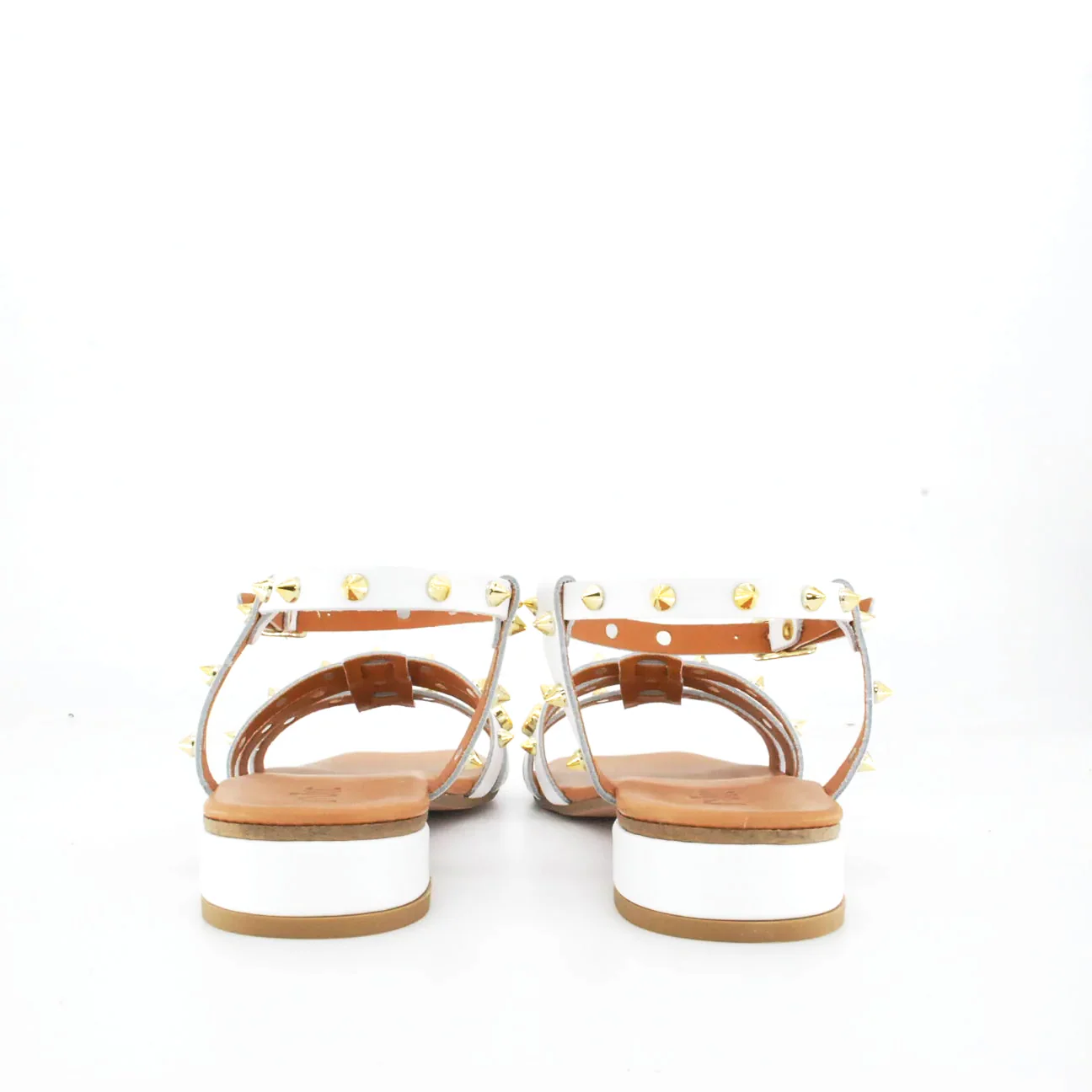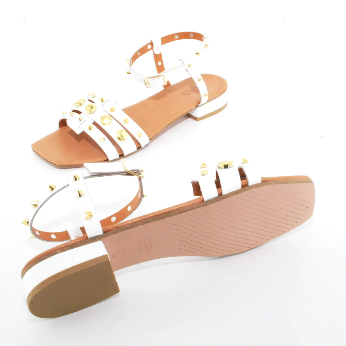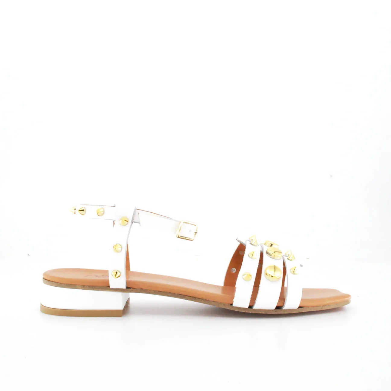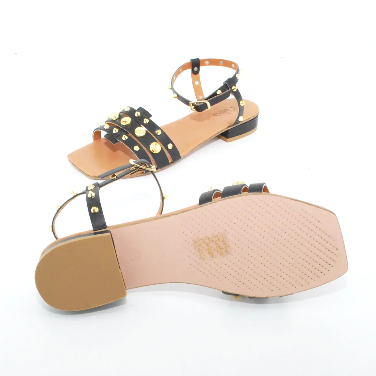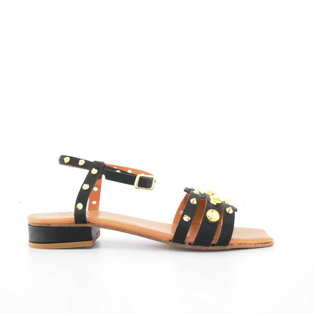 Tomaia in pelle Fodera in pelle Soletta in pelle Chiusura regolabile con fibbia Applicazioni borchie dorate Suola in cuoio Tacco rivestito in pelle Altezza tacco 25 mm Sotto tacco in gomma Qualitร artigianale Italiana per NIKA