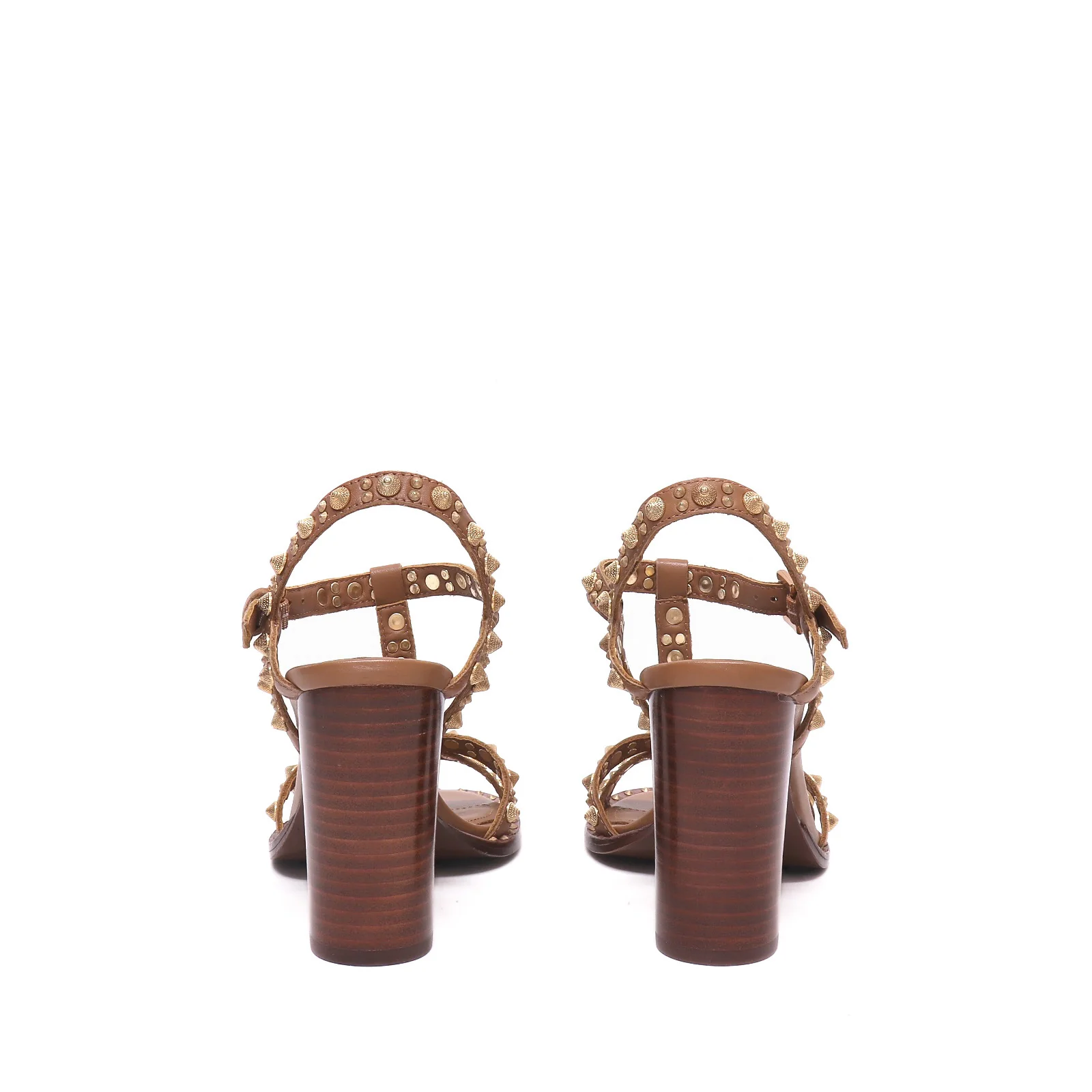 Sandalo donna in pelle cuoio e borchie oroFodera in pelleSuola in gomma Tacco 10 cmCalzata regolareID Prodotto :KISS03 SOFTBRASIL CINNA/GOLDSKU : KISS-C