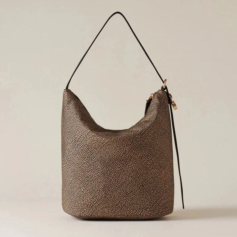 Tessuto riciclato stampa op Dettagli in vitello Fodera in tessuto Chiusura con zip metallo e tirazip a vite Tracolla in vitello regolabile con ponticello e lucchetto tondo a vite in metallo Una tasca interna aperta Metallerie oro chiaro opaco Applicazioni: dettagli in metallo dorato Altezza: 30 cm Larghezza: 27 cm Profonditร : 15 cm Confezione: l’articolo […]