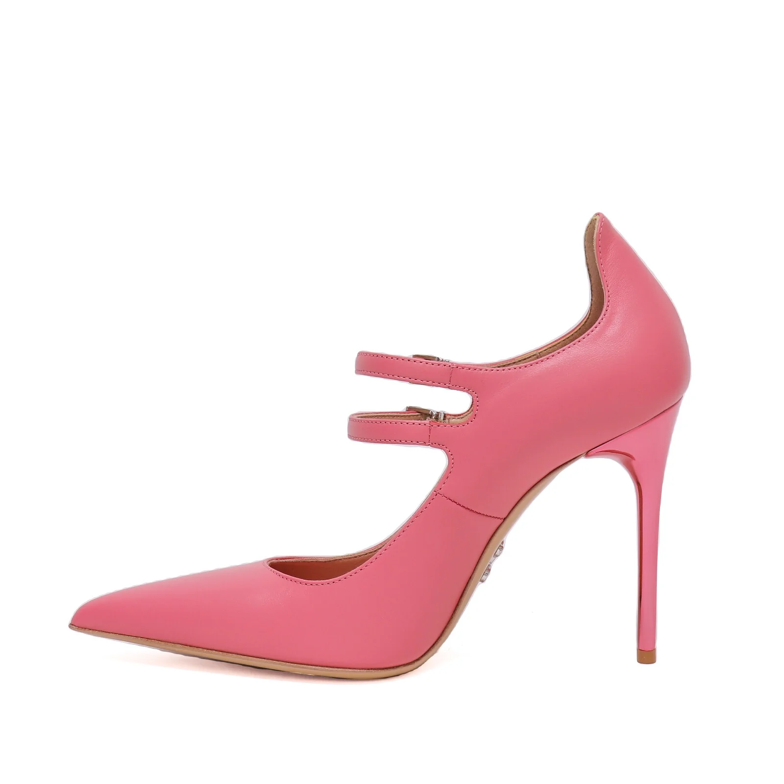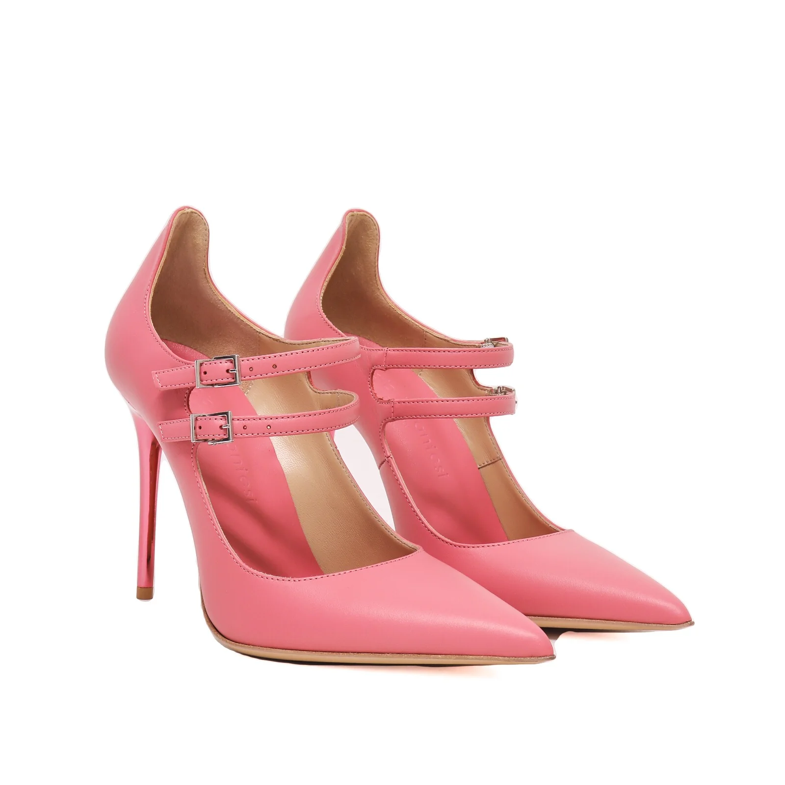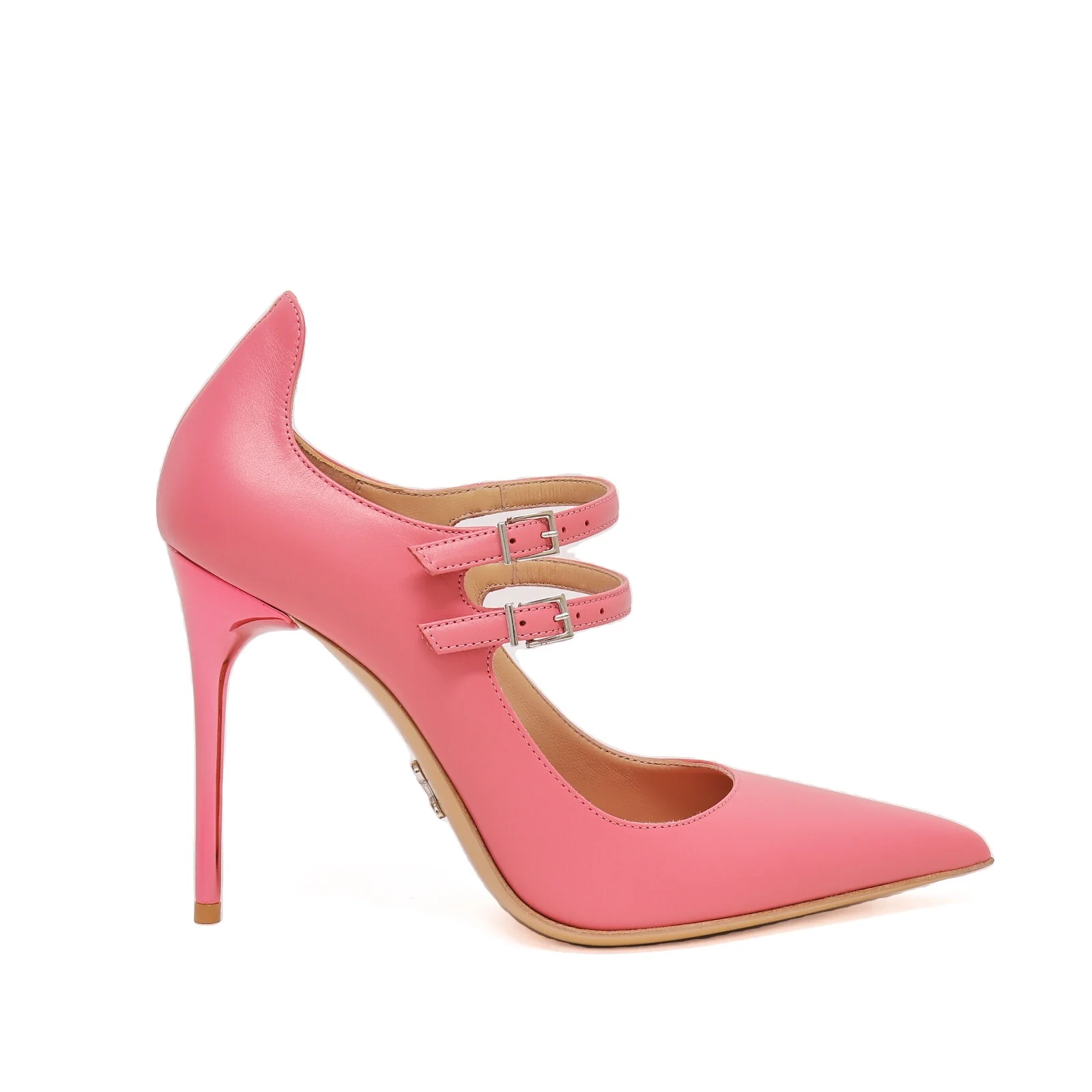 Decolletรฉ in pelle rosa, tacco cromato rosa e cinturini regolabili.