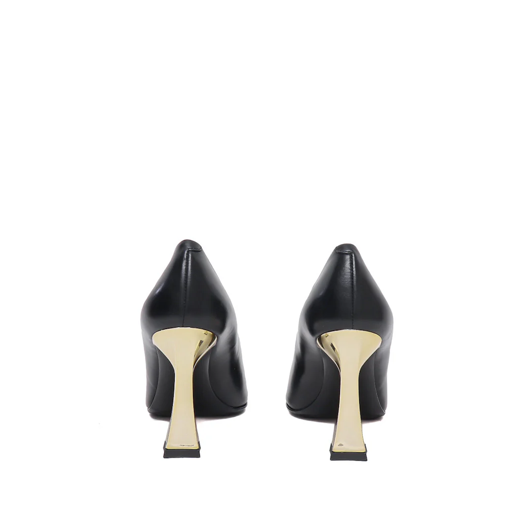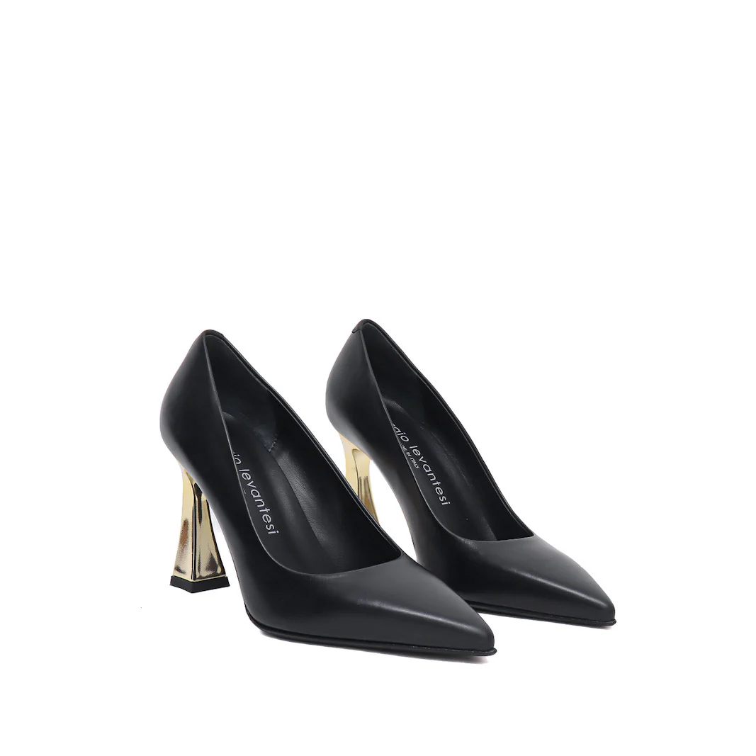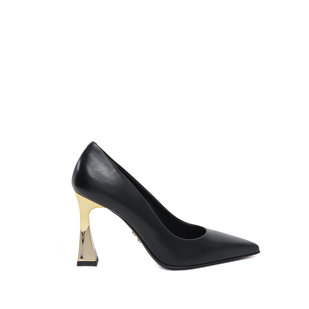 Decollete in pelle nera e tacco cromato oro