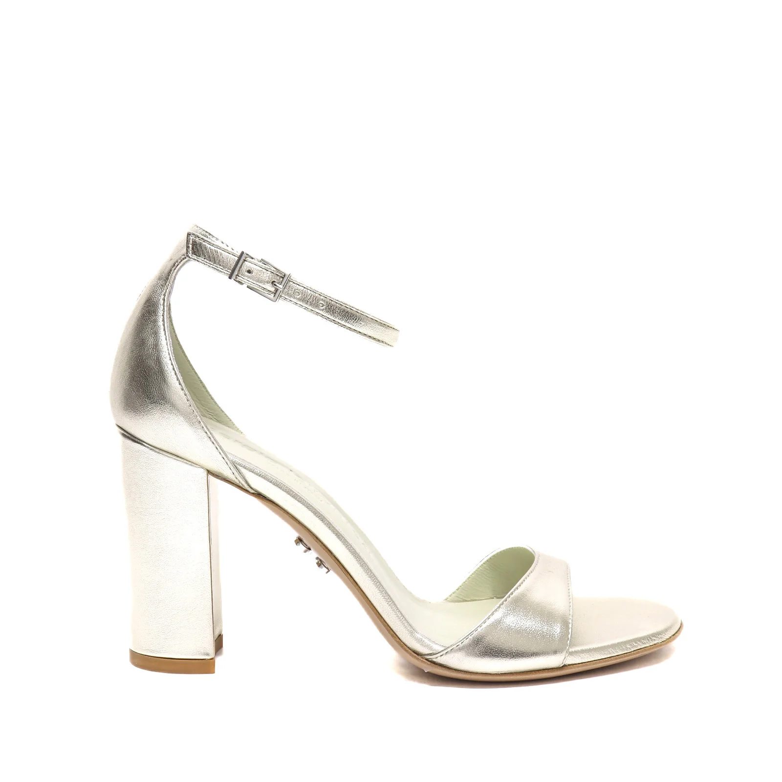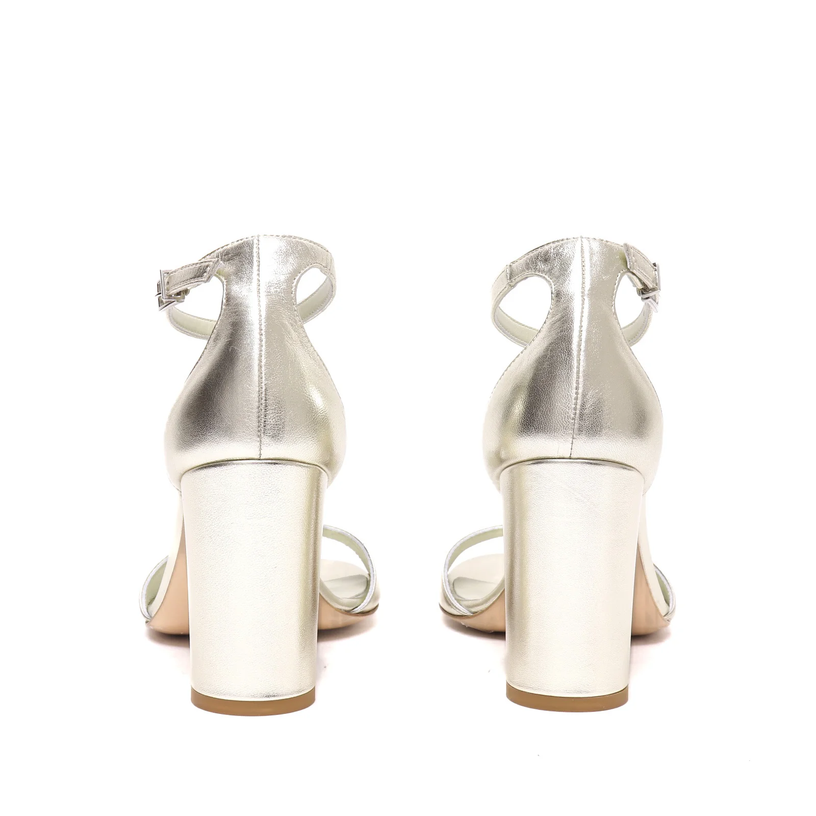 Sandalo donna in pelle platino, con tallone e cinturino alla caviglia